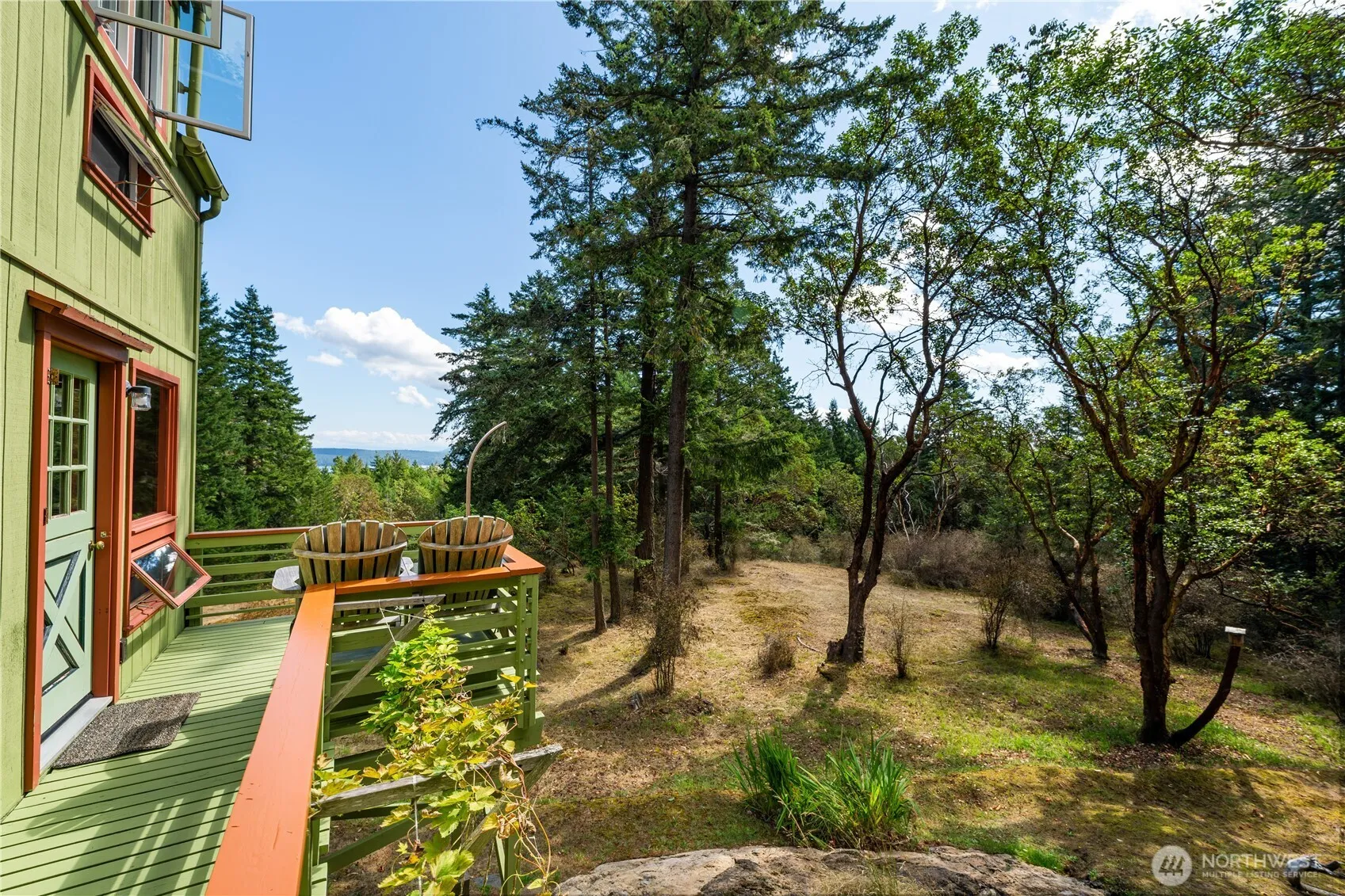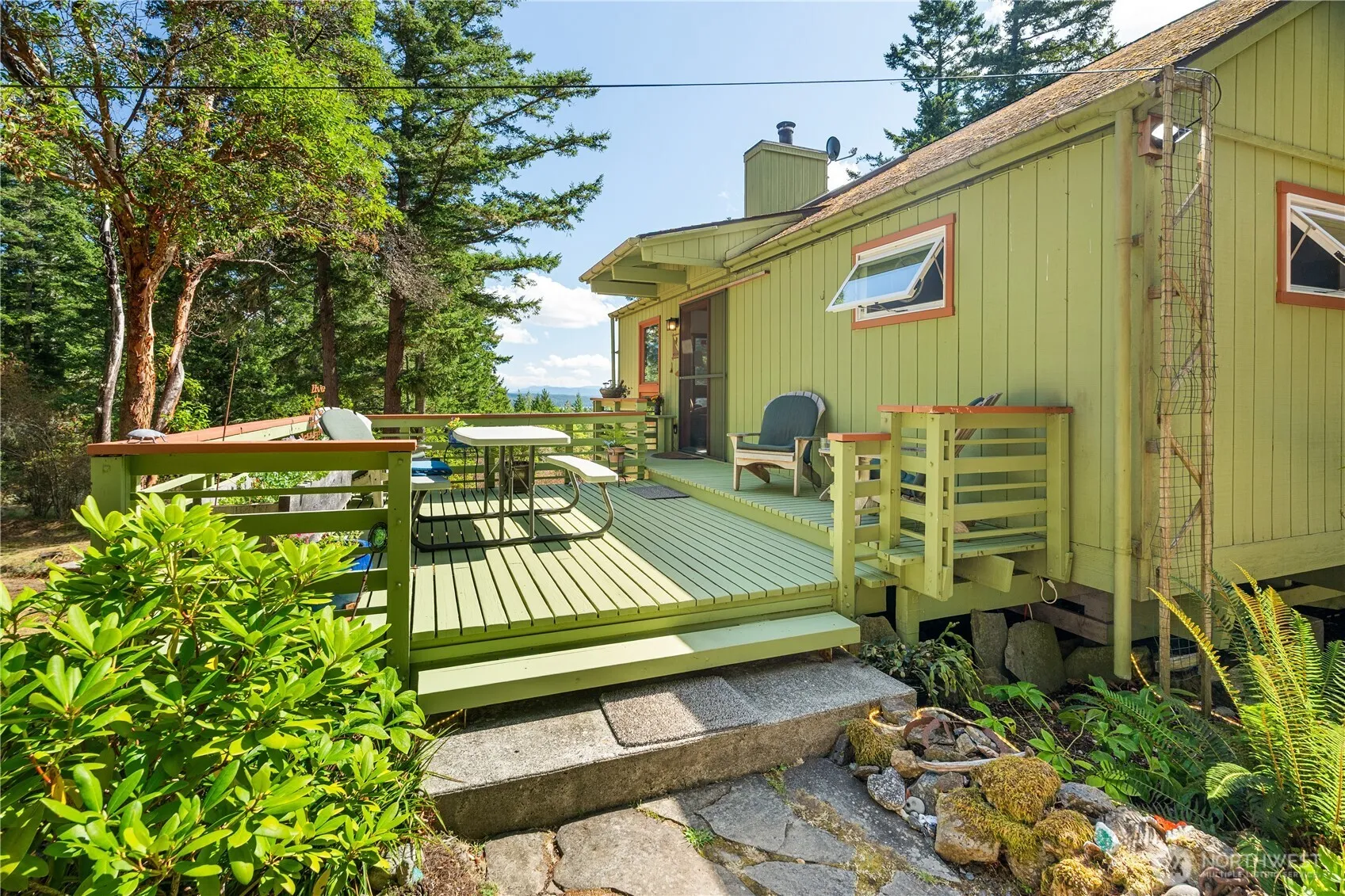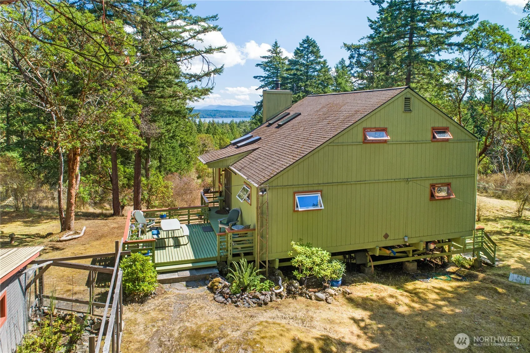 Discover this ultra-private retreat at the end of a quiet road, surrounded by mossy rock knolls and offering stunning views of Mt. Baker. Set in a magical forested landscape with madrona and fir trees, on 5.94 acres +/-. This 1,646± sq ft home features a main-floor primary bedroom and bath, a spacious loft with office area, half bath, and open-concept bedroom. The light-filled great room boasts skylights, exposed beams, oak hardwood floors, and a cozy wood stove. Outdoor amenities include a private summer shower, firepit, carport with garden space, and a detached shop. A like-new 2019 Springdale travel trailer is also included—ideal for guests or rental income. Shown by appointment only.