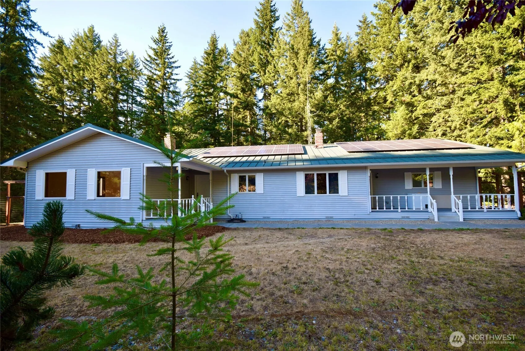 Unique custom home on 4.8 acres of forest & yard with wonderful mountain views. 2 bedrooms & extra large rec room with closet, which could be additional bedroom. Living room & dining room with wood fireplace, kitchen & family room with wood stove, laundry room & 3 decks are all on the main level. House and extra garage/shop have metal roofs. House has solar panels that sells to the grid, providing very inexpensive electricity. Small stable/shed can house 2 horses. There is a garden space behind the stable. Lots of options for use. Very private and quiet property.