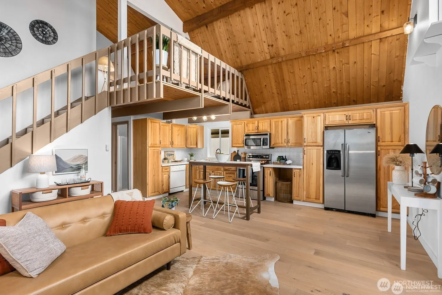 Priced to sell! Opportunity awaits in the gated Camaloch golf community. This unique 3BR, 2.25BA home blends rustic charm with modern updates. Soaring vaulted ceilings, abundant wood finishes, and a loft overlooking the living area create warmth and character. The primary suite includes a private 1/2 upstairs, and loft space for an office or reading nook. Major remodel in 2021 added new flooring, updated kitchen & baths, paint, new water heater, and a mini-ductless split for A/C & heat. Enjoy a huge fenced yard with Smith Lake views, plus community perks: unlimited golf, 2 seasonal pools, and a stocked fishing lake. Detached garage/shop adds flexibility.
