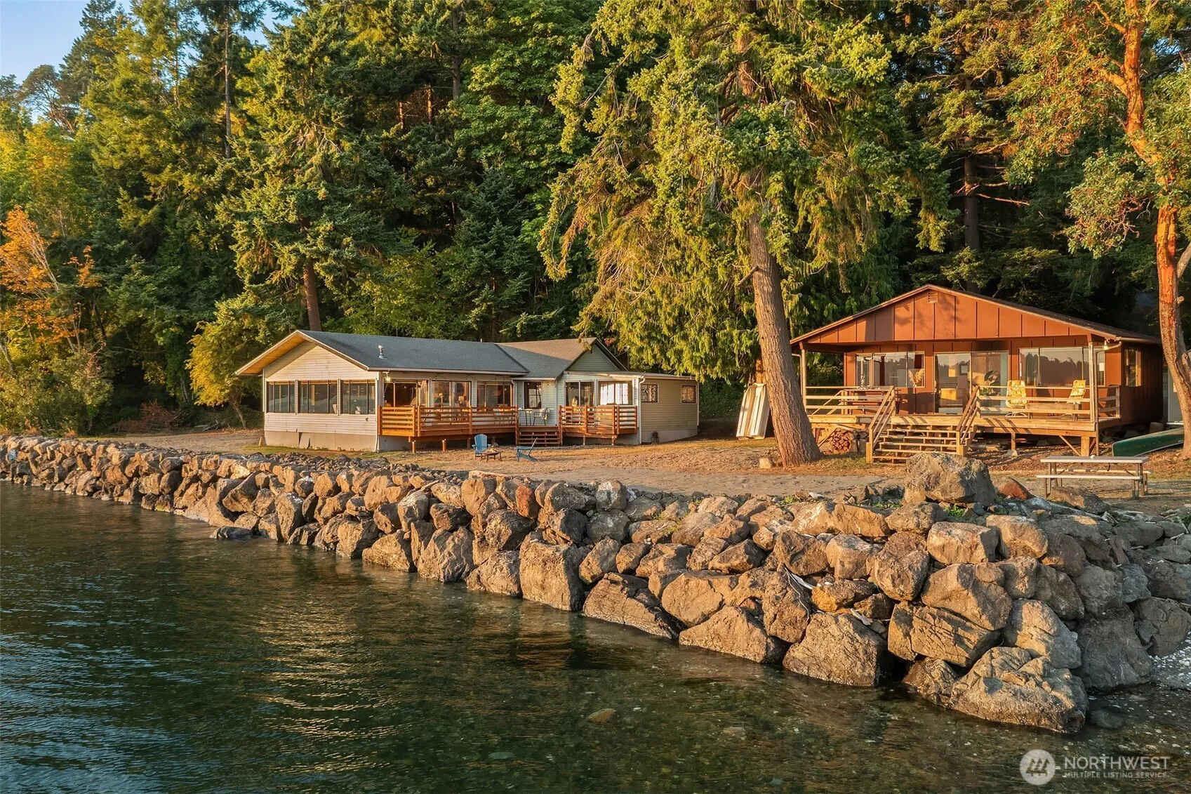 Loved by the same family for three generations, Driftwood Landing is a rare waterfront legacy on the north end of Paradise Cove. Two vintage cabins, on separate parcels, rest on two private acres with 200 feet of shoreline and sweeping southwest views down Colvos Passage—where sunsets are among the best on the island. The main home offers 1,660 sq. ft. with vaulted ceilings, walls of windows, and a new deck, while the 560 sq. ft. second home provides flexible space and a covered deck. Both cabins embrace open floor plans and timeless beach charm. Updated infrastructure includes two new septic systems, a shared well, and Comcast internet. Privacy, history, and unparalleled views combine to make Driftwood Landing a one-of-a-kind offering.
