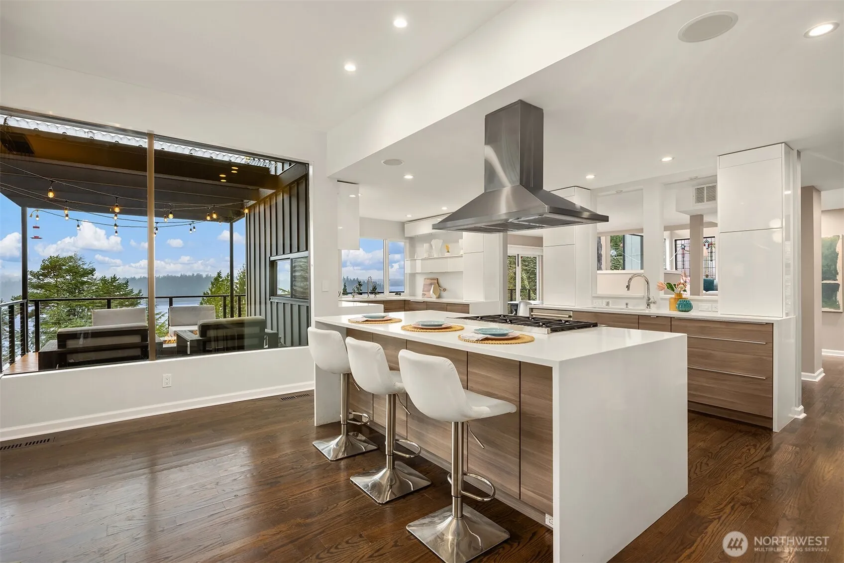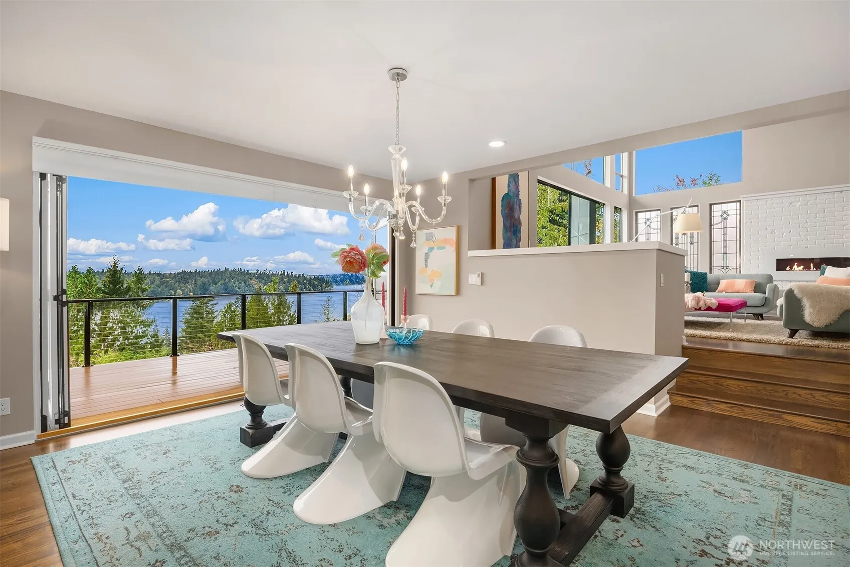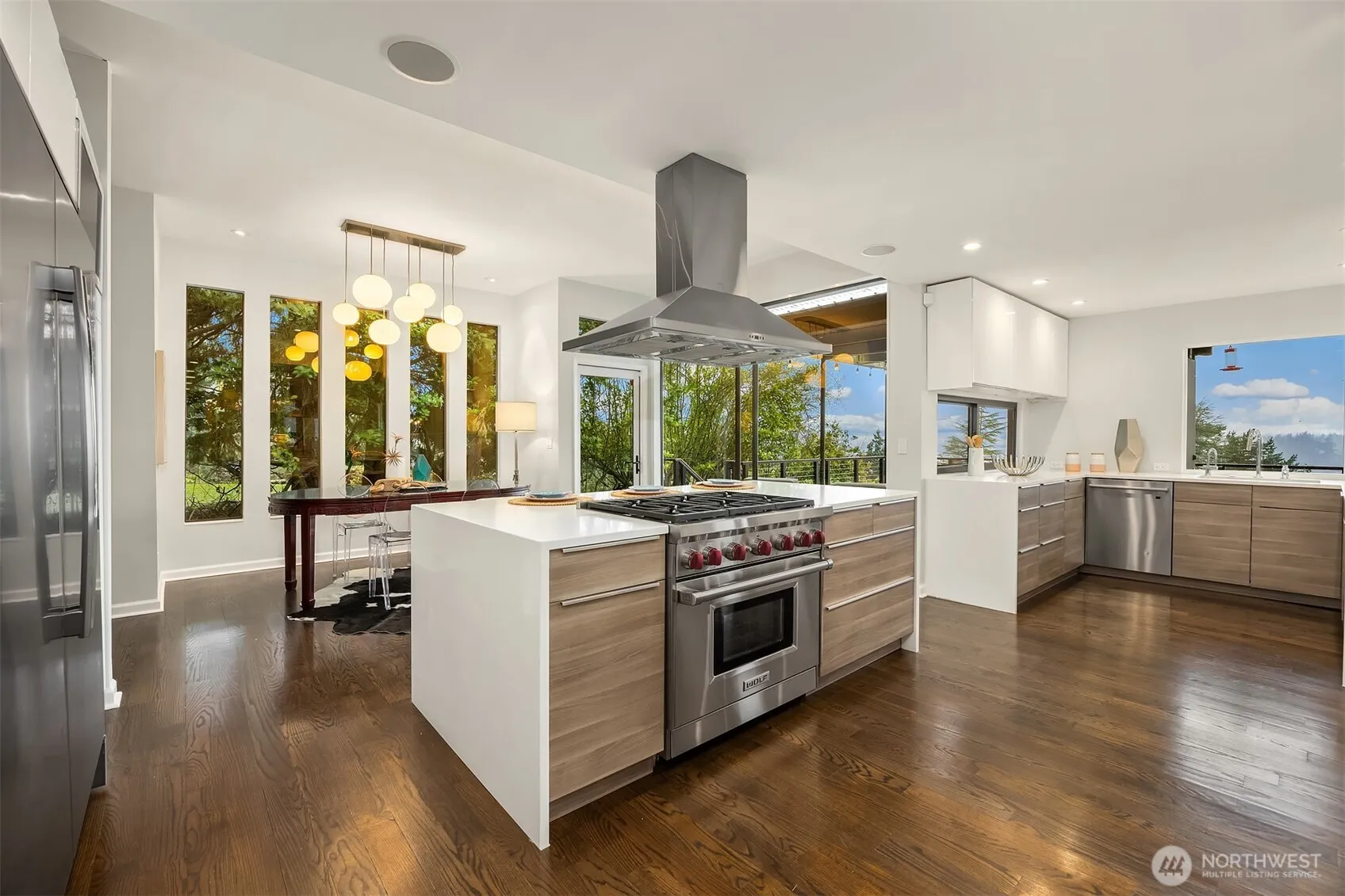 Stunning west-facing views of the lake, city & mountains in an updated designer home at this price point? Unheard of… until now! Set far back from the street and backing to a greenbelt, this light-filled home offers privacy, natural light & seamless indoor-outdoor living. Featured in The Seattle Times, it showcases vaulted ceilings & bifold doors opening to a view deck made for entertaining. Remodeled kitchen boasts Wolf range, dual dishwashers & full-size fridge/freezer. A dreamy primary suite, 3 bedrooms & 2 baths on the main level & lake views from every floor. Flat grassy yard, hot tub, gym & rec room plus an updated lower level (2025) offers ADU potential with separate entrance, bedroom & updated bath. Pre-inspected & move-in ready!