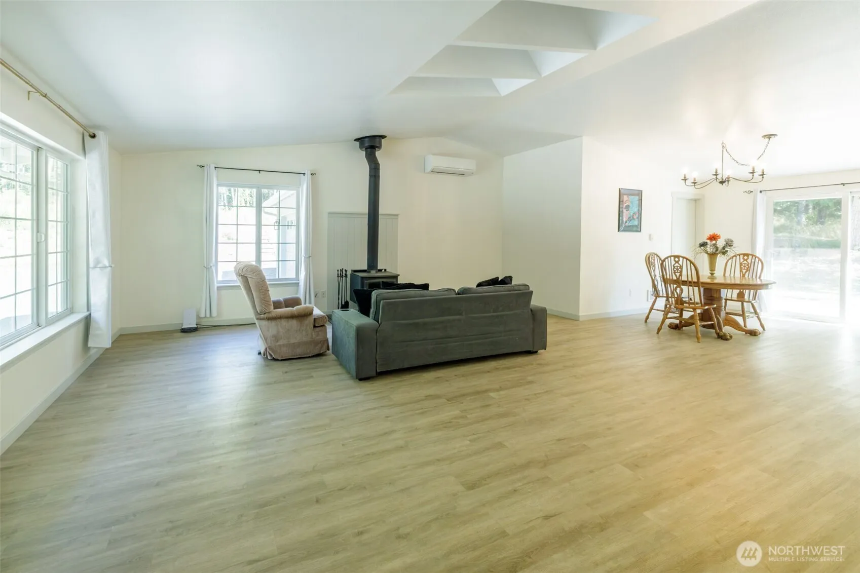 Discover a slice of paradise on 4.47 acres with/ beautifully updated, maintained rambler on a dead-end road. Open concept living including cozy woodstove, & adjacent dining rm/kitchen for entertaining. Enjoy year-long comfort w/4 minisplits. 2 full bathrms & utility room make this a wonderful home to call yours! Don’t miss the Vaulted ceilings, skylights, laminate plank vinyl flooring, primary bedroom w/walk-in closet, circular driveway, & fruit trees (cherry/apple). 24×30 Shop w/garage door perfect for hobbies/projects. Cut wood & firewood stand included. Surrounded by tranquil natural beauty, the land serves as an oasis waiting for you to customize it to your taste. Gardens, rec areas or expanding home! All appliances included & No HOA!