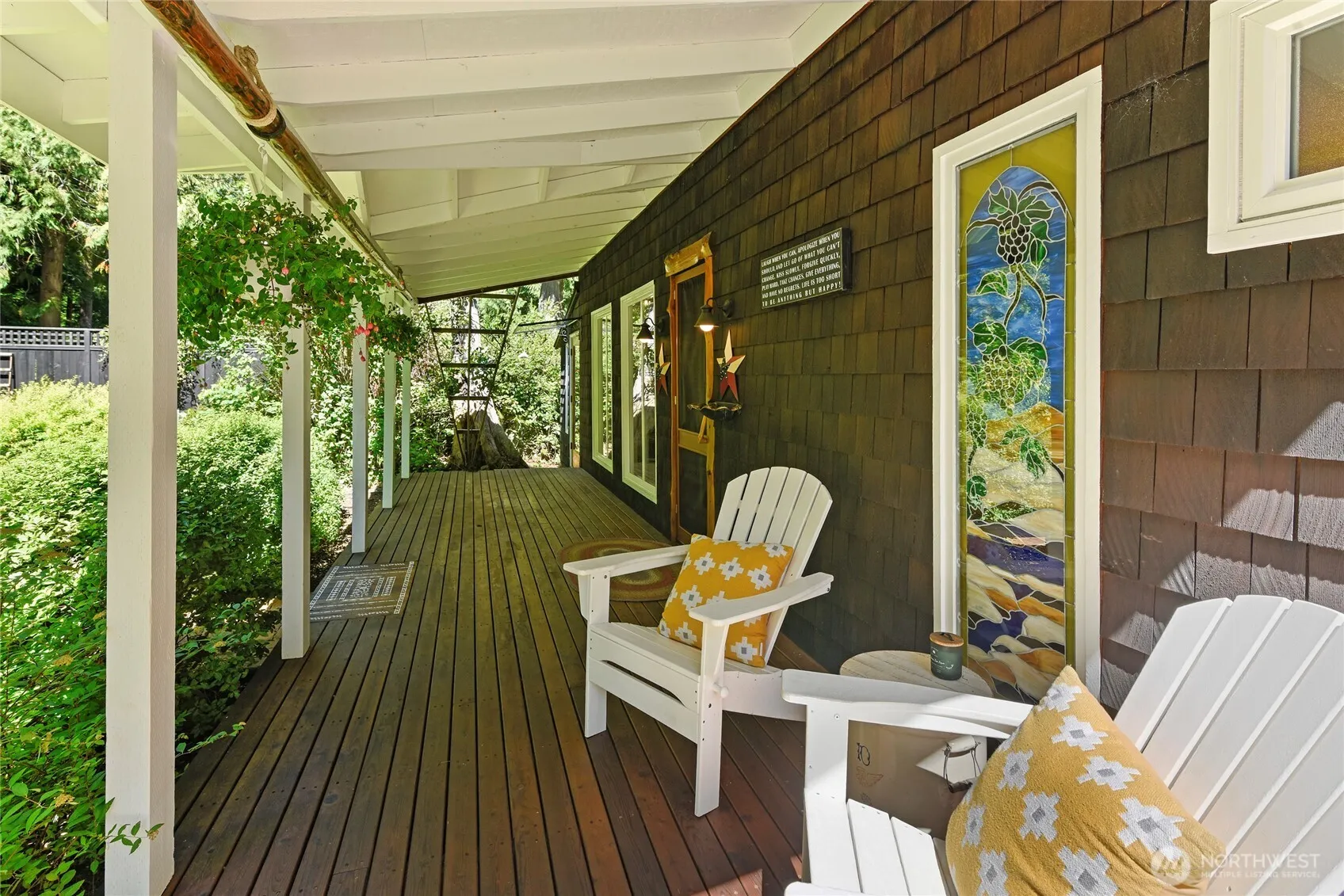 Charming Private Oasis on shy half acre is fully fenced with automatic gate. You’ll enjoy the inviting front porch and beautifully landscaped yard with roomy patio. Custom features include: exposed beams salvaged from an old Seattle cannery, 12″ wide plank pine floors, numerous stained glass windows, custom cherry cabinetry in kitchen, and a cozy propane fireplace. Newer 3/4 bath added to second level, and newer 2 car garage with workshop and loft storage. Don’t miss the cozy office/guest space off front porch and the separate sauna and outdoor shower. This 2 bdrm house has a 3 bdrm septic system and may afford possibility for expansion or ADU. Super convenient to Battle Point Park, the Grand Forest and two public beach access points.