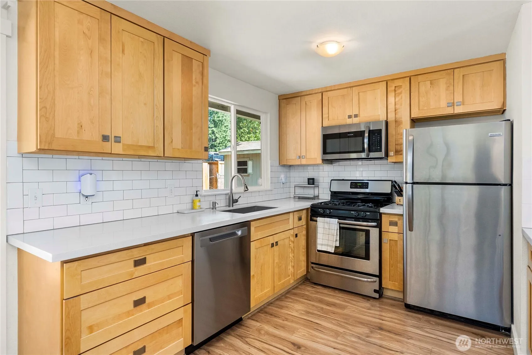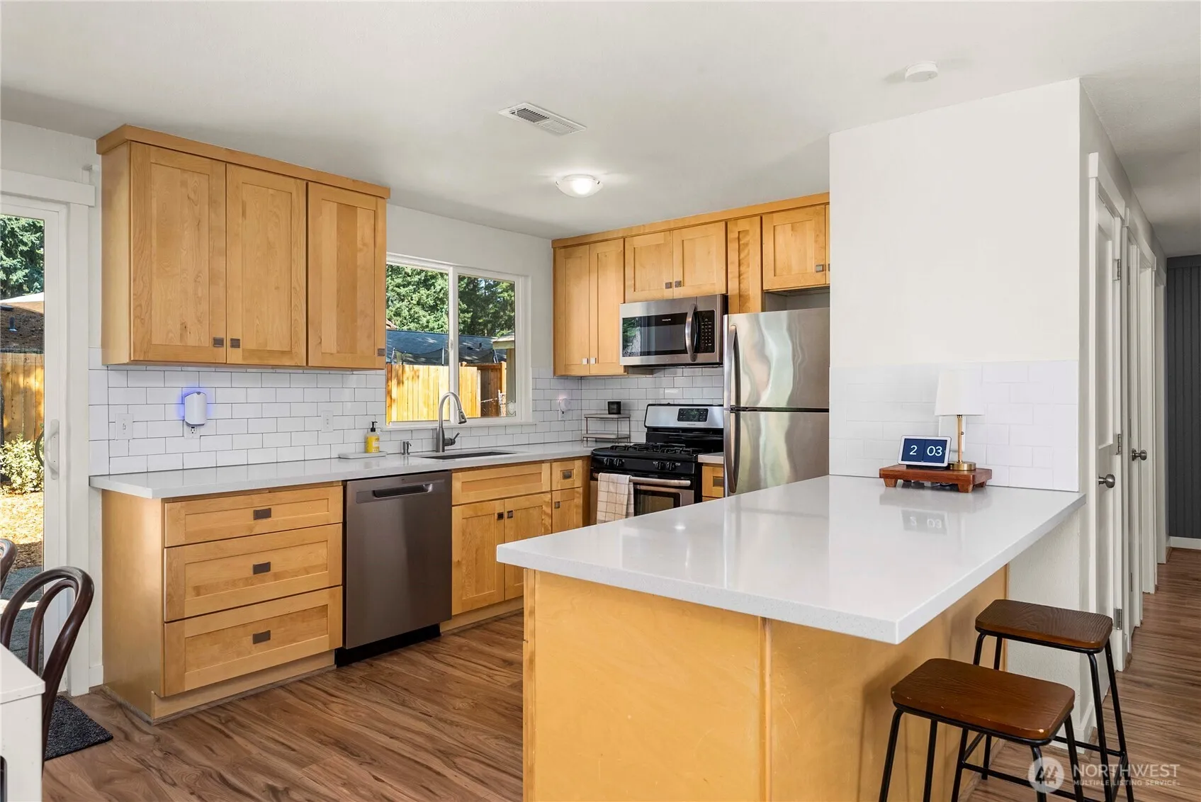 Welcome home! Open-concept 3-bedroom rambler in a prime location close to everything! This home shines with a gorgeous updated kitchen featuring soft-close Shaker cabinets, quartz counters, subway tile backsplash, stainless appliances, and an eating bar with coffee nook. A stylishly updated bathroom, newer flooring, plus roof, windows, and doors all redone in 2017 ensure peace of mind. Step outside to a fully fenced yard with lush lawn and garden beds. Enjoy the entertainment sized patio perfect for gatherings and everyday living. Handy shed for tools and toys. The community offers a pool and clubhouse, adding resort-style perks. Easy access to Hwy-18, schools, shopping, and dining makes this an ideal find. Enjoy summer with A/C!