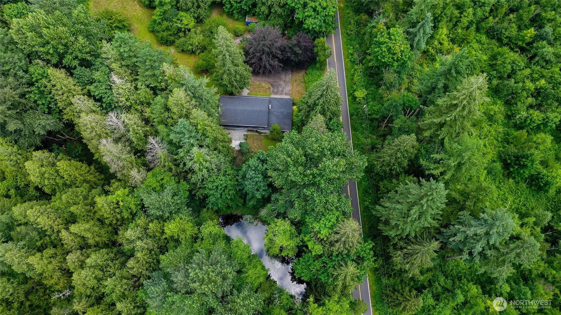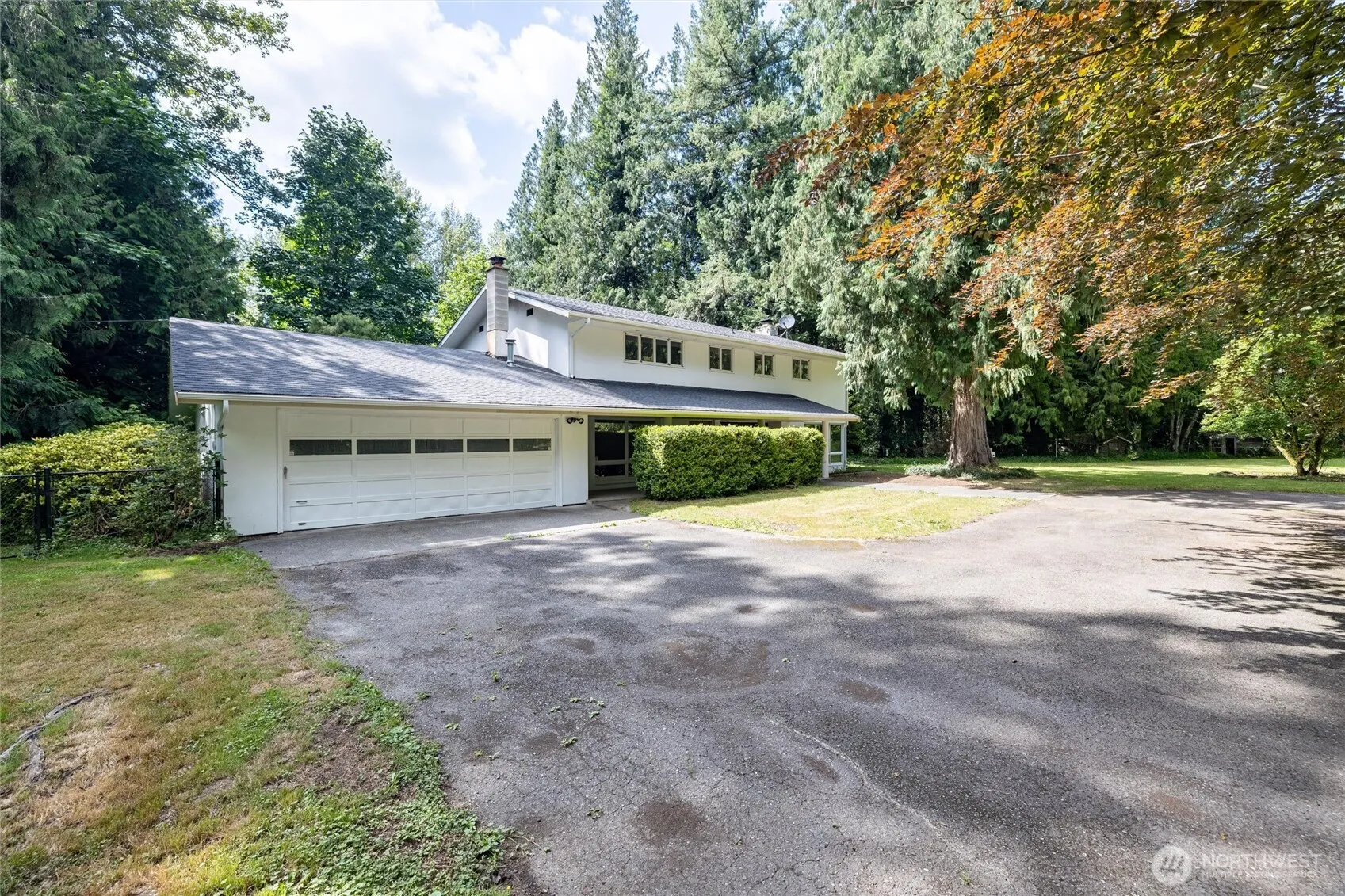 Incredible opportunity to own a county home! Imagine summer afternoons in your own 5+ acre park-like retreat with a large pond and salmon stream. This mid-century home is nestled in the woods with sunny clearings, just 8 minutes to groceries. With 3 beds, 2.5 baths, a huge living room, bonus room, generous kitchen with eating bar, and dining area overlooking the pond, this home offers space and serenity. The gigantic primary suite and open layout make 2,700 sq ft feel even larger. 40′ Shipping container onsite could be easily converted to a small shop or hobby barn. Come see your private nature preserve! Recent price improvement makes this rare retreat even more attractive—act fast and book your showing today!