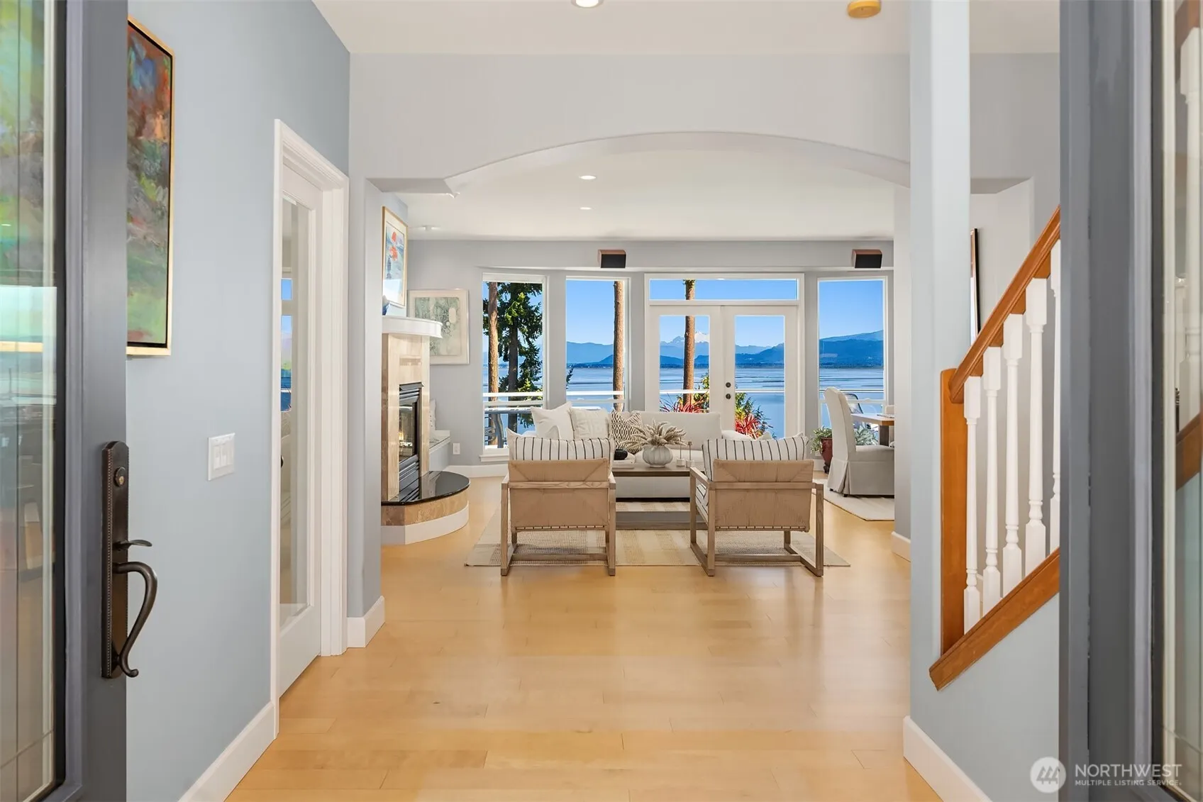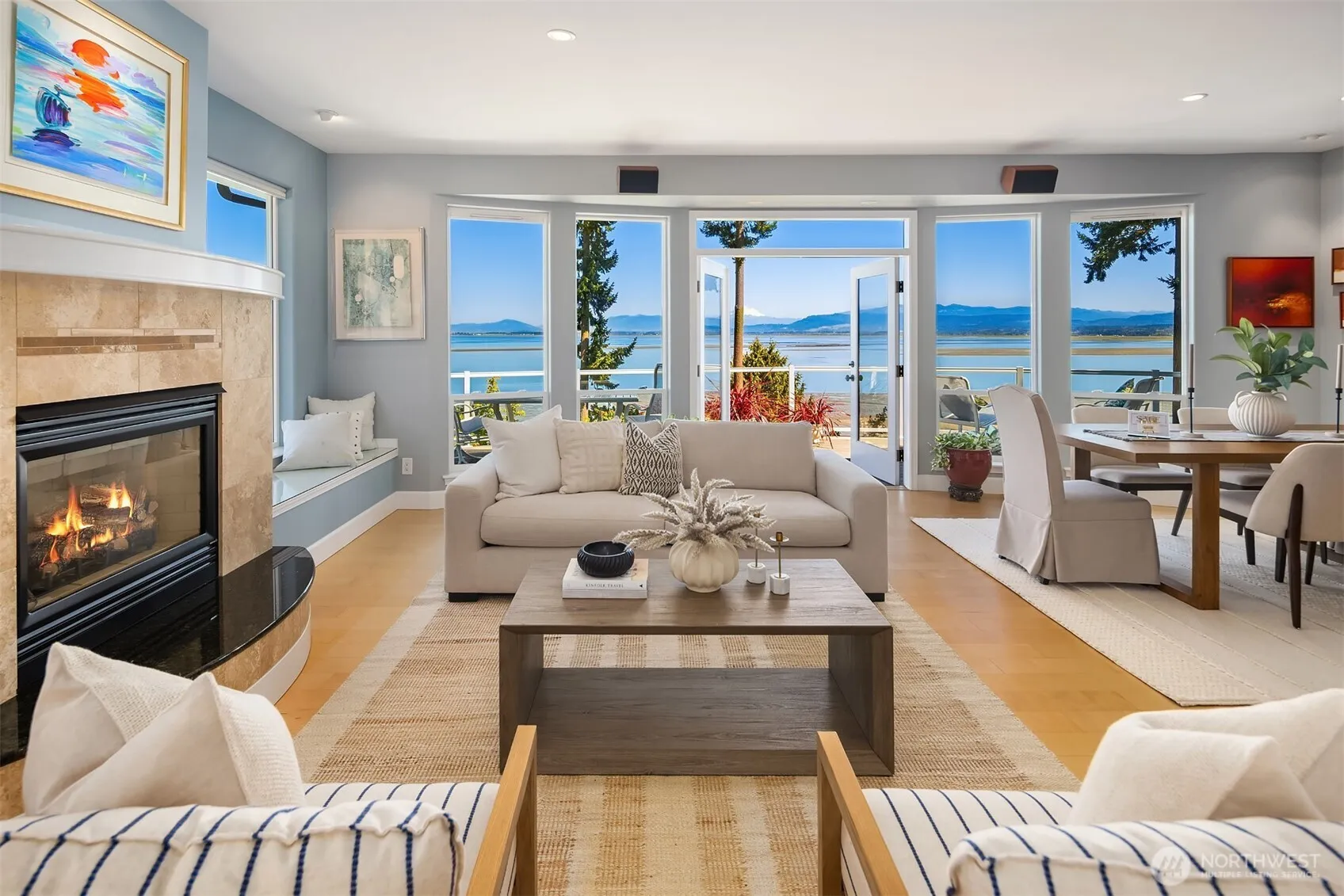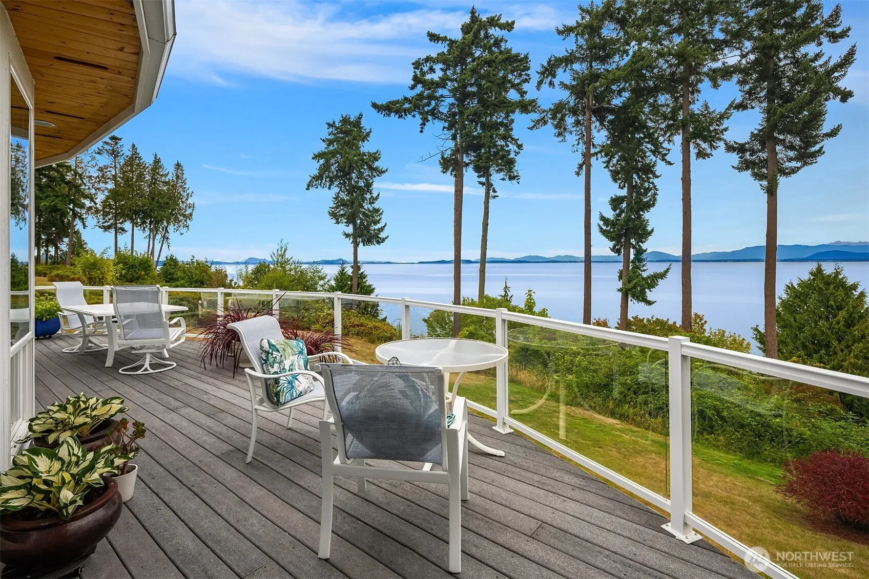 Located in the coveted gated community of Eagle Tree Estates, this stunning home showcases unobstructed views of Skagit Bay & Mt. Baker. Perched on 2.5 acres, it features sweeping vistas from the great room with its wraparound deck and from the primary suite, where a cozy window seat is ideal for watching eagles & herons. The property continues across the street along a private driveway winding past landscaped grounds highlighted by a rock waterfall, ponds, garden, a greenhouse, and a studio. Flooded with light, the studio offers floor-to-ceiling windows, a ¾ bath, indoor/outdoor shower, patio, and hot tub. With access to 14 acres of private beach, this rare retreat blends natural beauty with thoughtful design for generations to enjoy.