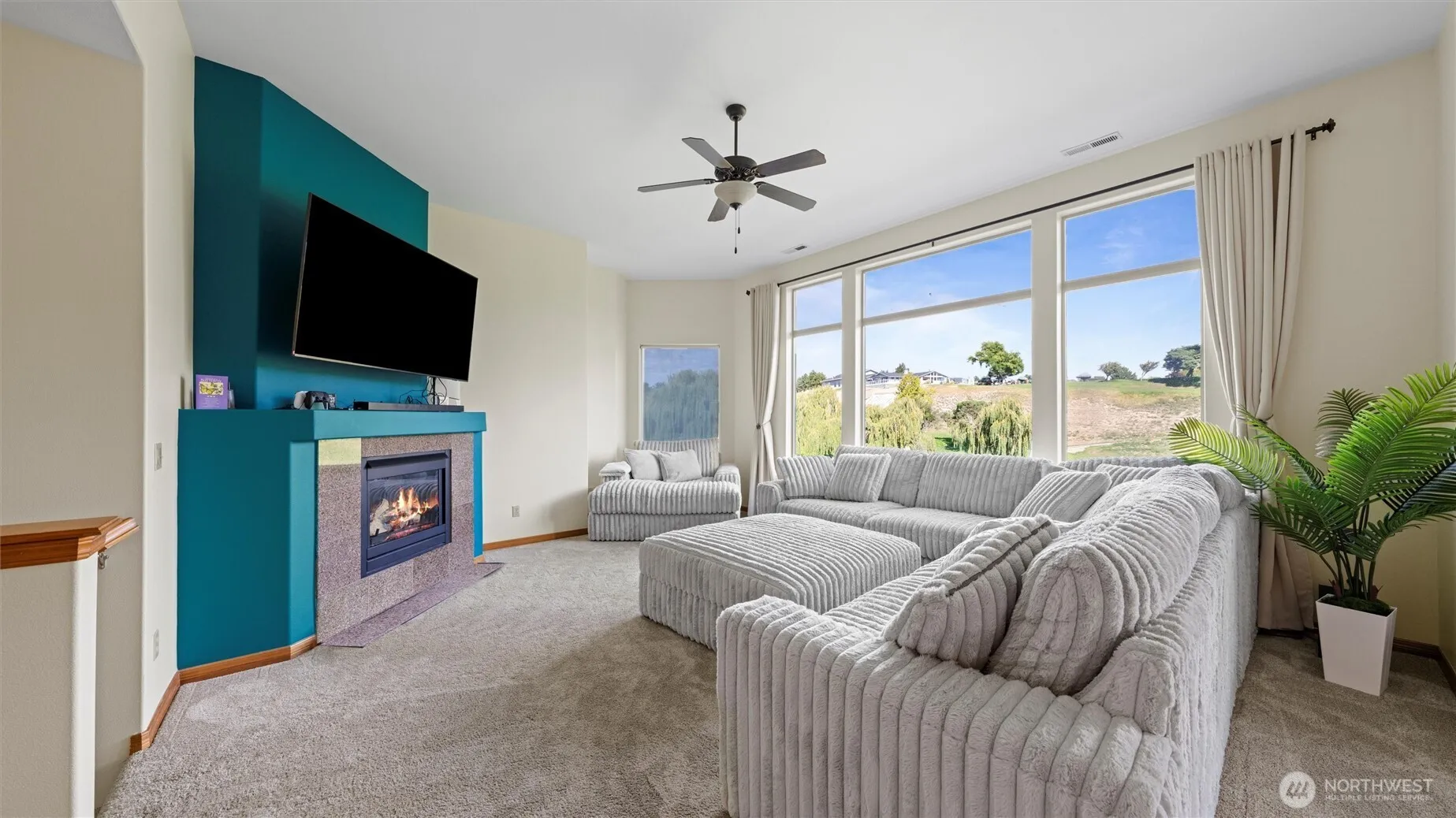 4 bed/4 bath daylight-basement home, 4,000+ sq ft, overlooking a pond on Canyon Lakes Golf Course. Main level: 12-ft coffered ceilings, large windows, granite fireplace. Chef’s kitchen: granite counters, tile backsplash, stainless appliances, built-in oven, pantry, breakfast bar. Primary suite with patio access, walk-in closet, and bath: dual vanities, soaking tub, tiled shower. Two bedrooms share a bath; office plus powder room. Daylight basement adds a family room with fireplace, wet bar and wine fridge, 4th bedroom, full and half baths, storage, and patio access. Covered patios on both levels. Finished, insulated 3-car garage. Quiet neighborhood with guest parking.