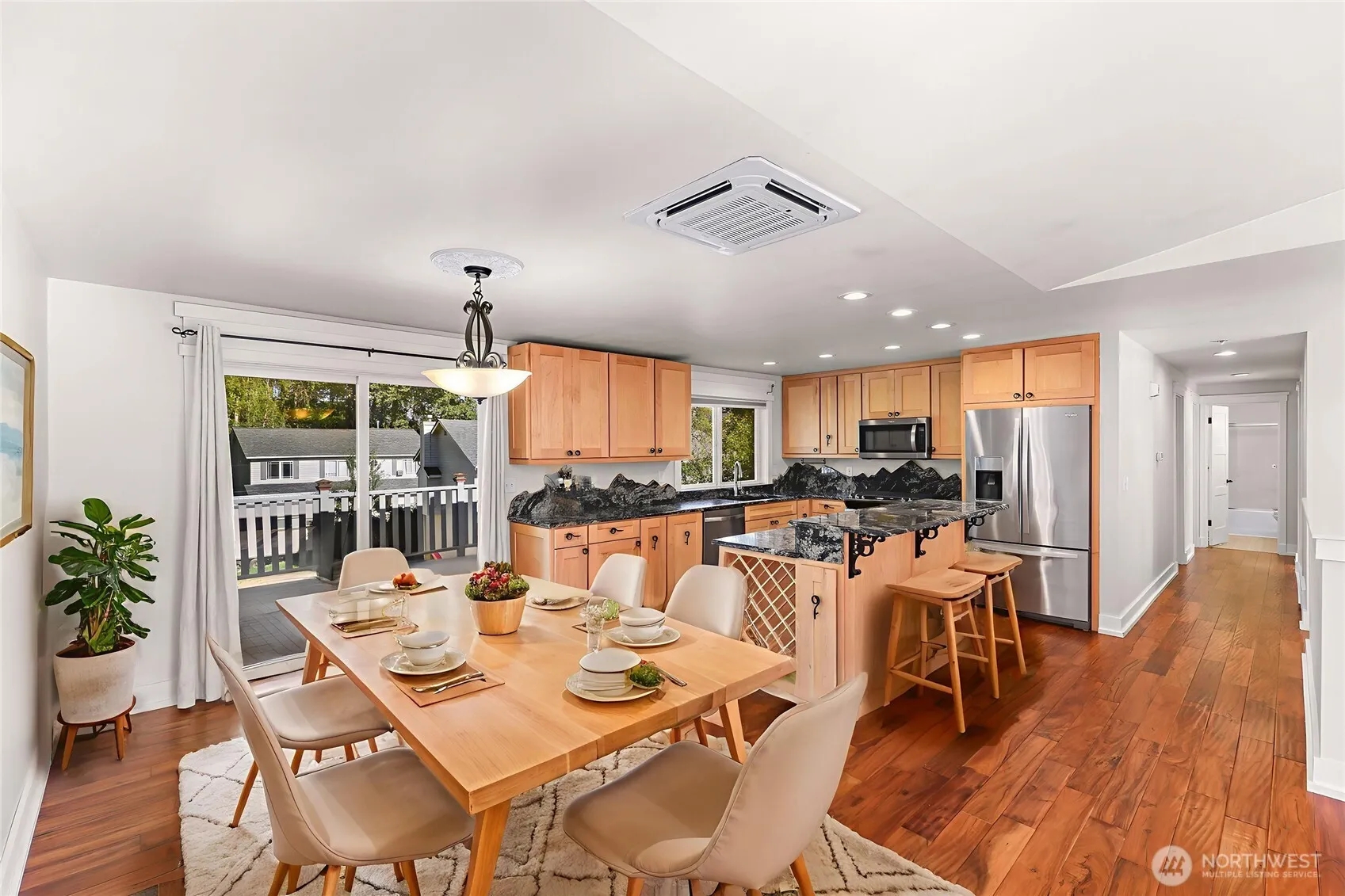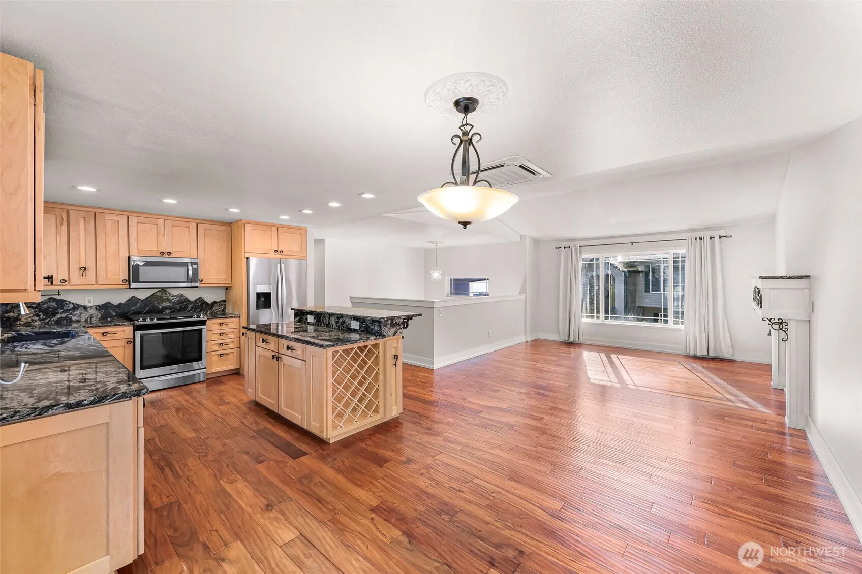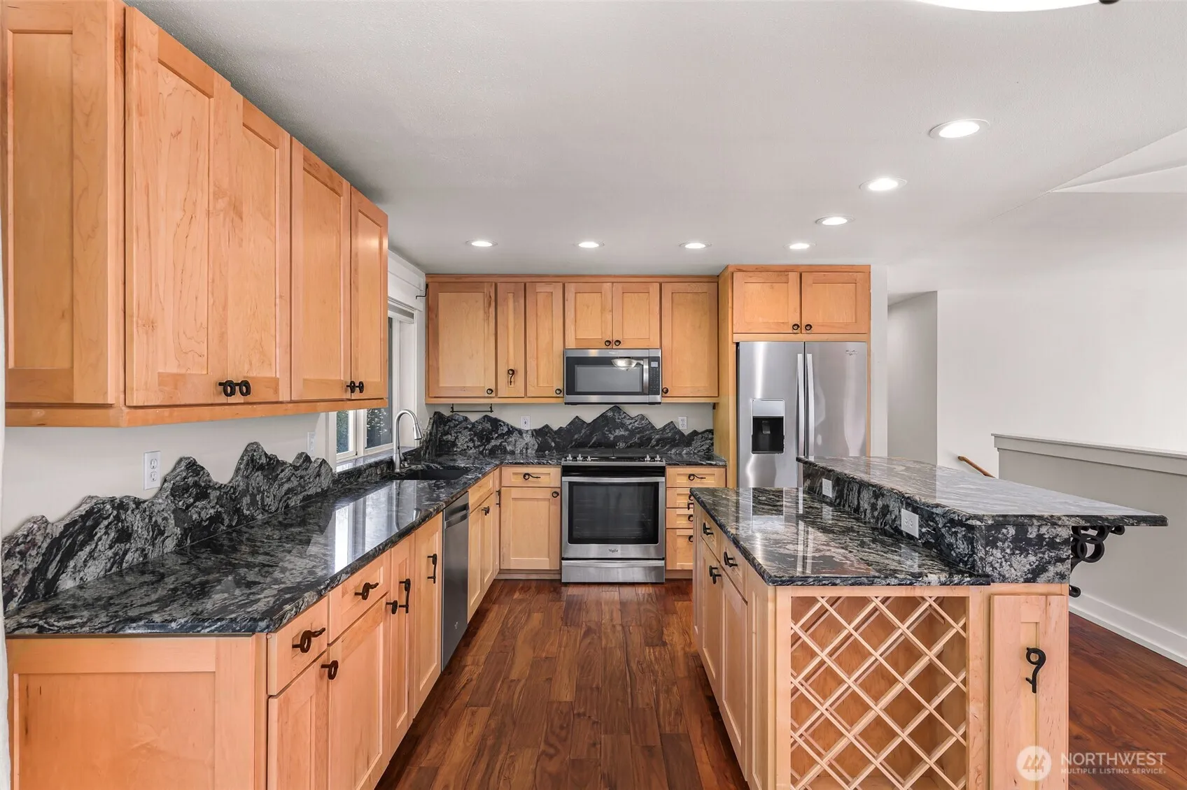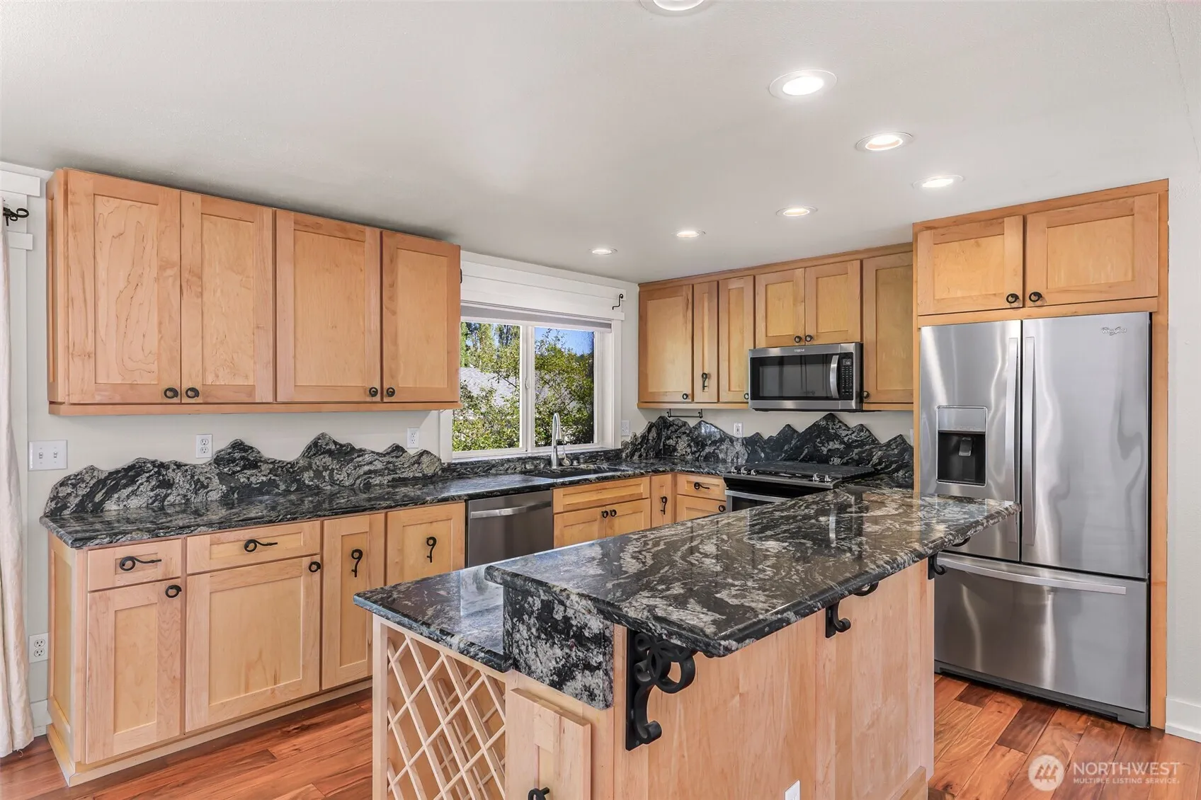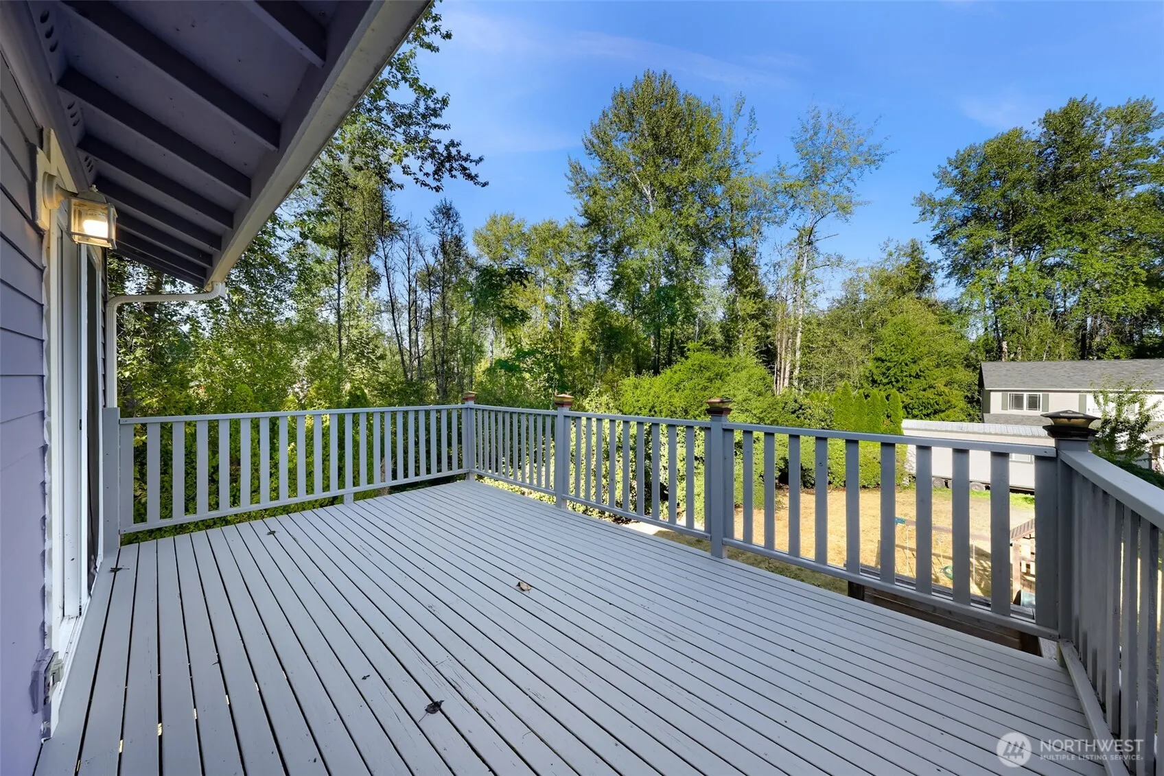 Tucked away on a quiet, spacious lot backing to greenspace, this Lake Stevens gem offers privacy, upgrades, no HOA. Inside, vaulted ceilings, large windows, newer hardwoods create a bright, open feel. Updated kitchen boasts custom cabinets, granite counters, new appliances, stylish backsplash, flowing seamlessly to living area w/gas fireplace & slider to freshly painted deck. Primary suite features walk-in closet, updated bath w/tiled shower. Upstairs w/3 bdrms, lower level adds bdrm, bonus rm, 3/4 bath, walk-out access to hot tub. A finished basement w/rec room or potential MIL suite w/wet bar & fireplace. New roof, painted inside & out, heat pump w/AC, more. Fully fenced yard, oversized garage, RV/boat parking. Close to amenities & lake.