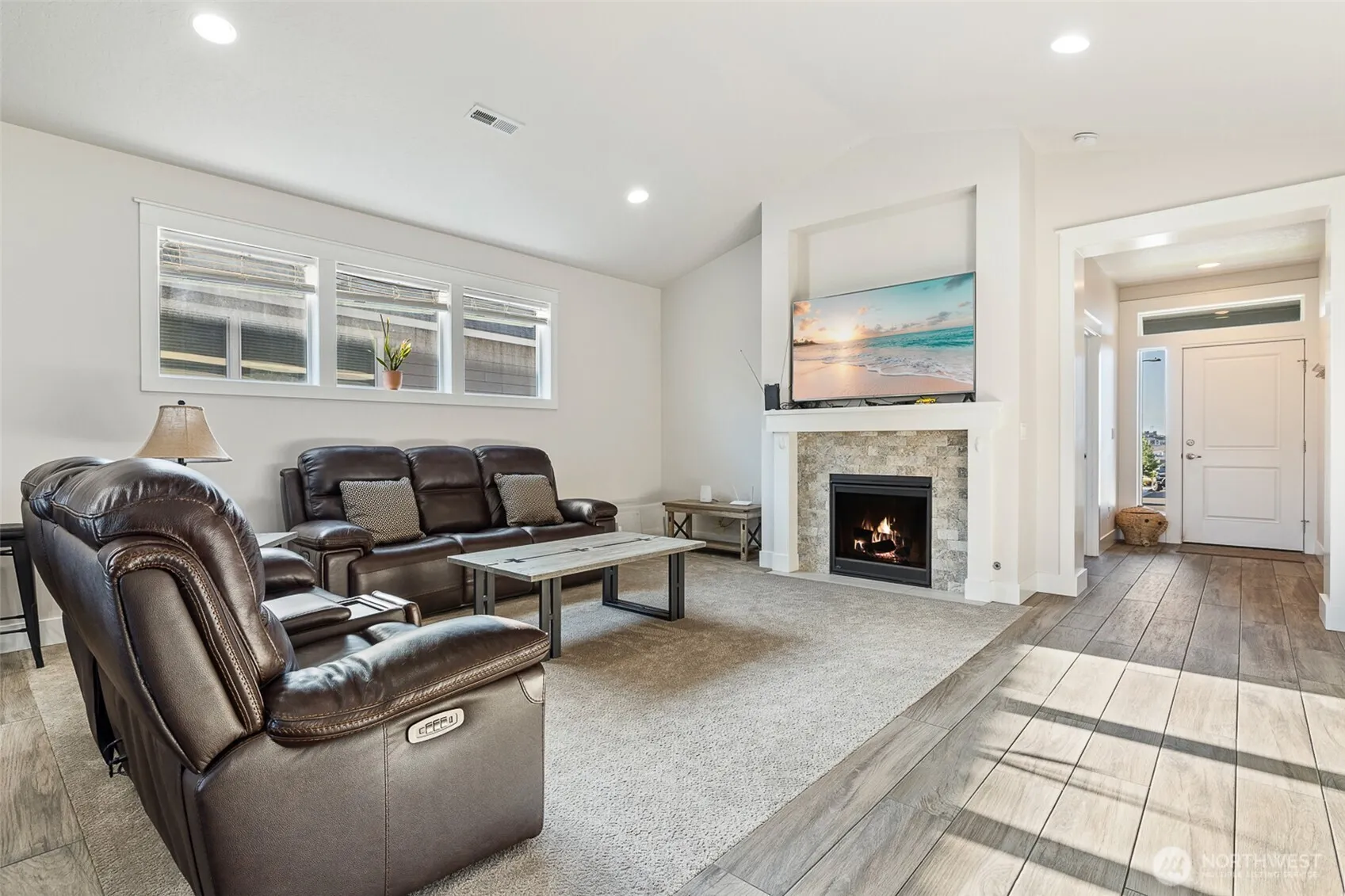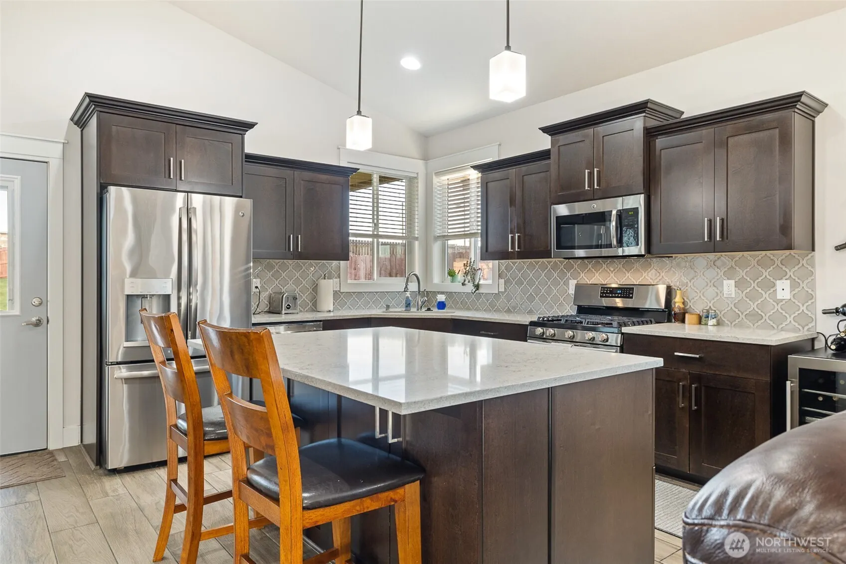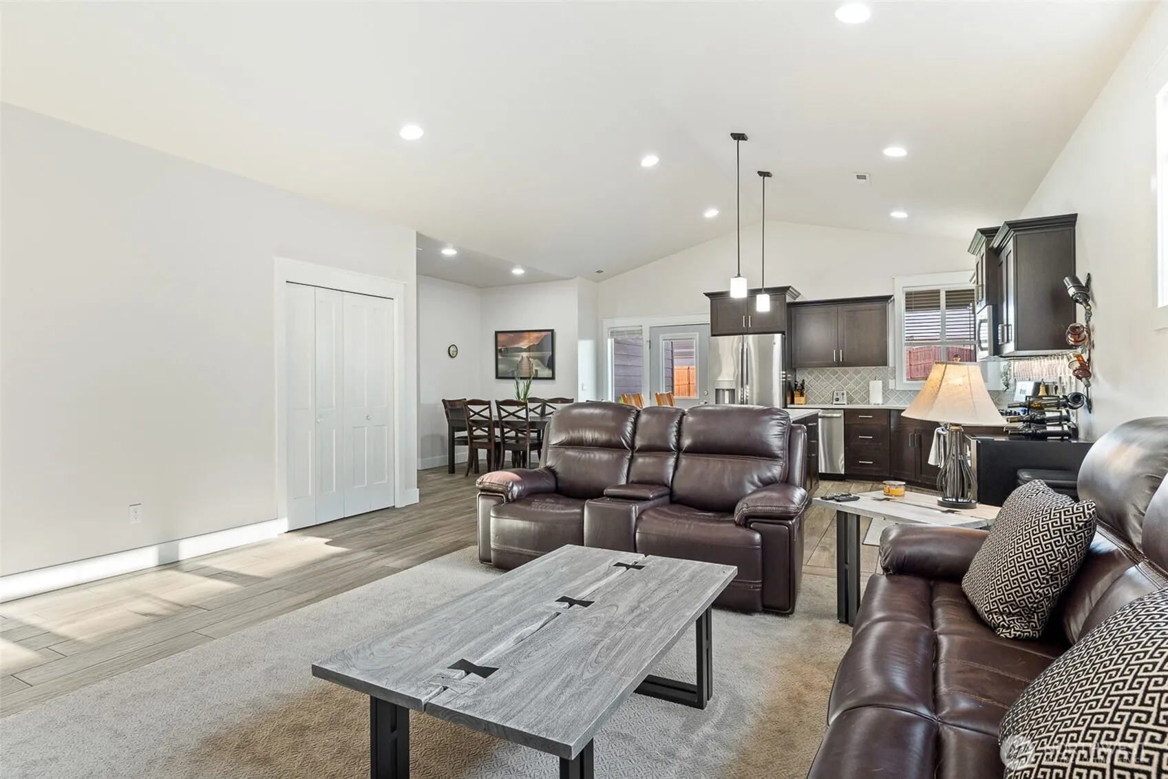 Meticulously maintained quality move-in ready Southridge home in perfect condition on large lot with solar panels. Open concept kitchen, quartz counters, island/breakfast bar, cabinet high back splash, staggard cabinets, soft close hardware, stainless appliances, gas range. Vaulted ceilings, “wood look” tile flooring, gas fireplace with tile surround, wood wrapped windows, plenty of natural lighting. Nice separation between bedrooms, primary bedroom has great walk-in closet and attractive bathroom. Laundry room has cabinets and a sink. Finished garage, possible side access to huge, fenced back yard, fire pit, covered back patio. Great neighborhood near shopping, schools, restaurants, freeways and city views from the covered front porch.