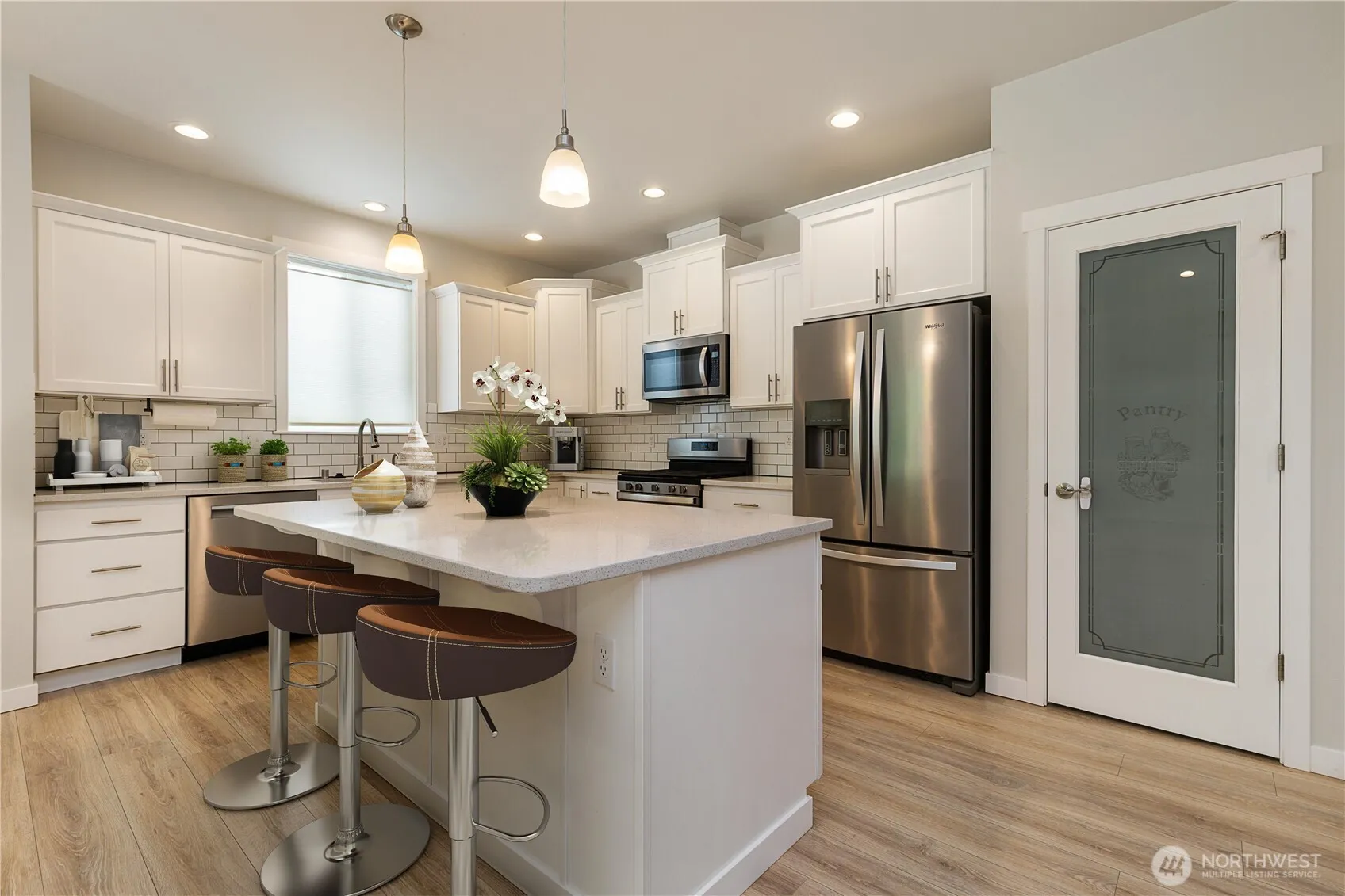 Welcome to this beautifully appointed rambler in the coveted Salish Breeze community. Nestled in a quiet cul-de-sac, this 3-bed, 2-bath home features 9-ft vaulted ceilings, an open concept layout, and a spacious primary suite with walk-in closet. The gourmet kitchen boasts quartz counters, a large island, and a brand-new dishwasher. Enjoy year-round comfort with newly installed AC. Step outside to a covered porch and a gardener’s paradise, fully fenced and backed by a greenbelt for added privacy. Minutes from trails, beaches, and a short drive to the US-Canada border for world-class dining and entertainment