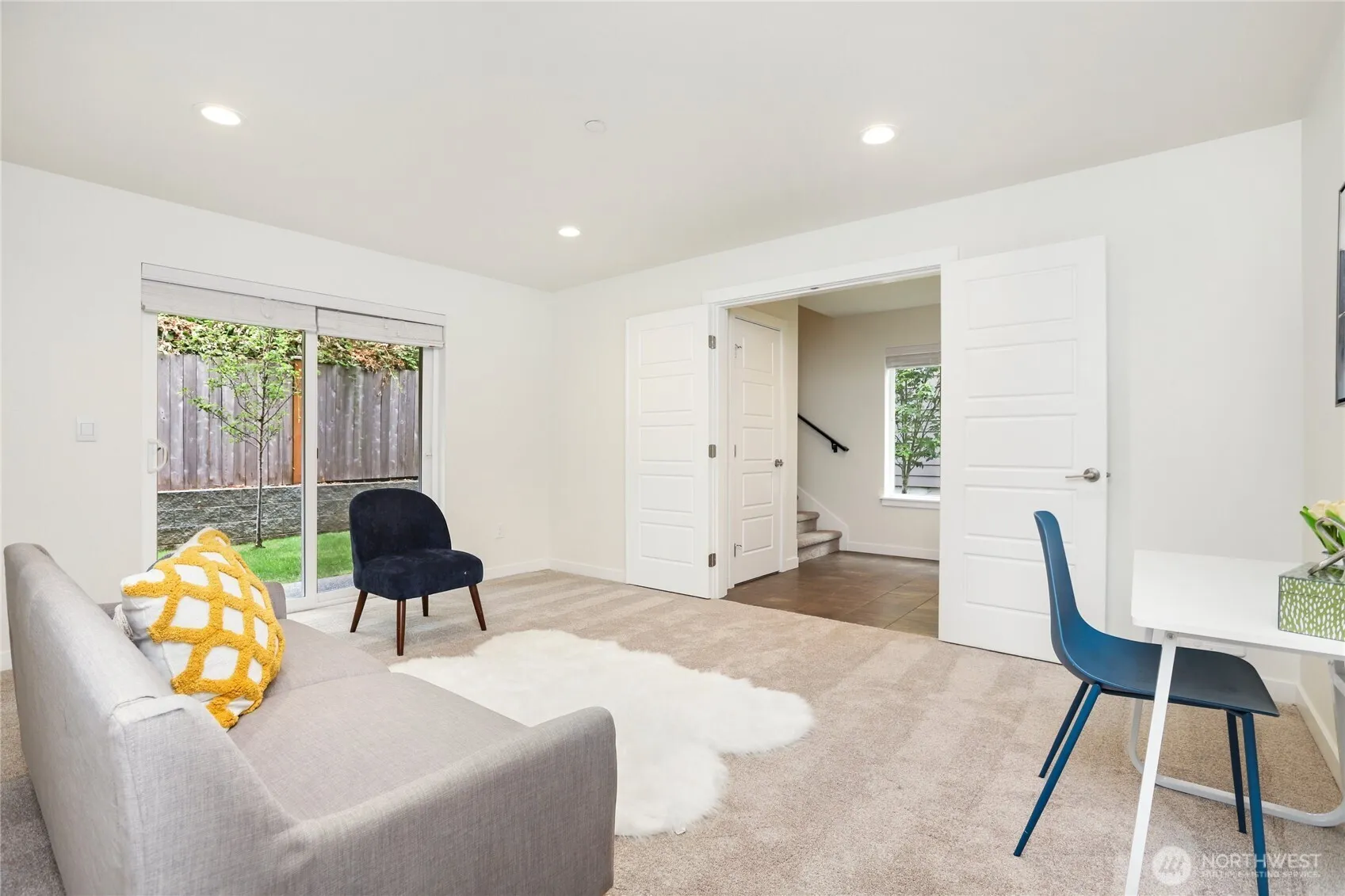 Sunlit, spacious, and thoughtfully designed, this Westcott end-unit townhome blends smart design with stylish comfort. The open entry leads to a spacious bonus room, while the main floor features engineered hardwoods throughout an open-concept great room. Enjoy a dedicated dining area with balcony, modern kitchen with abundant counter space and walk-in pantry, and a large living area with a cozy electric fireplace. Upstairs, the primary suite offers a ¾ bath and walk-in closet, joined by two additional bedrooms, a full bath, and laundry closet. Fresh interior paint and new carpet throughout. A two-car side-by-side garage provides ample storage. Prime location near Safeway, Boeing, Alderwood Mall, Costco, I-5, I-405, and Link Light Rail.