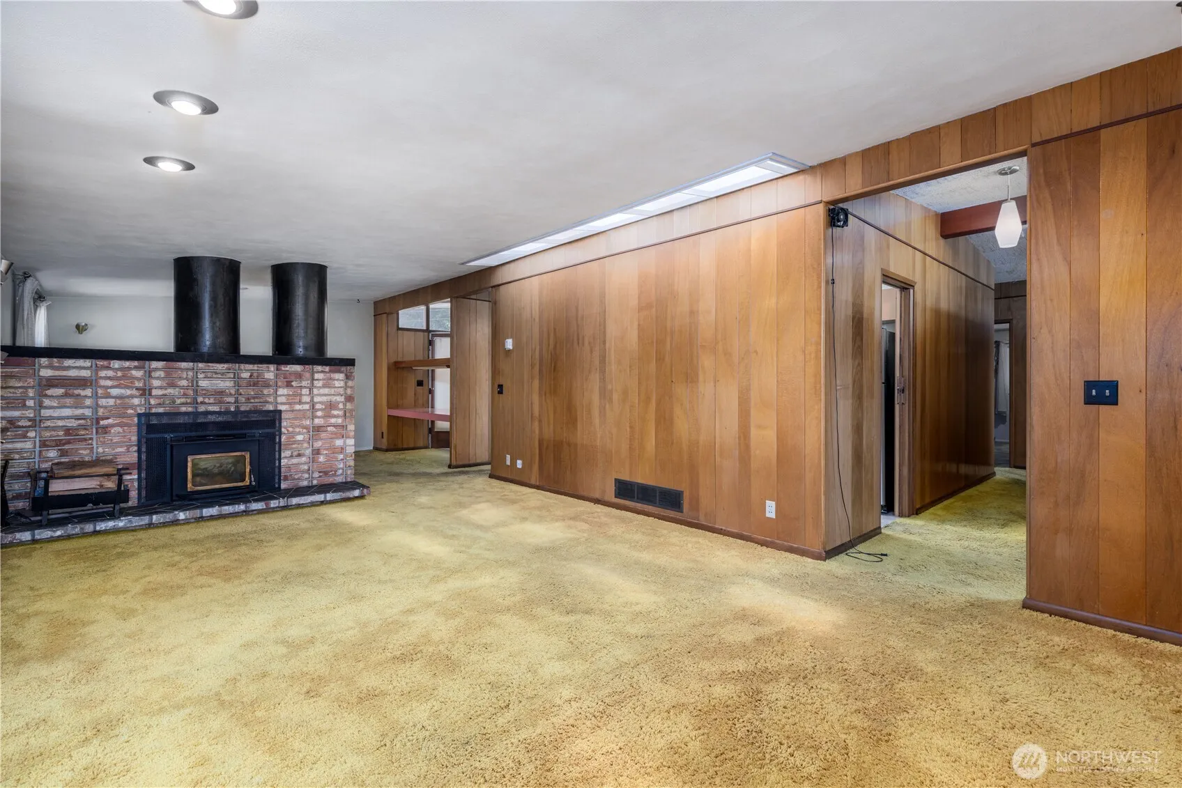 Charming in-town gem with Frank Lloyd Wright–inspired design! This 5-bed, 2-bath home offers timeless style with added basement space. Main level features 3 bedrooms, a bright dining room, skylit kitchen, cozy fireplace, bathroom, hardwood floor in front room under carpet with an inviting porch. Downstairs has a private entrance, 2 bedrooms, bath, spacious living room with fireplace, storage, and room for a kitchen—ideal for multi-gen living or rental potential. Situated on a huge corner lot with carport and beautiful landscaping. Endless possibilities await!