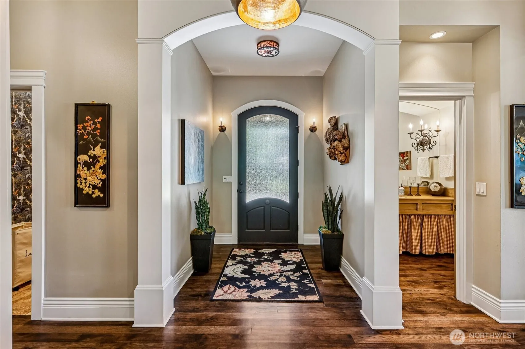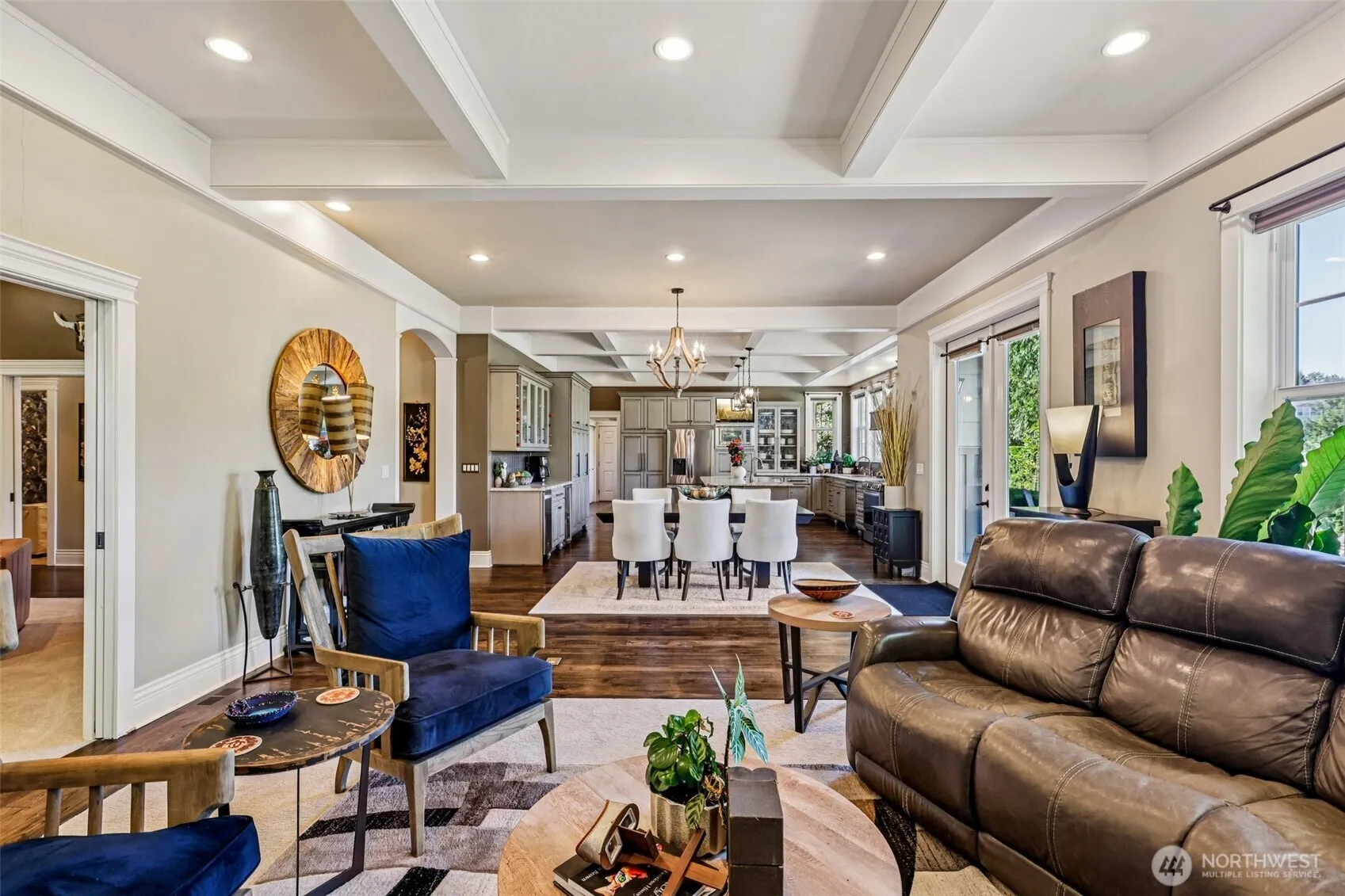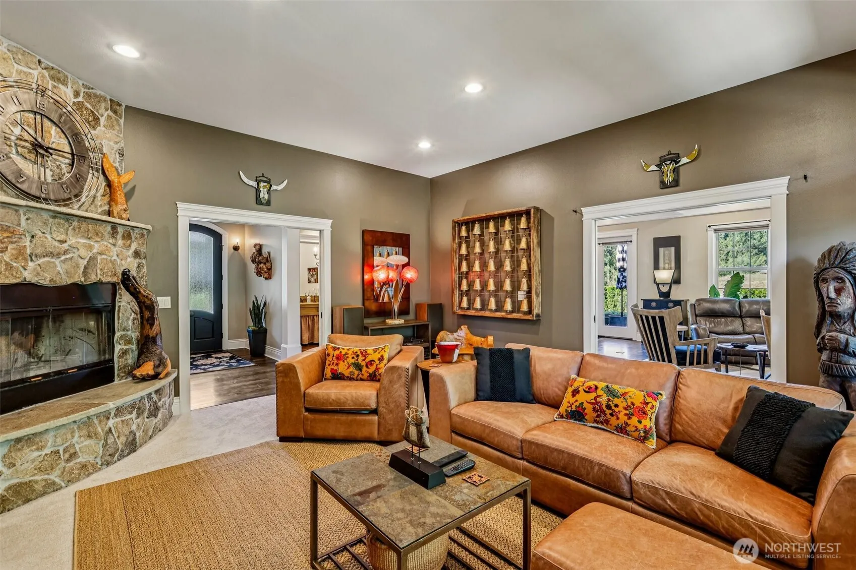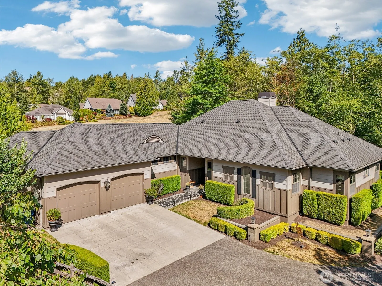 Exquisite craftmanship complete with high end finishes in one of the most desirable neighborhoods. Massive single level home offers two primary suites, boasting vaulted ceilings, hardwood floors, stone & granite, 2 wood/gas fireplaces. Lots of storage. The chef’s dream kitchen features an enormous granite-slab island, premium appliances, a wine fridge, a huge pantry with an adjoining small office. The luxurious primary suite offers separate vanities, a walk-in shower, a soaking tub, and a king-sized walk-in closet. .49 Acres, manicured yard, excellent outdoor spaces, lanais, great sunsets, views, seasonal creek, next to the idle golf course greens, your own private bridge. A must see in person to appreciate the winning design & layout!