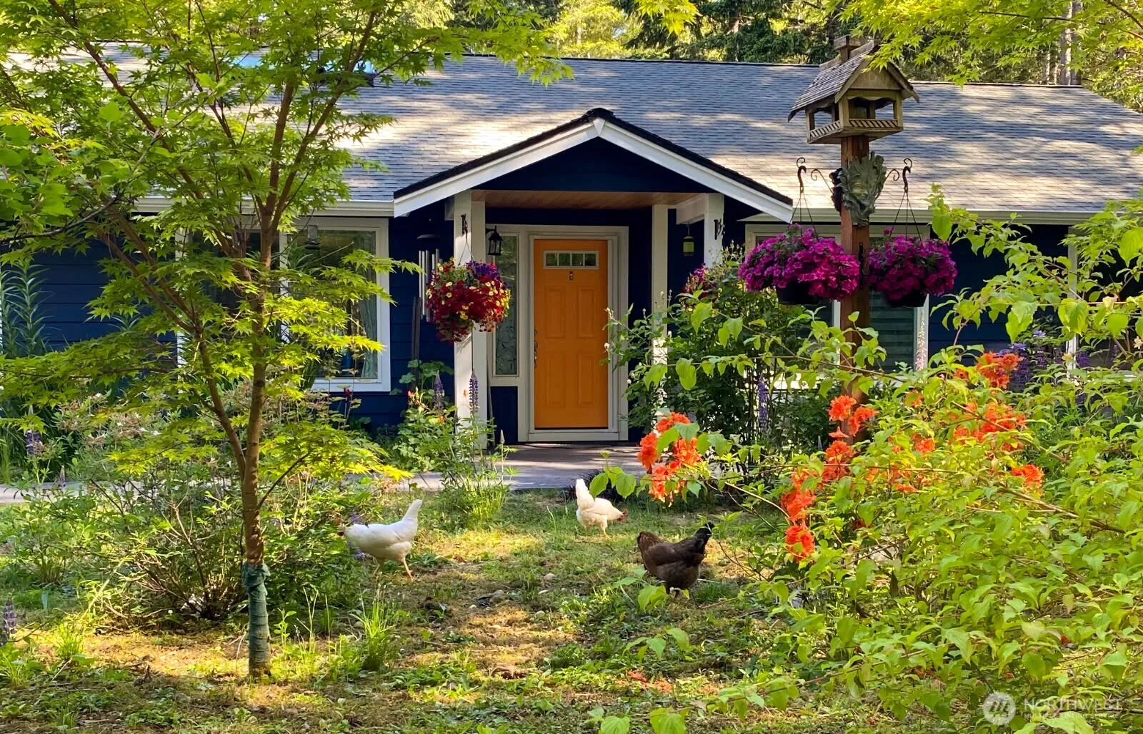 This home has it all, really, it does! If you are looking for a move in ready rambler with all the bells and whistles on 4.9 acres of serene peaceful privacy with a 36×24 garage (3 bay) insulated, 15 (110v) electrical outlets, 220 v to supply box, a pellet stove, you search is over! 3 bdrms plus a den, crisp white molding throughout, vaulted ceiling, skylights, custom blinds w/remote, can lighting, kitchen has granite counters, large farm style sink, dbl ovens, tile backsplash, instant hot water. Primary bedroom is spacious & bath has a beautiful custom shower and double granite vanity. Fruit trees, raised beds and a nicely painted chicken coop with solar powered programable door to allow for free ranging. Fence is not the boundary line.