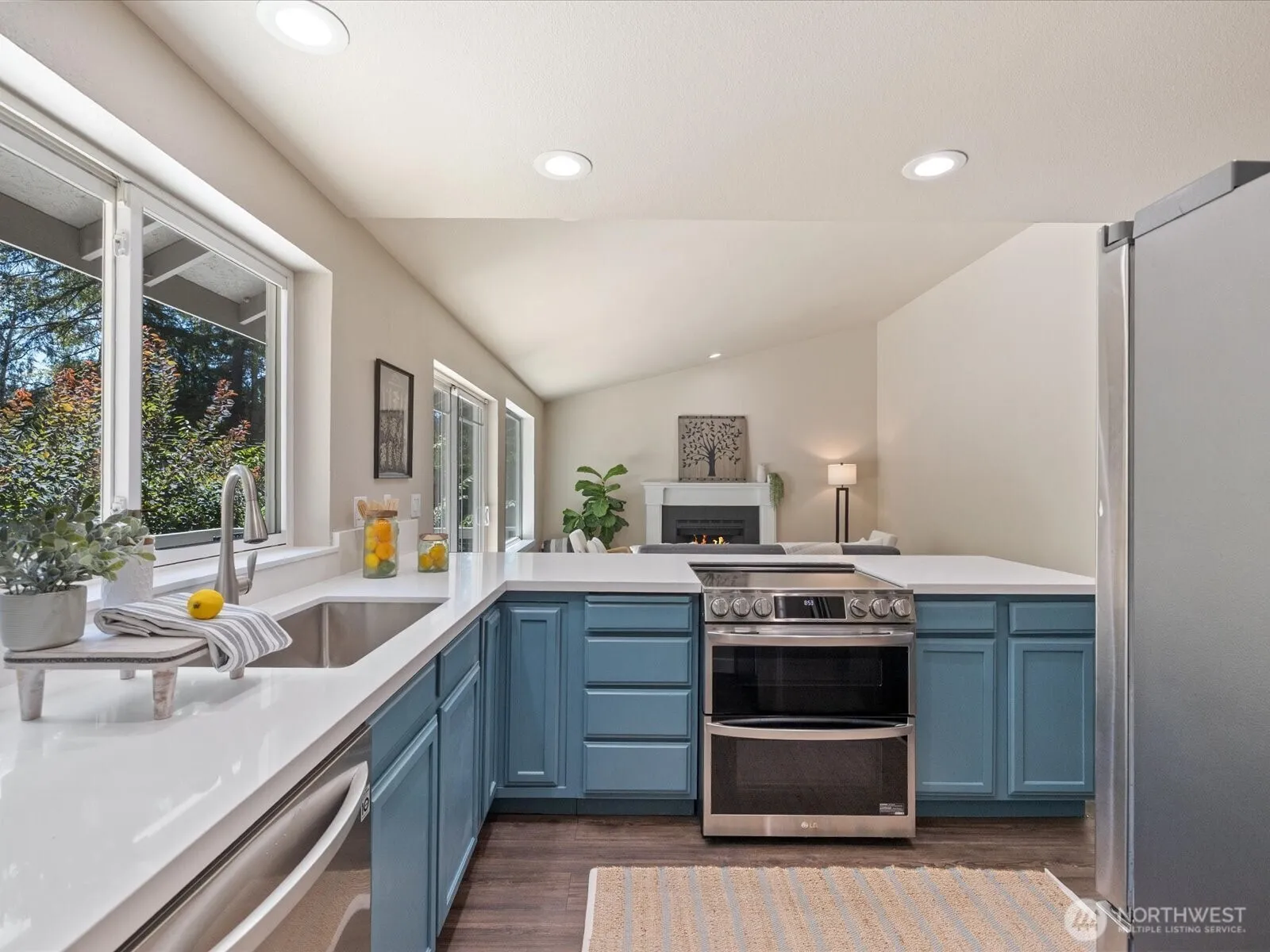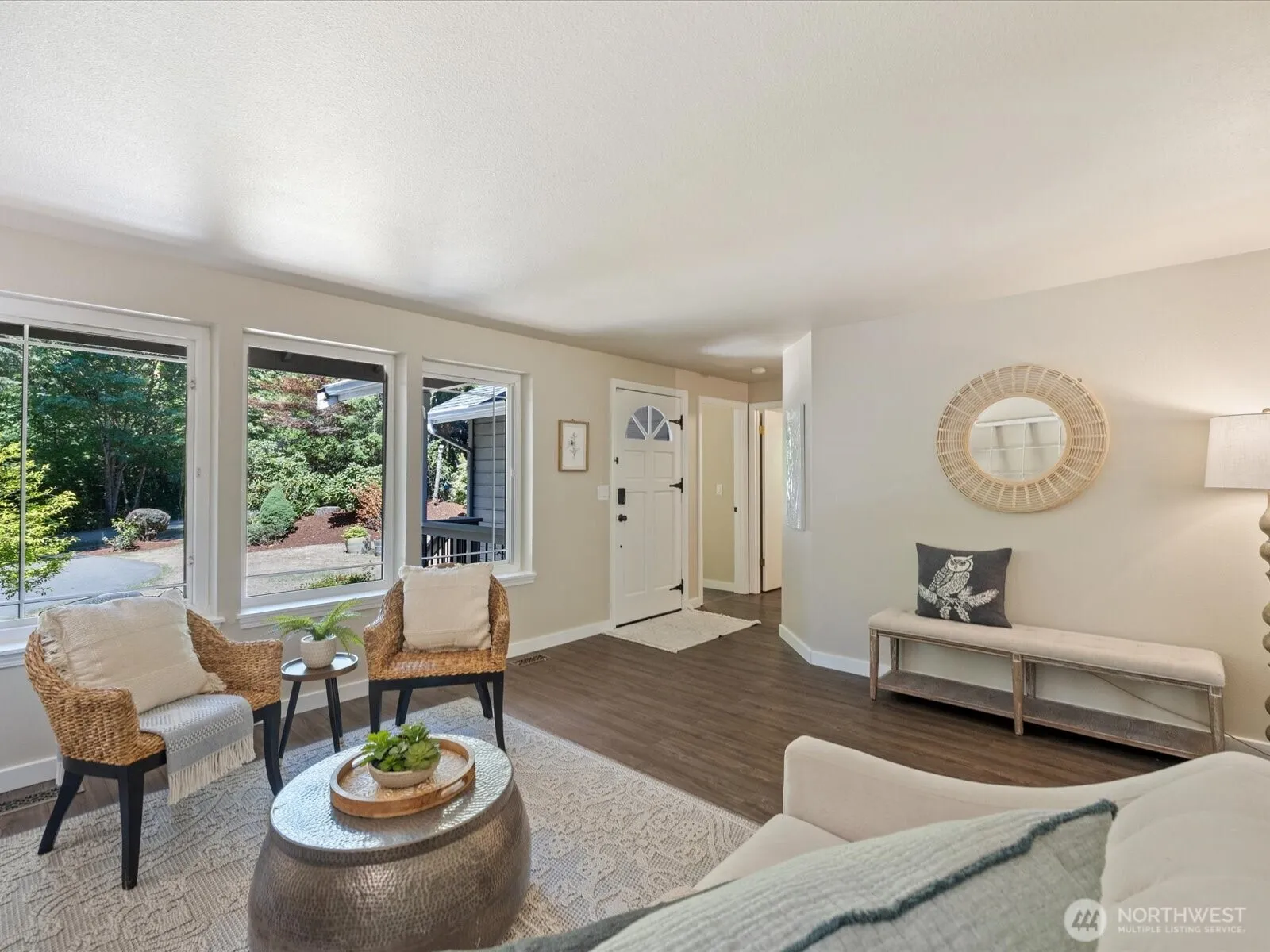 Nestled amidst the serene beauty of forest-lined acreage, this inviting home offers a cozy & private oasis. Functional 2,050 sq ft layout, enjoy 4 bedrooms—or configure as 3 bedrooms plus a bonus space to suit your needs. Two primary suites provide flexibility for multi-generational living or guest accommodations. The heart of the home is a light-filled, updated kitchen featuring SS appliances, quartz countertops, and an eat-in island—perfect for gathering and entertaining. Fresh neutral interior paint throughout adds a crisp, move-in-ready feel. Set on just over an acre, the outdoor amenities are a dream: a spacious entertainer’s deck, fire pit area, fenced gardens, mature berry & fruit trees, chicken coop, and playground. Pre-inspected!