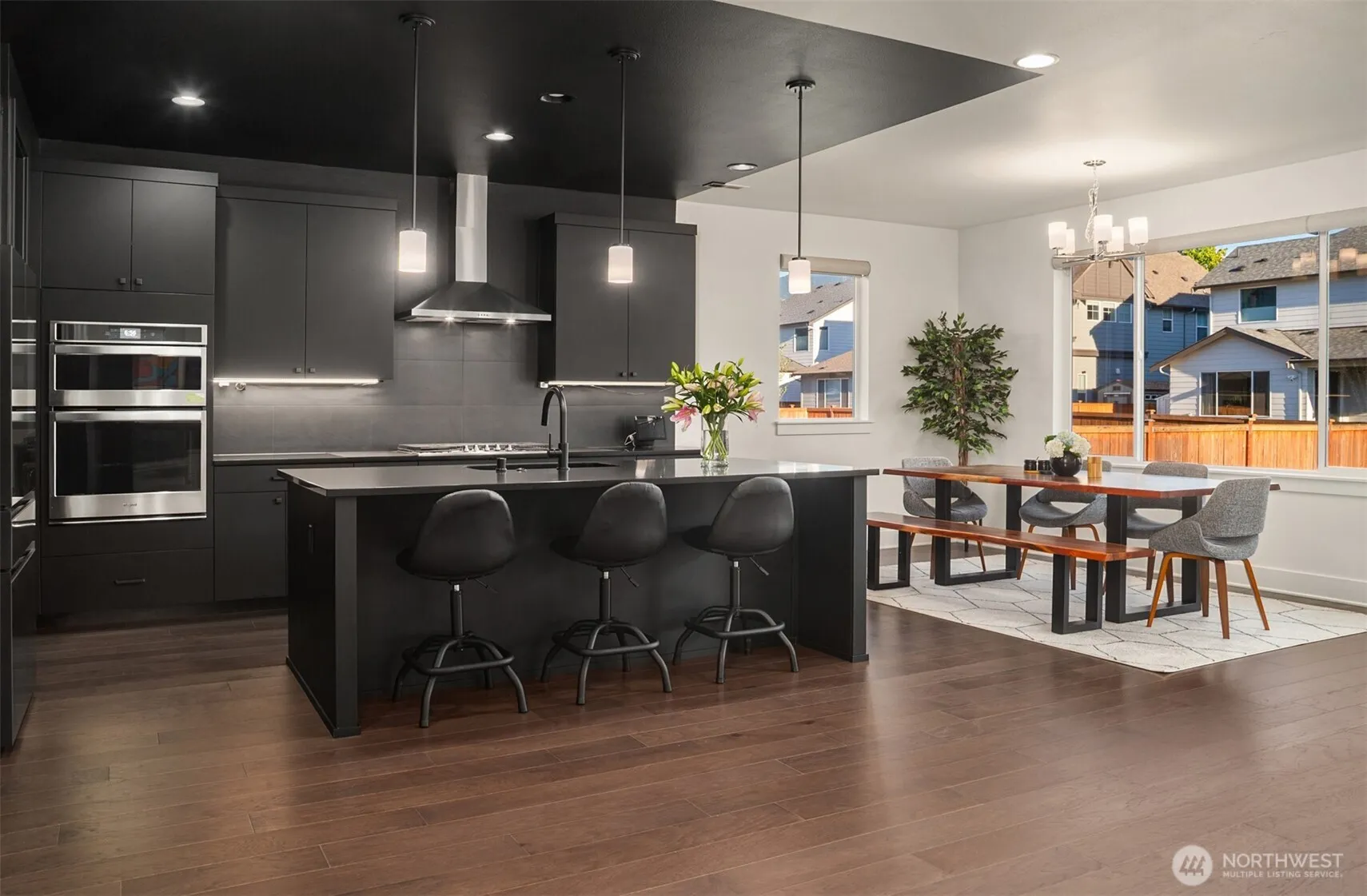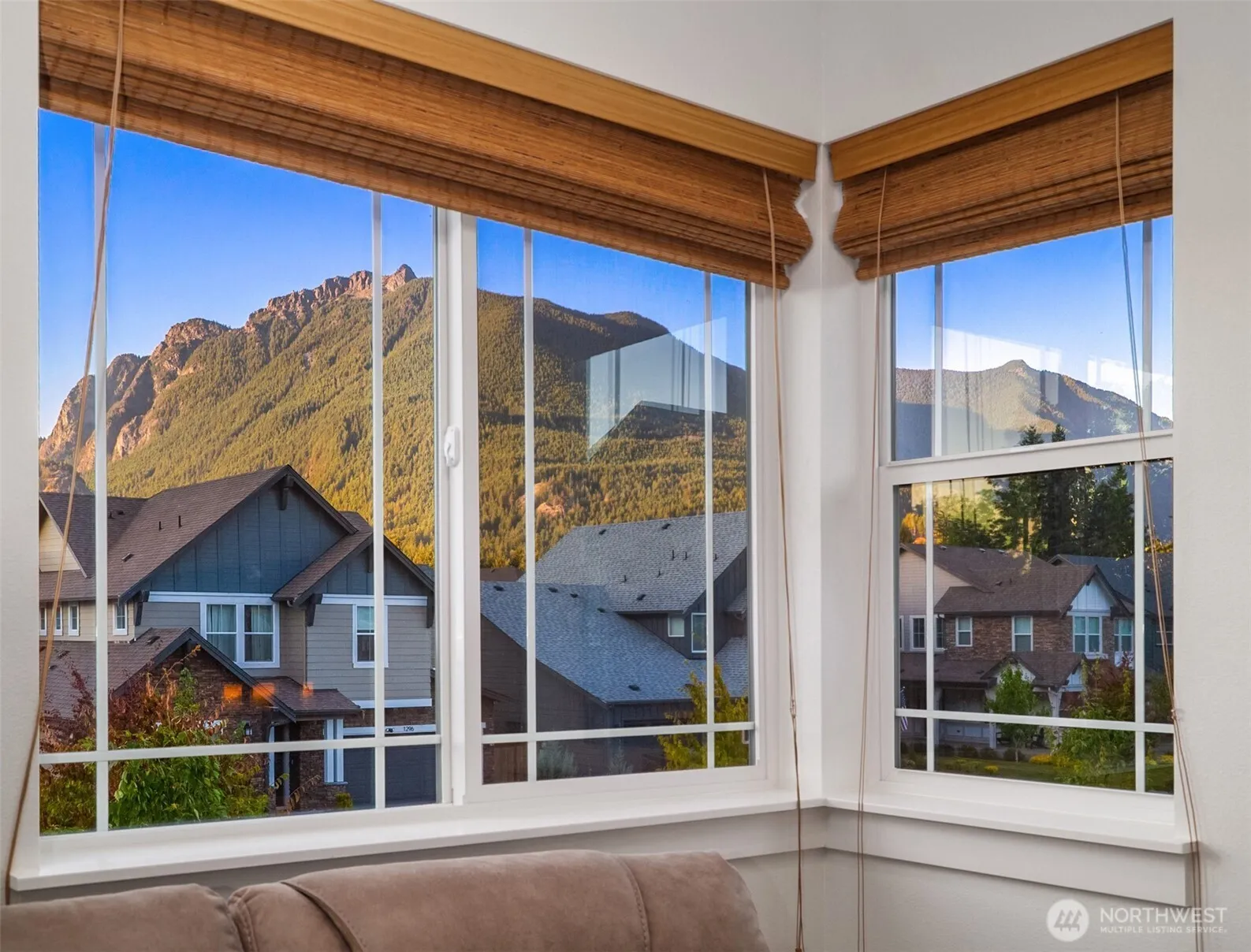 Better than new (2022 build) with premium upgrades, this North Bend home captures mountain views with a bright, open-concept layout. The custom gourmet kitchen features a large island and Belmont cabinetry, flowing into the great room. A main-level bedroom, den/office, and nearby ¾ bath provide ideal guest or flex space. Upstairs, 8-foot doors open to the primary suite with custom closets and a spa-inspired bath. Smart upgrades include motorized blinds, smart lighting, security system, and automated irrigation. Fully fenced backyard is perfect for outdoor living. Central A/C for year-round comfort. Minutes to parks, trails, downtown, and I-90 for quick access to Seattle, Bellevue, and Eastside tech hubs. Desirable Snoqualmie Valley Schools.