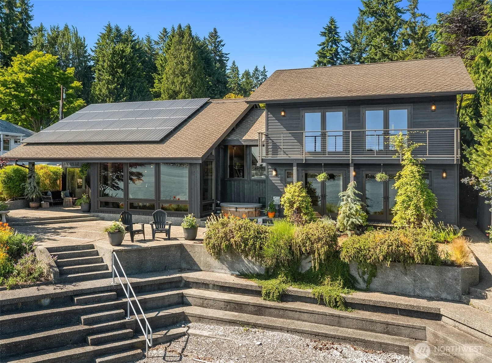 Located on desirable Quartermaster Drive, this 1.47 acre estate stretches from street to shoreline, capturing breathtaking 180-degree views of Mt. Rainier and the harbor, all bathed in coveted southern light. A grand maple, orchard, and flower gardens set the tone for elegance. Inside, soaring ceilings and walls of glass frame the view with open concept living, while the primary suite offers a private balcony and spa-like bath. French doors in guest rooms open directly to the shoreline. A stylish flex space/workshop enhances versatility. Amphitheater-style steps descend to 80 feet of pristine low-bank waterfront, complete with a swim dock, private buoy, and charming boathouse—offering the pinnacle of Pacific Northwest waterfront living.