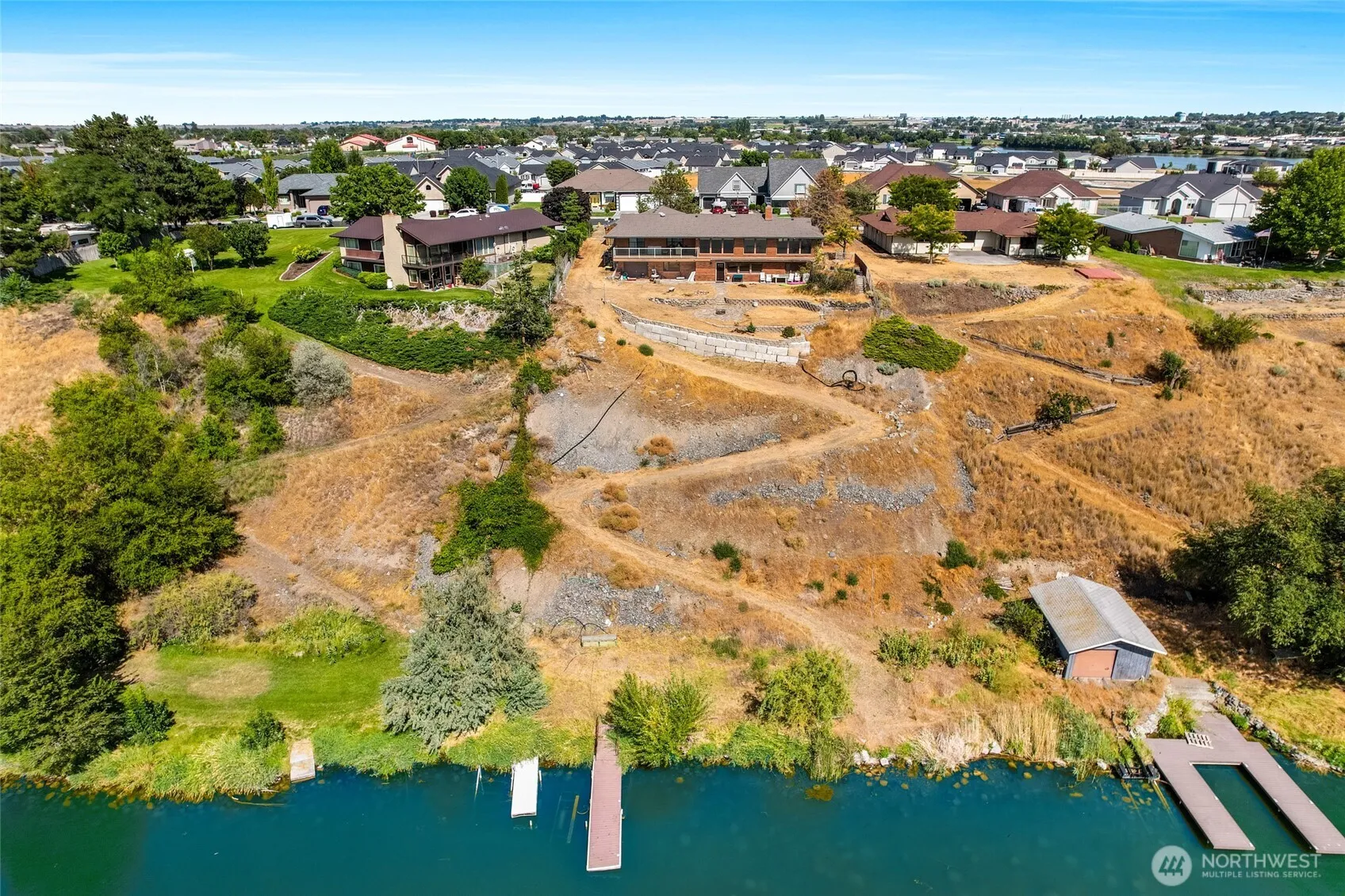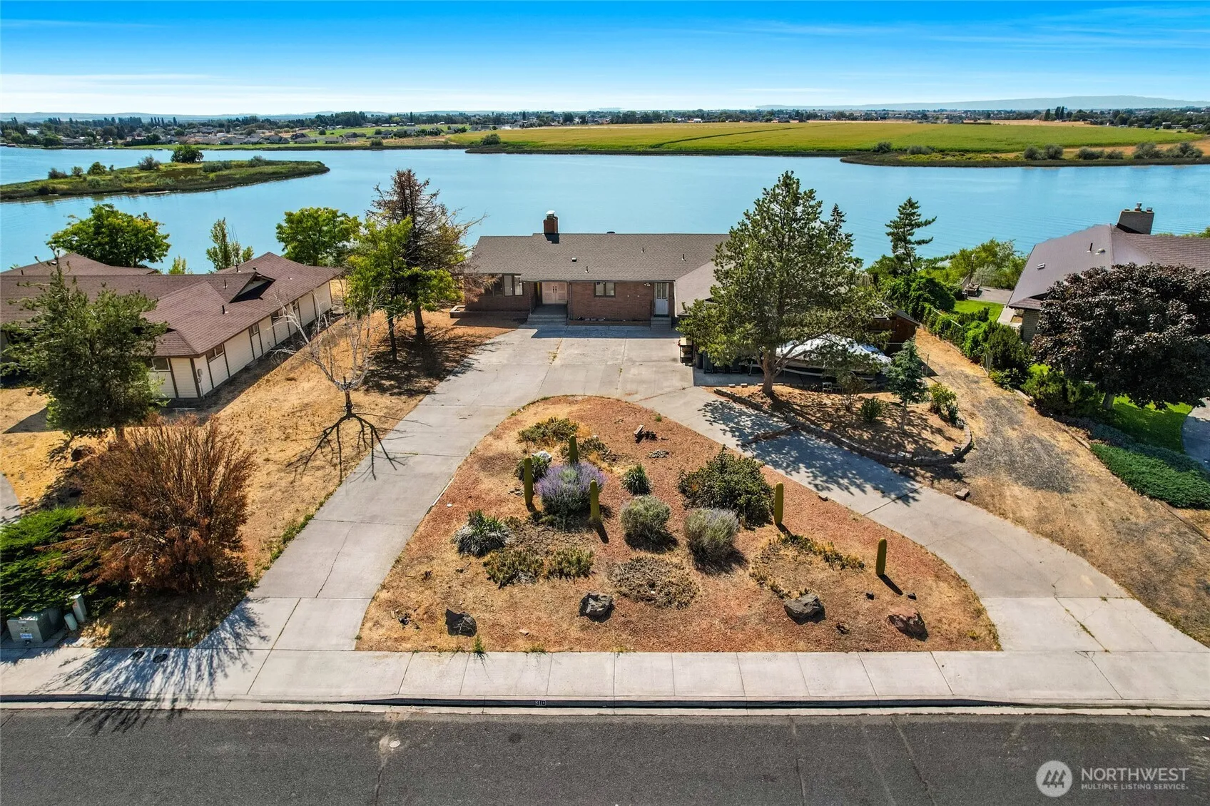 This home is a substantial, lakefront 5-bed, brick home built in 1981, featuring 3,471 sq ft, two kitchens, two garages (one on the daylight basement level), 2 fireplaces, 5 large bedrooms, 2 living rooms, bonus room, three baths, large walk-in pantry, new carpet in the main floor bedrooms, a hot tub with a covered patio, and a high efficiency Weatherton heat pump. The brick exterior and large lot (0.69 acres) includes great dock access and sweeping lakeview windows upstairs and down. Inside, you’ll find generous living spaces, primary suite, and upper deck with glass-in-railing features to enjoy the scenery. The front courtyard, circular driveway, RV parking, and electrical hookup are just a few more features to enjoy! Clean-up continues!