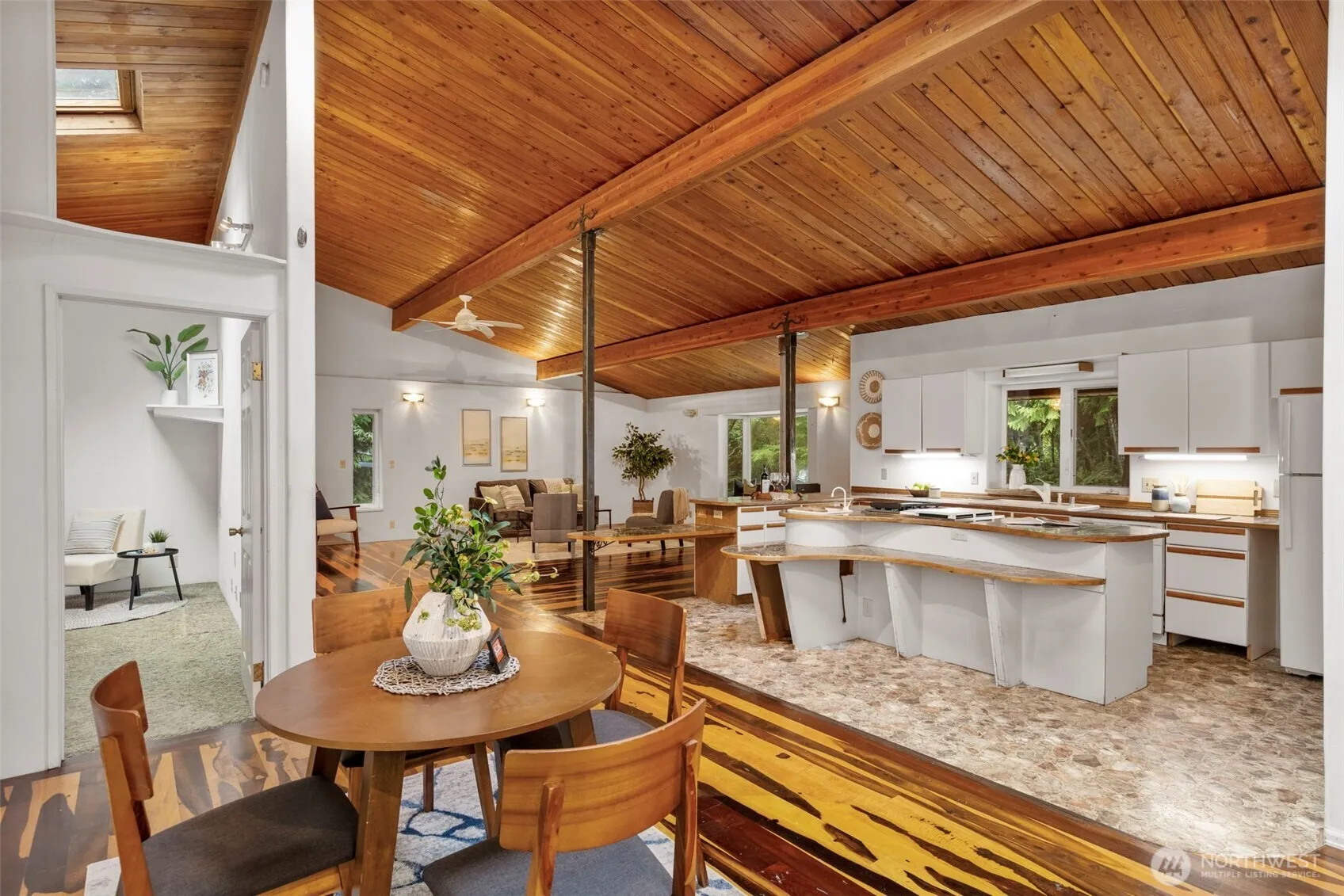 Amazing Poulsbo property with PLENTY of room to grow. Custom home is situated on just over 2 acres level land with mature trees with onsite septic and two party well and no HOA! Enjoy the security of a gated entry to your home. The home has an open manageable floorplan, custom iron work and floors and soaring tongue & groove vaulted ceilings. From the front door step into the great room area with dining looking out onto a covered patio area, living area with cozy wood burning stove and a window seat to enjoy the forest views, and a spacious and open kitchen with custom built island. Huge primary bedroom with access to patio area. Property has a huge shop and several outbuildings. Adjacent 2+ acres is also listed for sale. See MLS #2433611
