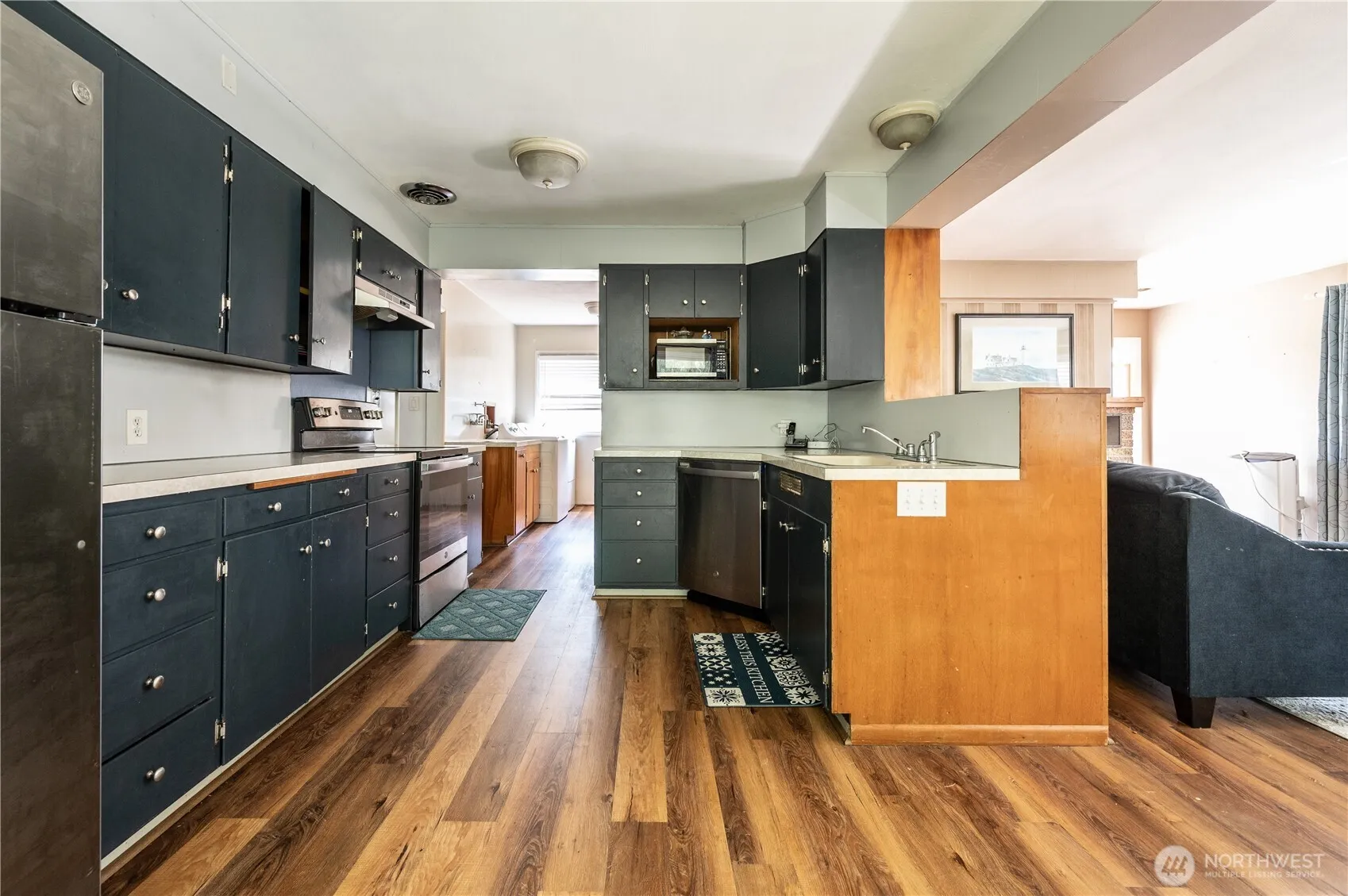 On nearly 3/4 acre in Central Park, this 3-bed, 1-bth home pairs mid-century character with thoughtful updates and is just a short walk to the grade school. The living room features a wood-burning fireplace, beautiful built-ins, while the kitchen stands out with navy cabinetry, stainless steel appliances. A separate large laundry space is located just off the kitchen with sink and cabinetry. The main level also includes the 3 comfortable bedrooms & full bath w/ double sinks. Downstairs has a one-car garage & unfinished space ideal for hobbies, storage, & workshop. Outdoors, a large deck looks out over a babbling creek and a wooded backdrop, with RV parking in the upper yard. The furnace was rebuilt in February 2025.