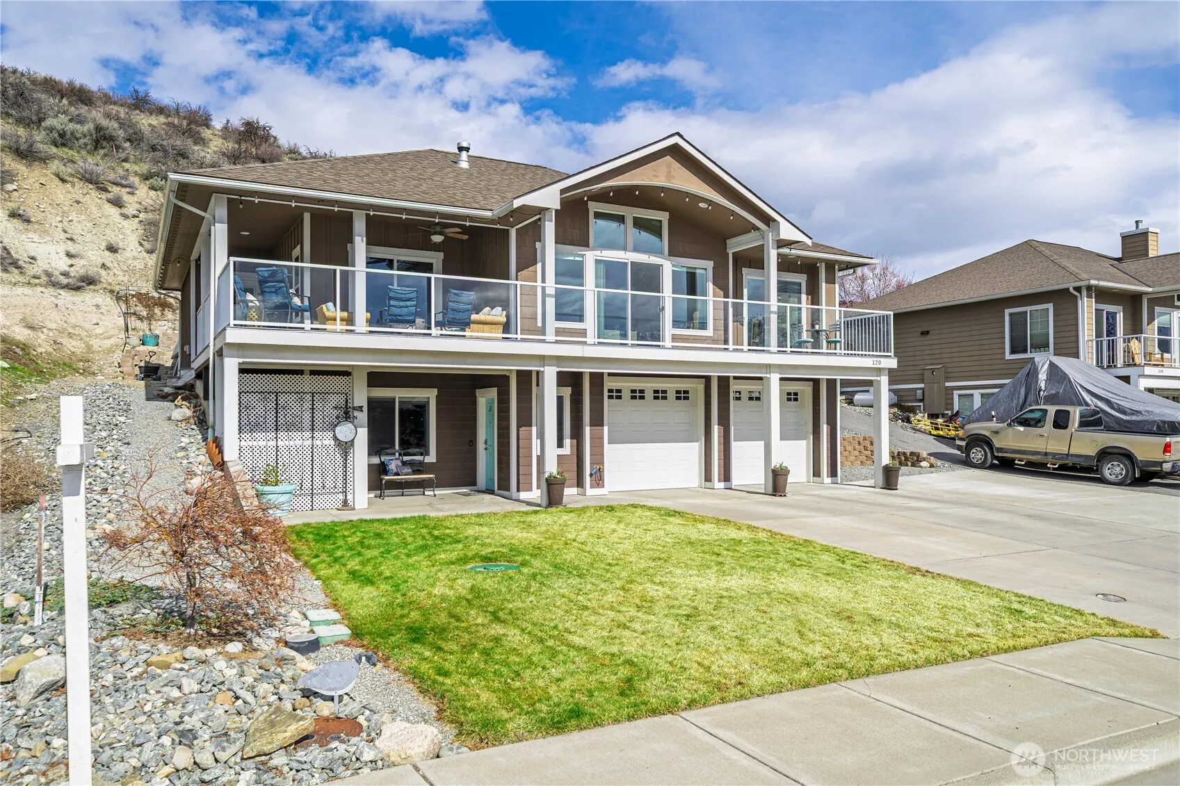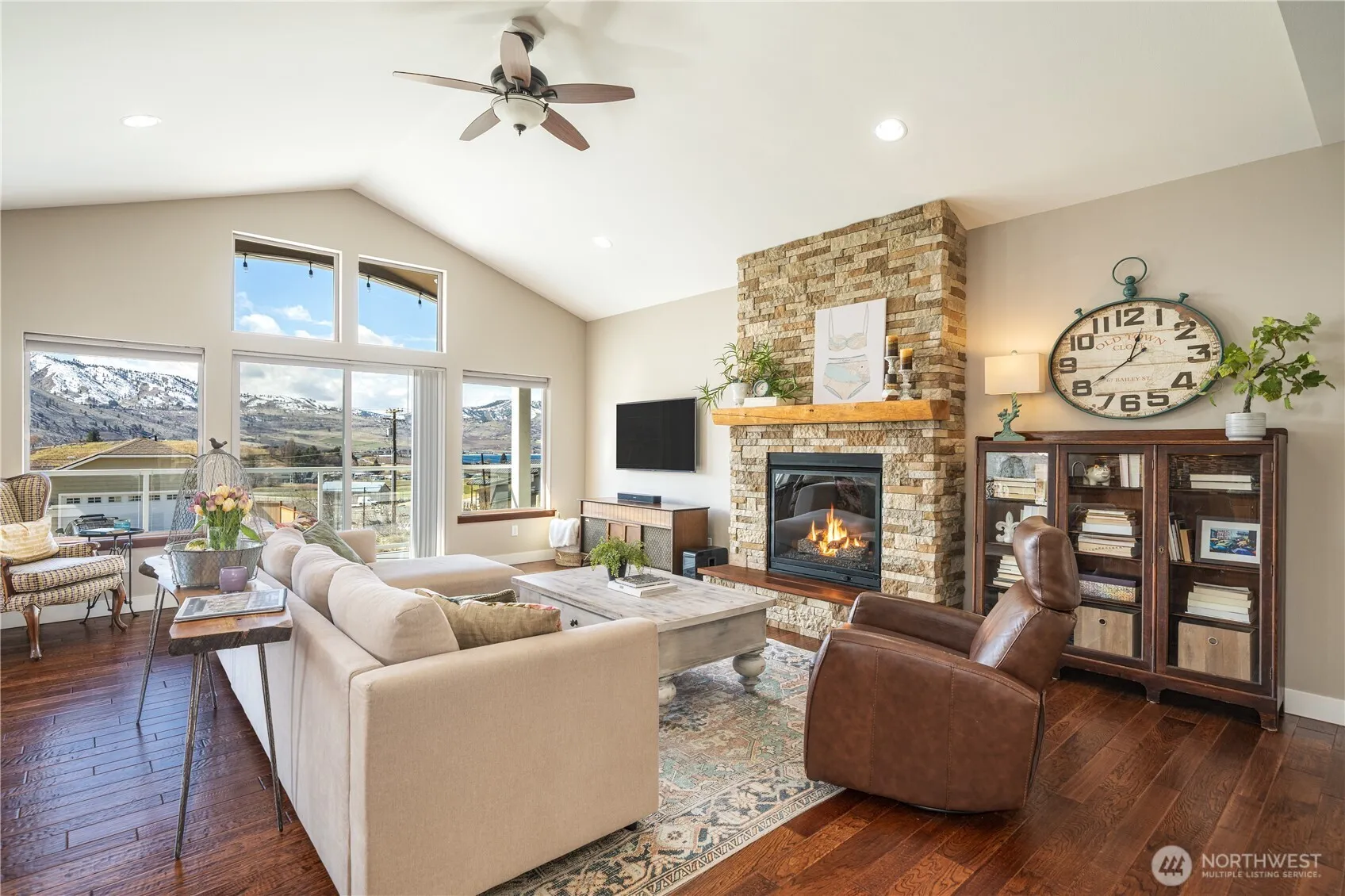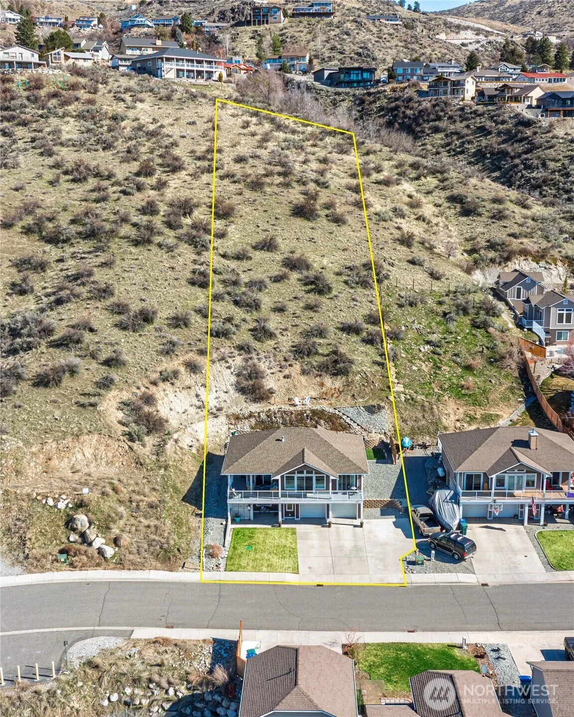 A close to town VIEW home, expansive great room, soaring ceilings, wood floors & oversized windows for panoramic views of the Lake & buttes. Flooded with natural light. The kitchen; stainless appliances, granite, a big prep island & walk in pantry, a breakfast bar & ample cabinet space. Off the kitchen; 3/4 bath, laundry & access to the back yard CAL spool & faux grass. Spacious primary with a private balcony to soak in the tranquil lake scenery, office space, 2 closets & a luxe bath. Lower level for guests & play in the bonus alcove +2 bdrms, a stylish full bath & storage. Outdoors include a large deck & A fun yard that provide the perfect space for friends or quiet evenings watching sunsets. Near town & the Comm Center! Develop the back!