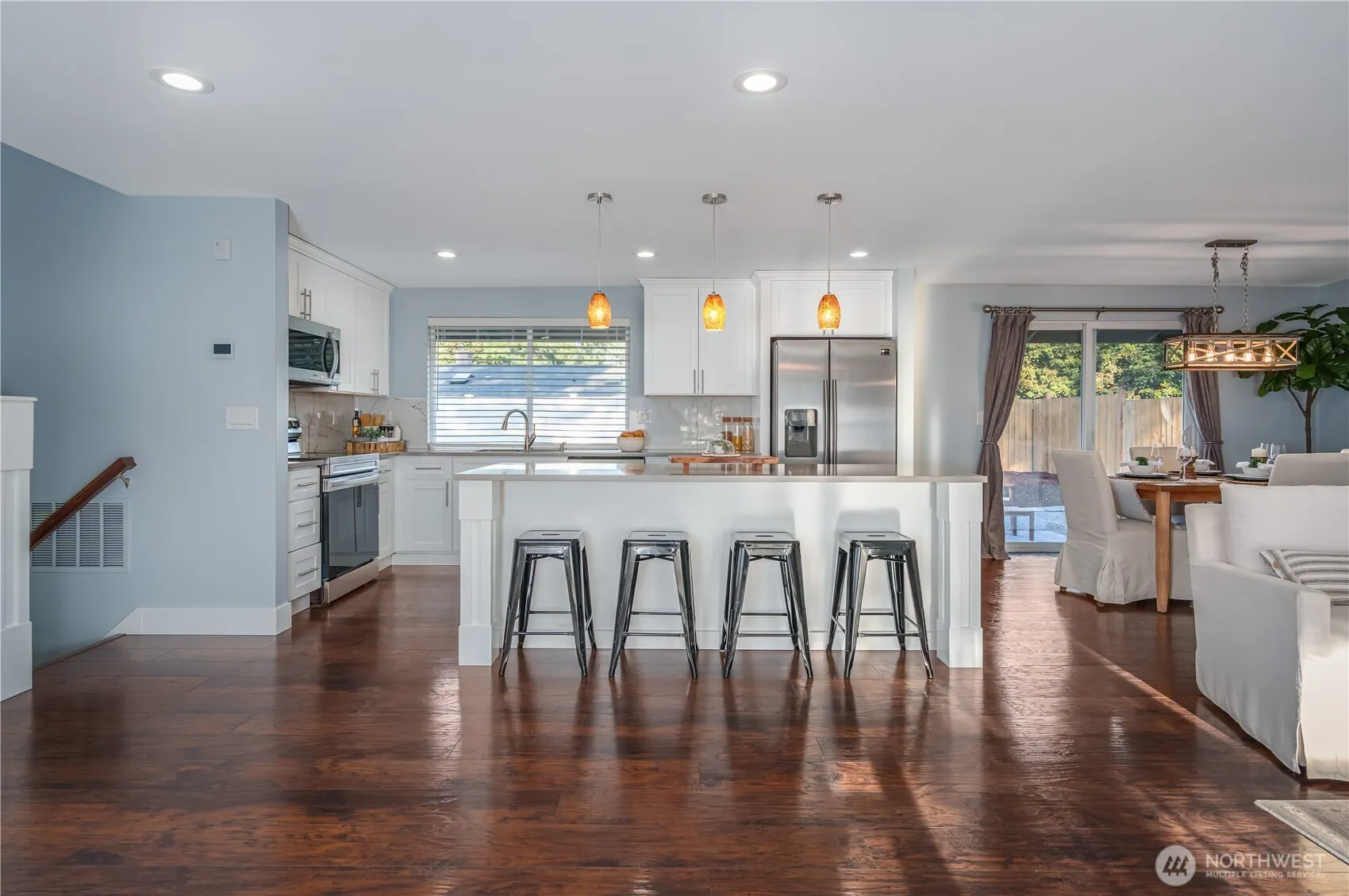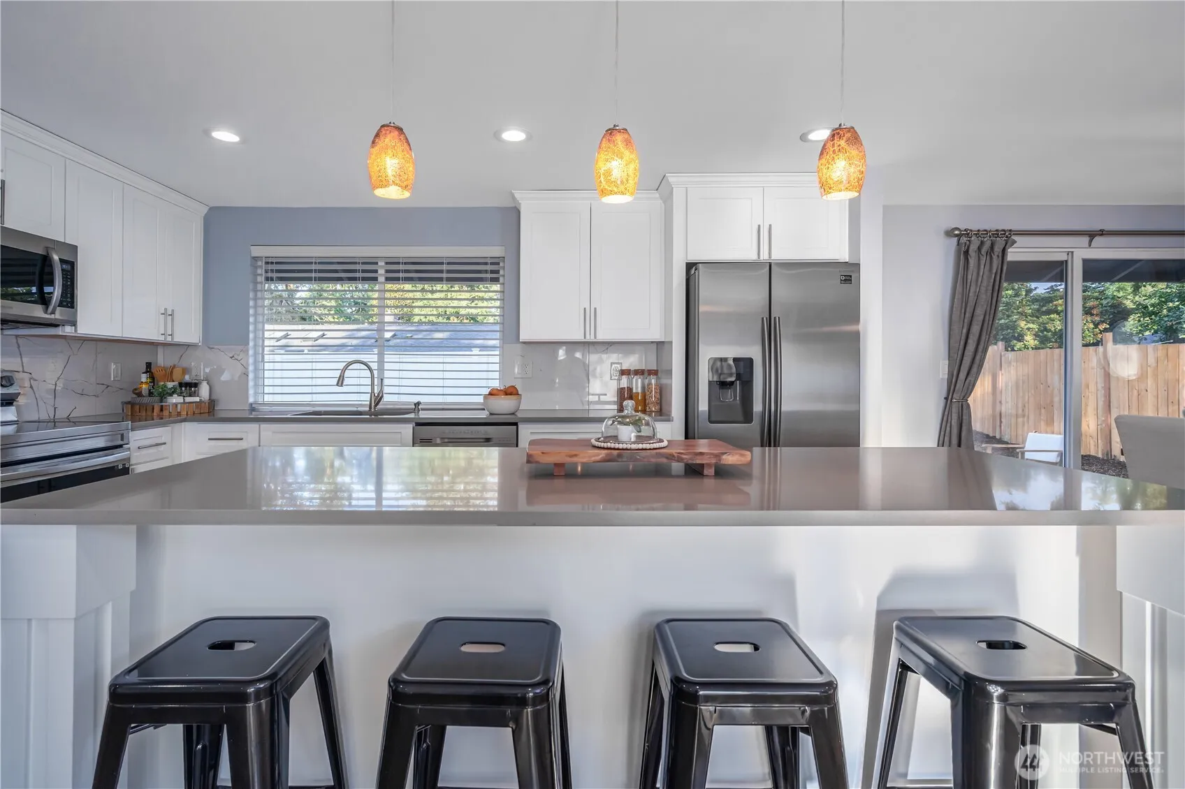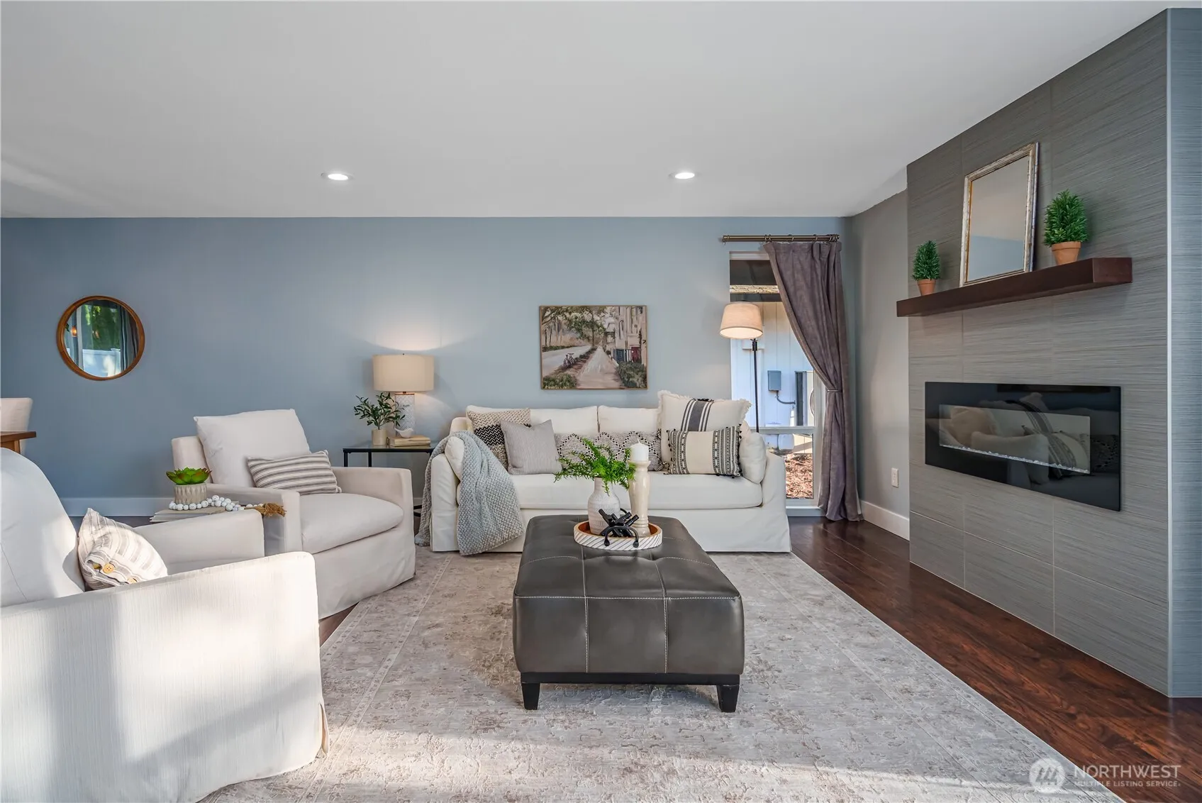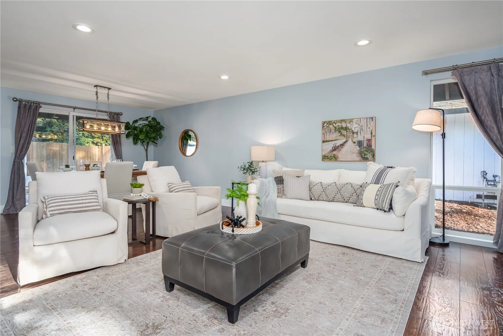 Tucked within the serene Oakbrook golf course community, this beautifully appointed tri-level home exudes luxury & offers a versatile layout ideal for multi-generational living. You’ll love the curb appeal on a quiet cul-de-sac ending at the rich greens of the course. Step inside to an open-concept design w/gleaming floors, quartz counters, white cabinets & trim, designer lighting & a sleek, modern fireplace. Upstairs: 3 bedrooms incl. spacious primary w/ensuite bath & walk-in closet. Downstairs: laundry, family room, extra bedroom, ¾ bath & access to an oversized 2-car garage. Private, fenced backyard w/expansive patio, new storage shed. New furnace, A/C, H20 heater, roof w/in last 3 years! No HOA! Close to JBLM, Ft. Steilacoom, I-5!