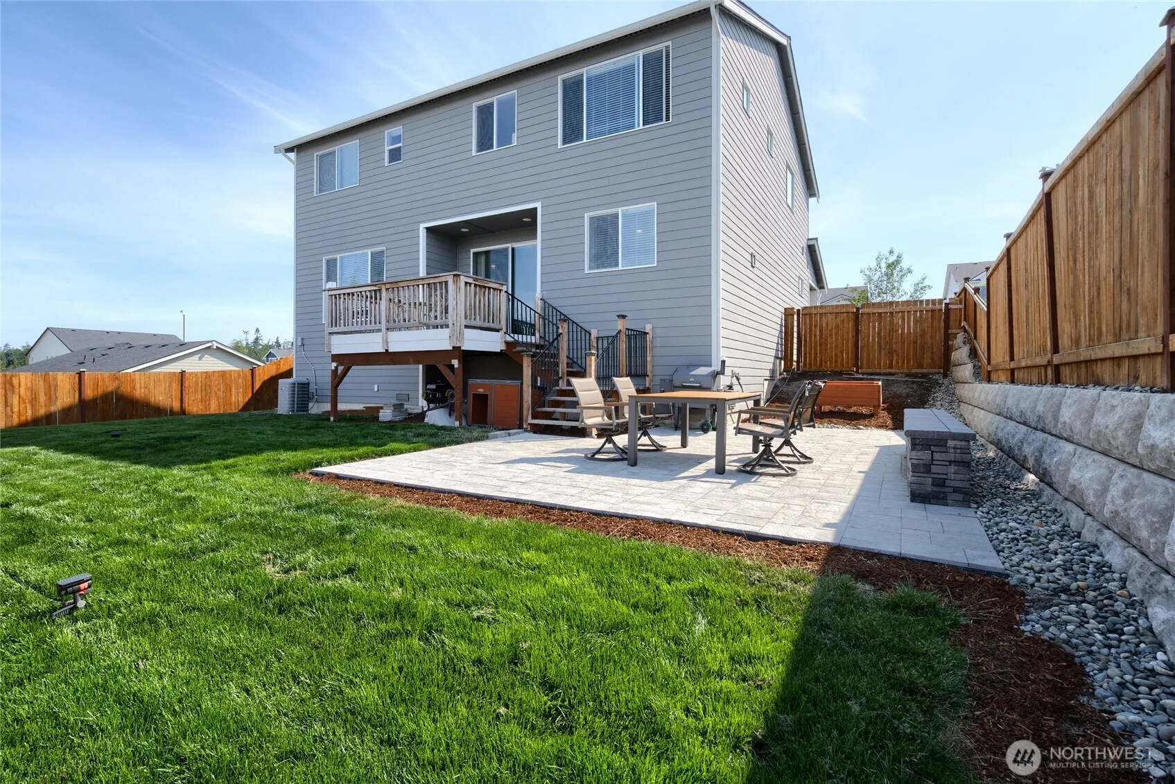 Chandler’s Reserve in Stanwood location. The “Stevenson” floor plan with 3- car garage, is a spacious 2700 sq ft floor plan designed for modern living, with a convenient first floor office and open layout among the well equipped kitchen, Great Room and dining area. Upstairs is a bonus room surrounded by all 4 bedrooms, including the owner’s suite with spa-like bathroom and walk-in closet. Interior features include hardwood on the main floor, quartz countertops in the kitchen & primary suite, dishwasher, microwave, oven, side by side refer and blinds. Backyard features deck off the kitchen with stairs to fully fenced extra large flat yard with new patio and sitting wall, perfect for entertaining. Garage has dedicated outlet for EV.