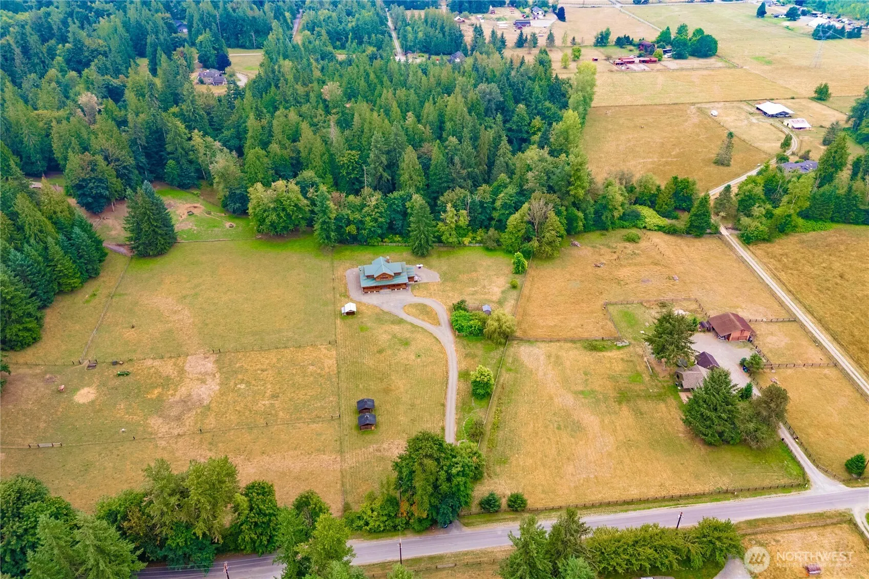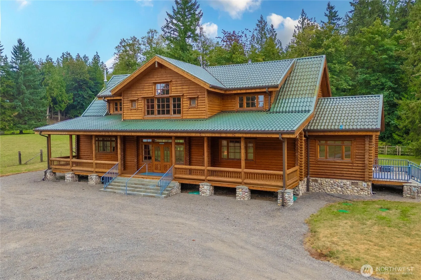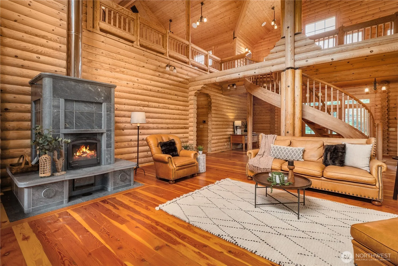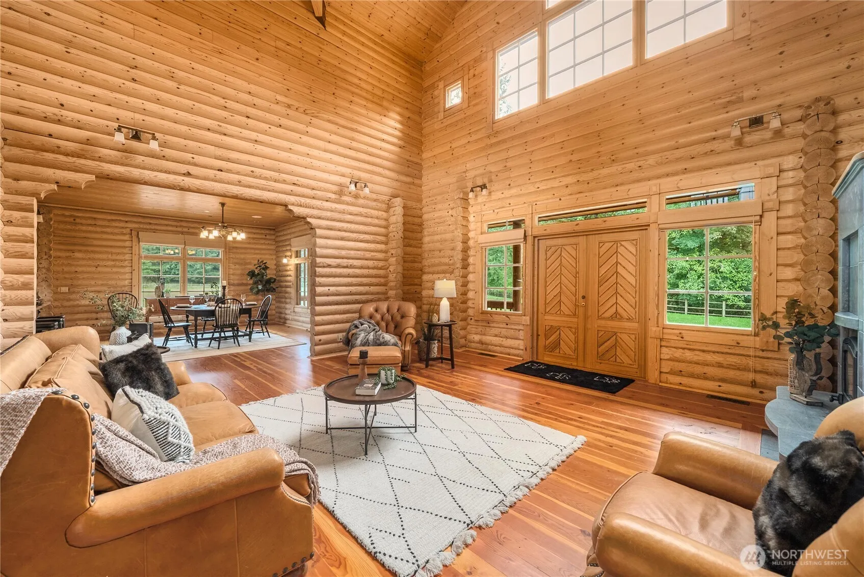 Beauty unfolds in this one-of-a-kind Honka log home! Experience true PNW living with magnificent details at every turn. The chef’s kitchen boasts an AGA stove, 2 islands, 2 dishwashers & more—perfect for culinary creativity. Gorgeous wood floors, a spiral staircase & thoughtful design bring warmth and privacy throughout. Main floor living includes a spacious primary suite with a full ensuite & territorial views, plus a guest room and bath. Upstairs offers another private guest suite, office & entertaining space. Enjoy stunning front & back porches, a lush 9-acre retreat with room for horses, cows, hobby farming & private trails, & peaceful creek. A rare gem where harmony & beauty meet!