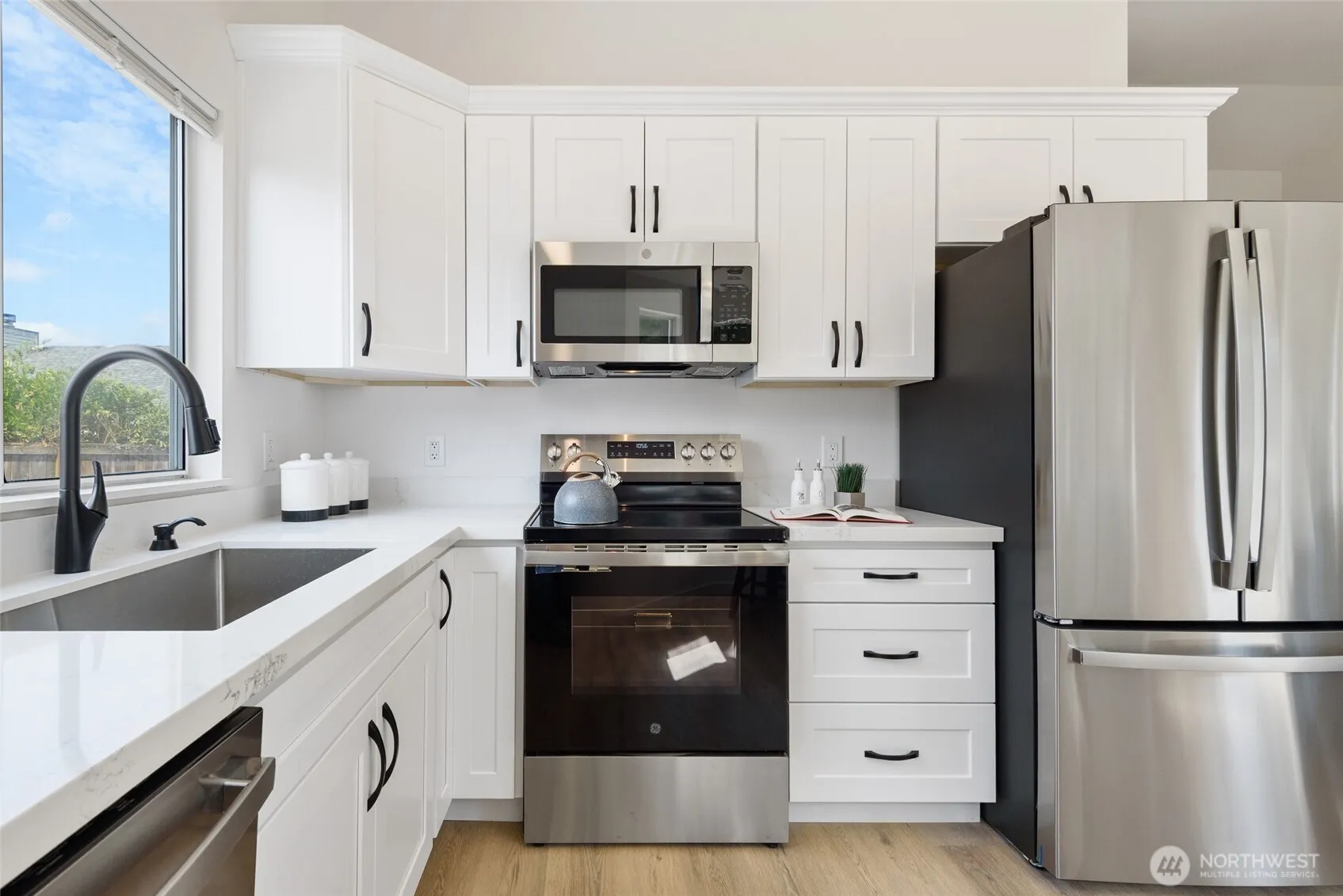 Extensively remodeled and truly move in ready! Gorgeous 3 bed, 1 ¾ bath rambler in highly desirable Madrona Meadows neighborhood. Stunning new kitchen features quartz countertops, stainless-steel appliances, and new cabinetry opening to a cozy family room with gas fireplace. Additional recent updates include beautiful new baths, new millwork & doors, fresh interior/exterior paint, new vinyl plank flooring, new gas furnace, and newer roof. Vaulted ceilings & large windows fill the living/dining area with natural light. Spacious primary suite features a private bath & walk-in closet. Located on a partial cul-de-sac with a huge fully fenced backyard, perfect for entertaining. Close to freeways, transit, shopping, restaurants, parks & schools.