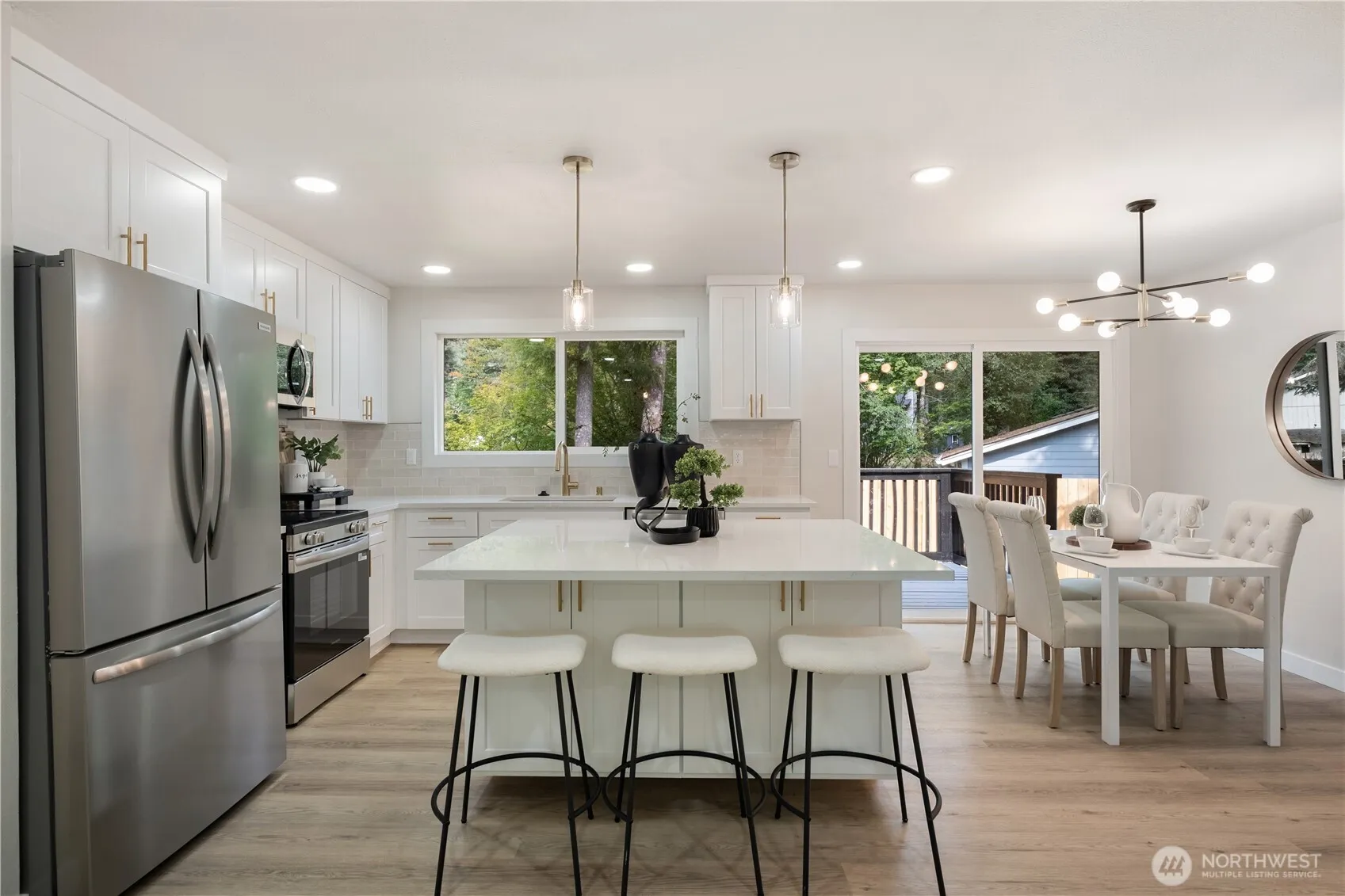 Beautifully updated 3-bedroom, 2-bath rambler on a fully fenced 1/4-acre corner lot in the desirable Wilderness Rim neighborhood. This 1,200 sq ft home features a brand new roof, brand new kitchen with quartz countertops, tile backsplash, new cabinets, sink, and durable LVP flooring. Enjoy the peaceful setting just a 3-minute walk to Brewster Lake with its covered picnic area, playground, BBQs, and fire pit. Rattlesnake Lake and hiking trails are only 5 minutes away, and downtown Bellevue is a convenient 25-minute drive. Perfect blend of modern comfort and outdoor adventure in a quiet, sought-after community.