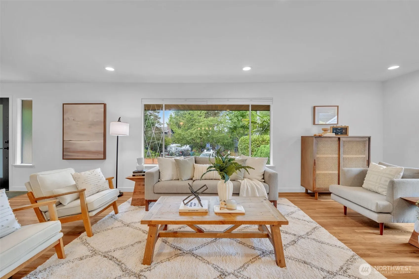 Rare Richmond Beach Rambler! Located in a quiet cul-de-sac just a short walk from Syre Elementary, this fully remodeled, light-filled single-story home offers 3 bedrooms, 3 bathrooms, and an oversized 4-car garage + flex space. Step inside to original red oak hardwood floors, an open-concept kitchen, living, and dining area, highlighted by a stunning 8-foot island, gas range, quartz countertops, and all-new appliances. The primary suite features a beautifully remodeled bathroom with mid-century modern shower and vanity. The detached garage + flex space is finished with epoxy floors, heating and cooling, and laundry hookups—perfect for a home gym, office, workshop. Welcome home to Richmond Beach living at its finest!