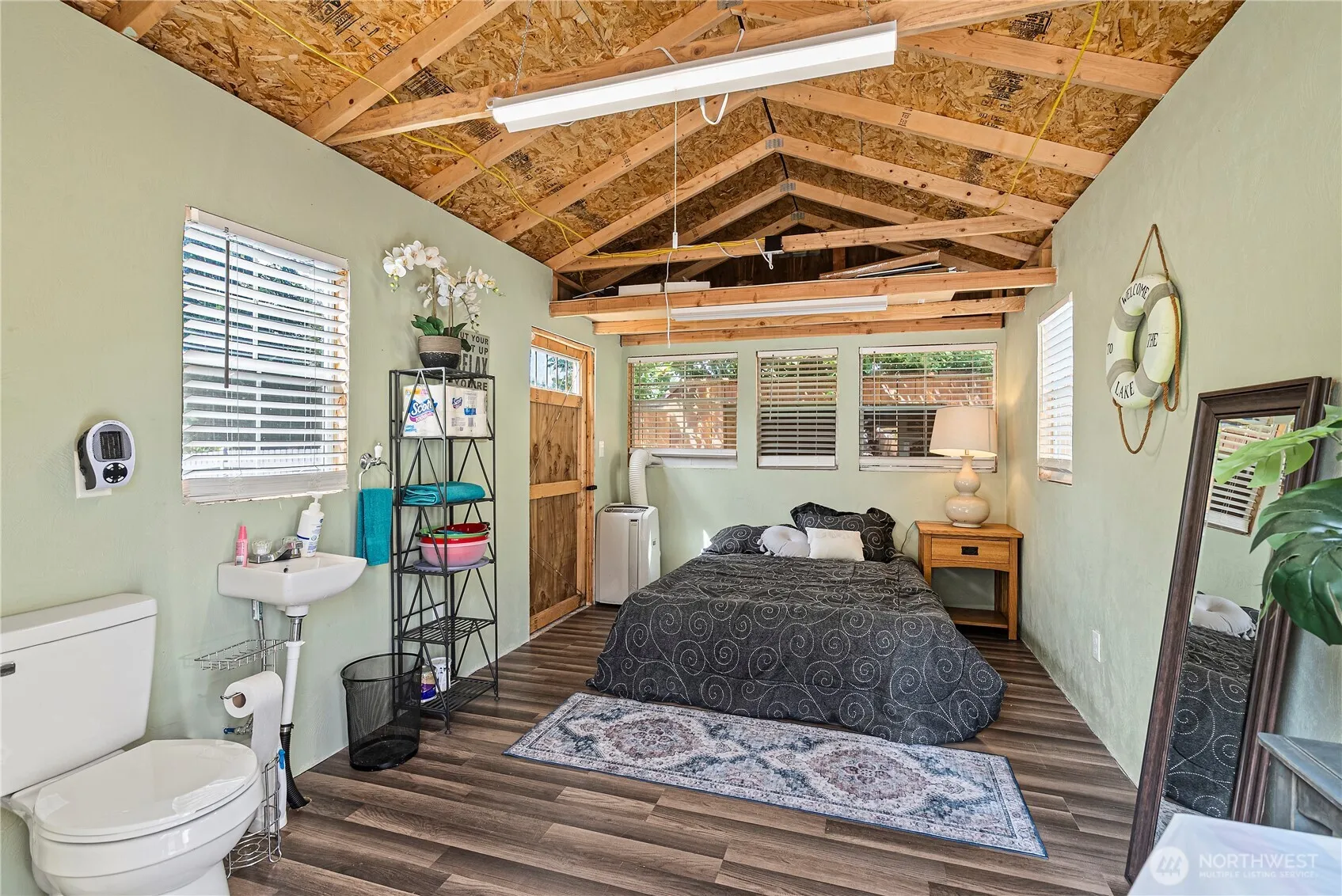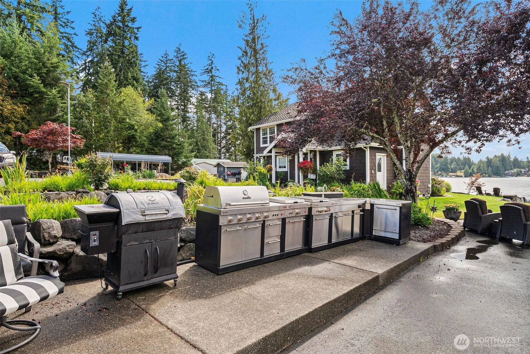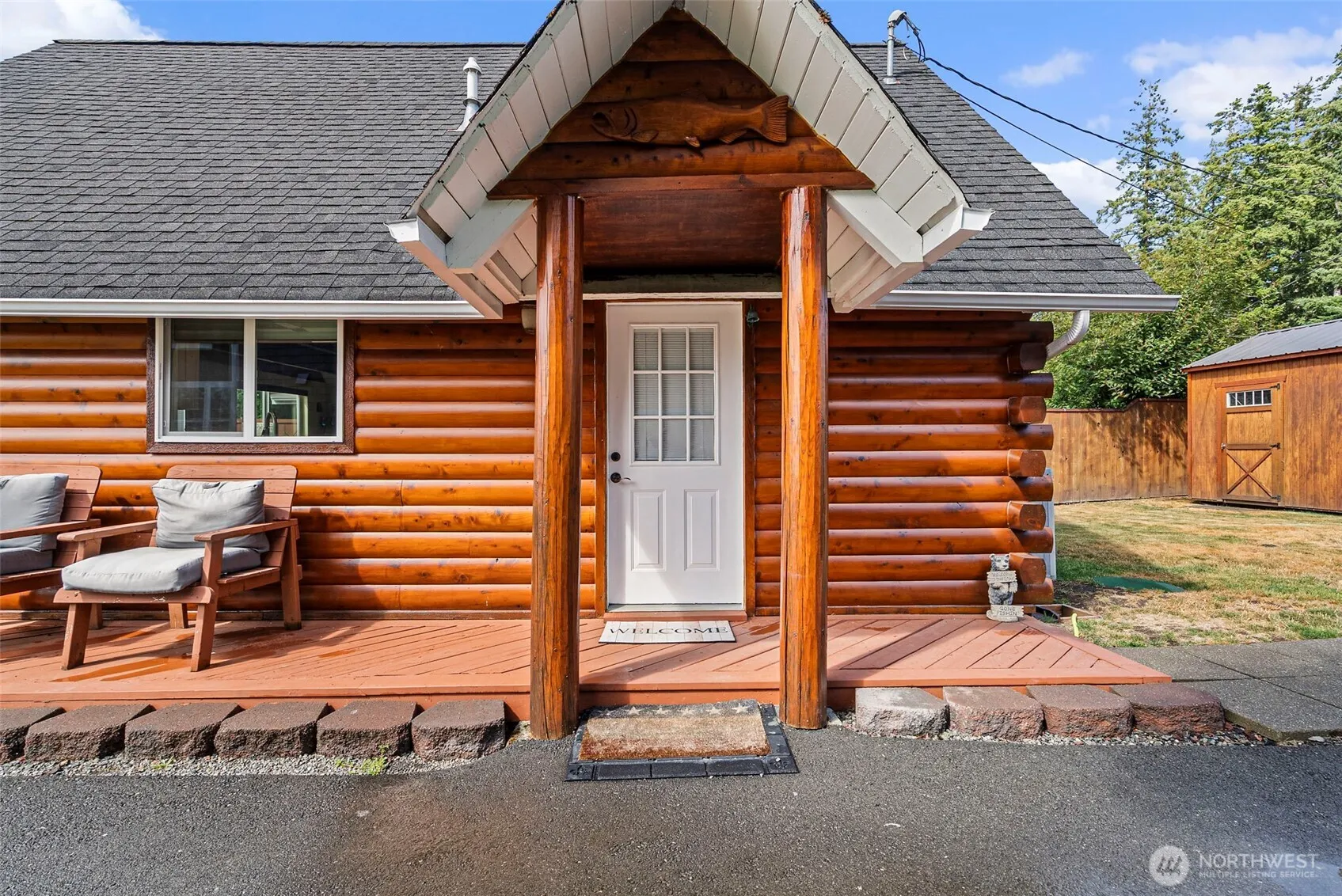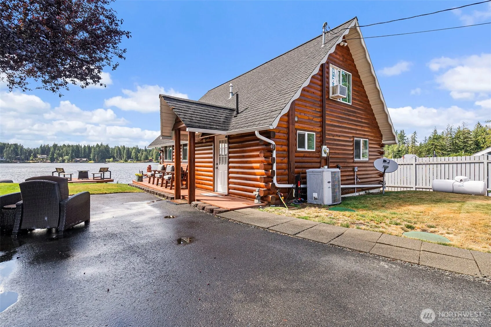 Charming log-sided lakefront home with 61 feet of low-bank waterfront, private dock, and boat house! This 2-bedroom home features an open loft with space to another room or create a stunning primary suite. Enjoy a spacious deck and built-in outdoor kitchen—perfect for entertaining. A finished shed serves as a cozy guest room. Ample parking includes a 2-car garage, 2 carports (fits 4 vehicles), and a 1,050 sq ft shop with 3 bays—lift can convey with full-price offer. Plenty of room for your water toys and hobbies. Experience the best of lakefront living!