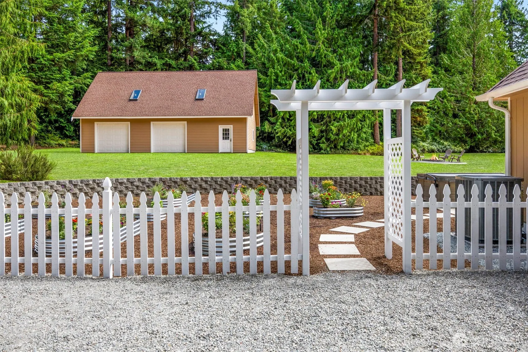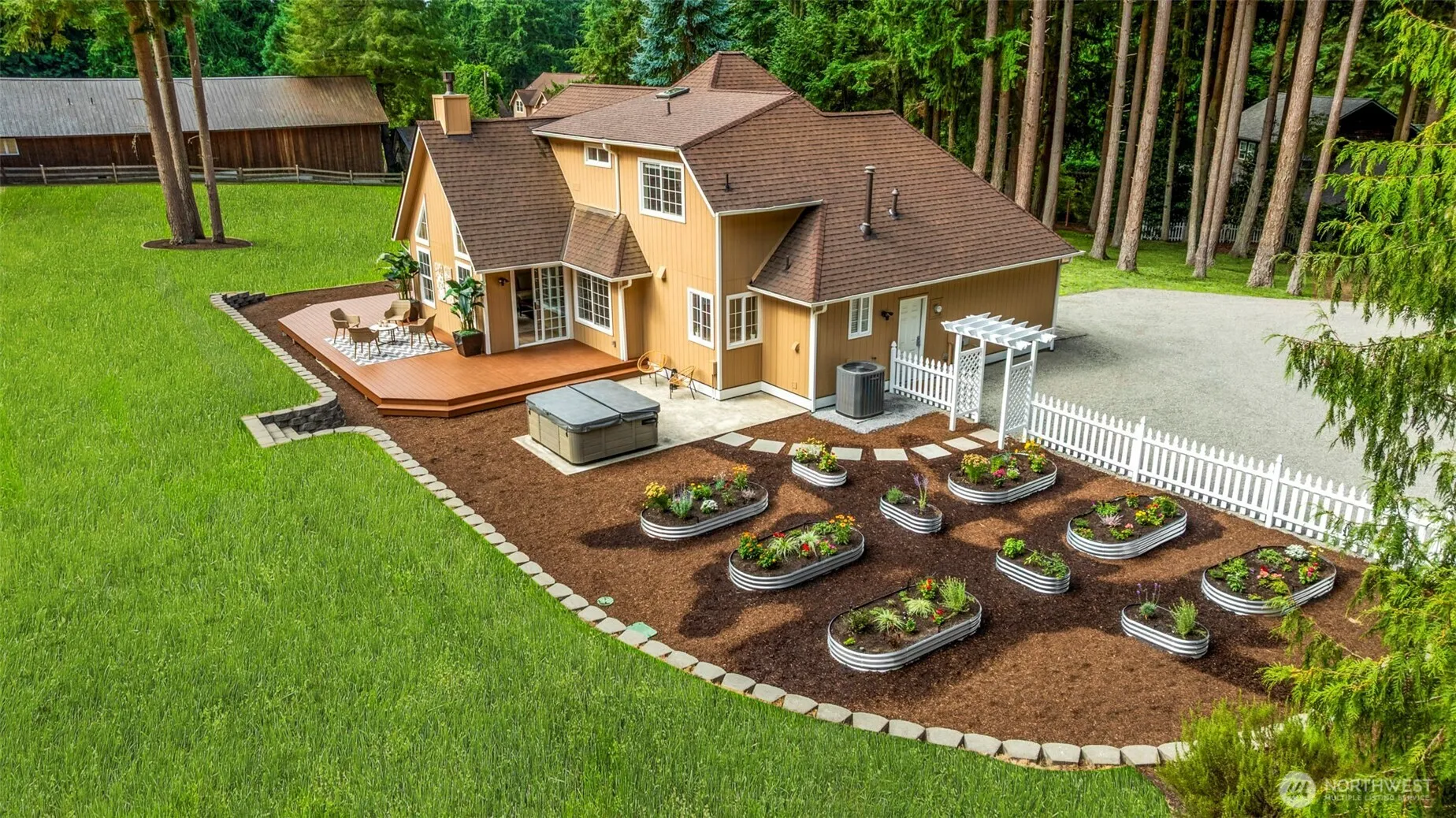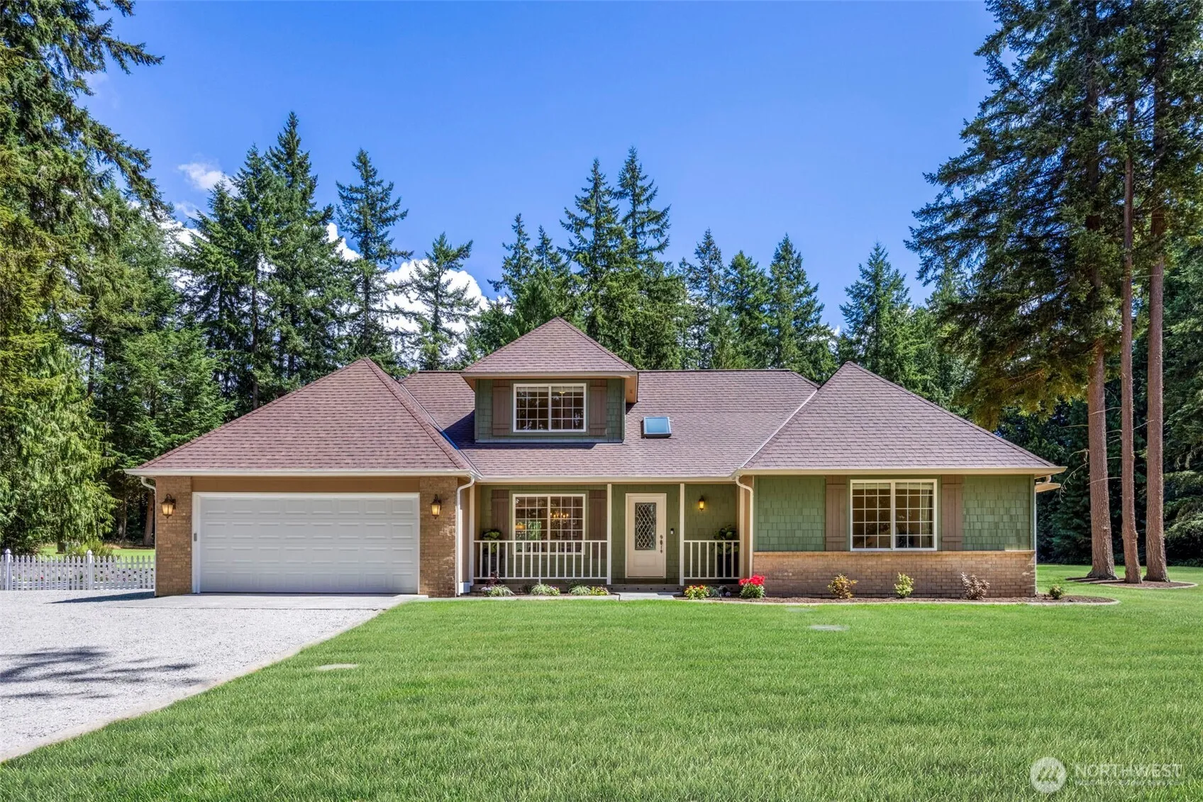 A Whidbey Island Estate with Storybook Charm. Two acres, private and peaceful with a lovely backdrop of evergreens. Outdoor living with a white picket fence, new deck overlooking the hot tub & immaculate garden beds. A covered front porch welcomes you to this exceptional retreat. Completely renovated throughout with designer finishes and high-end upgrades. A beautiful expansive great room with a dramatic vaulted ceiling is the heart of the home. Chefs kitchen with granite counters. Main floor living includes a primary suite and a guest bedroom with a bath. Two bedrooms upstairs feature a full bath. Discover the detached shop with an unfinished upstairs offering many possibilities. Enjoy Island Living. Fiber-optic internet!