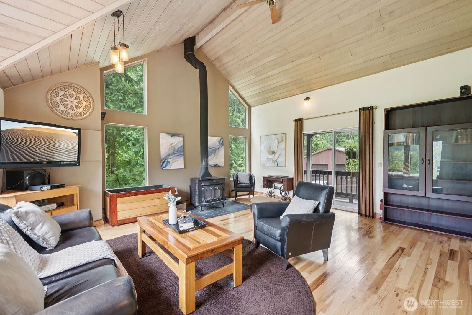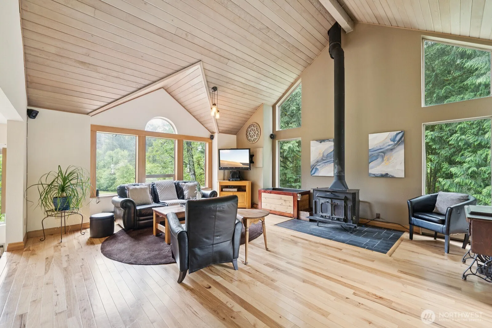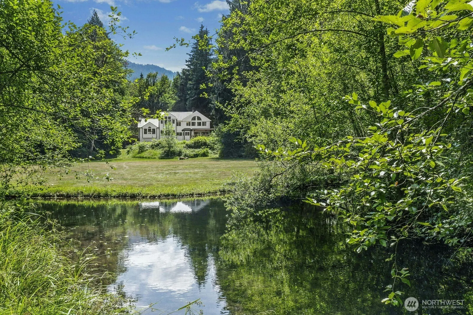 Live, work, and play from this private 7+ acre retreat in North Bend. Offers a rare blend of nature, comfort & functionality. Explore the private pond, meadow & access to Christmas Creek—perfect for nature lovers & outdoor living. Inside, vaulted ceilings, hickory hardwoods, & oversized windows invite warmth & light throughout. Two cozy wood fireplaces enhance the ambiance. Updated kitchen includes granite counters, SS appliances, a farmhouse sink. Two dedicated offices offer flexible work or creative space. Step outside to a huge deck & covered balcony ideal for entertaining. A 2-car garage with workshop & a 30’x40′ heated, air conditioned, & insulated shop provide storage, workspace, or business potential. Freshly Painted Exterior.