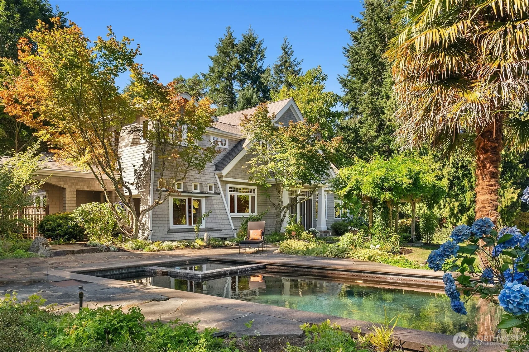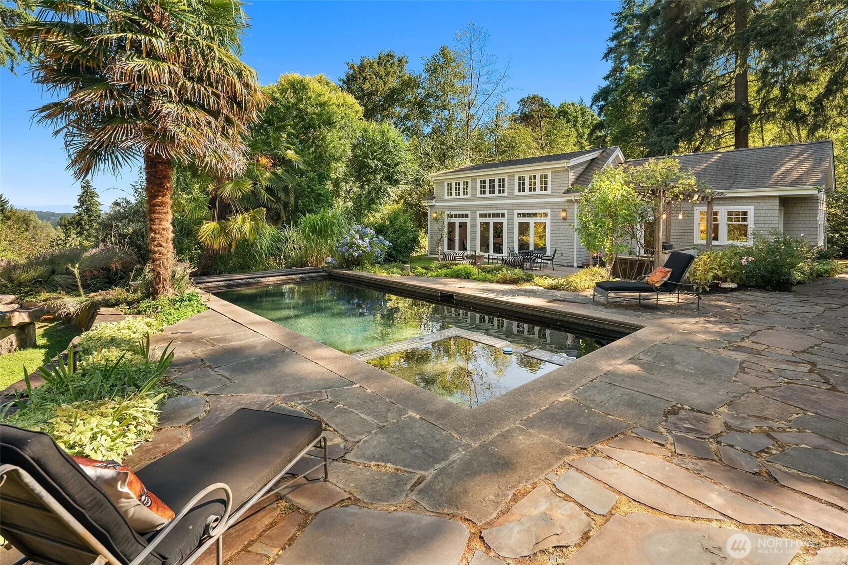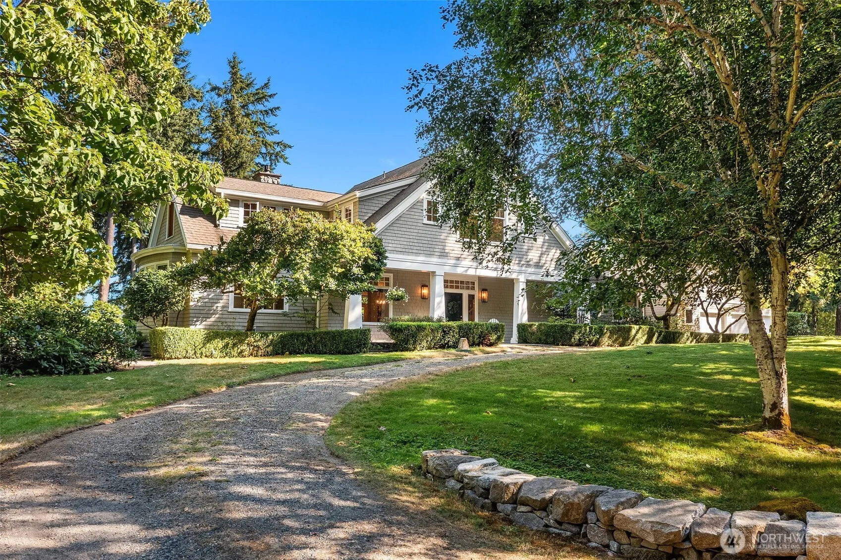 At the quiet crest of Burton Hill, where Mount Rainier rises over the heritage orchard, a custom Cape Cod retreat awaits. Framed by stone paths, wisteria, and gardens in full bloom, this estate blends timeless craftsmanship with rare livability. Sun-washed rooms open to sweeping views; French doors lead to patios, a stone-tiled in-ground pool, hot tub, and outdoor kitchen. The primary suite offers a private balcony and en-suite featuring Carrara marble. The 1,012-sq-ft studio/poolhouse with kitchen and full bath doubles as a guest haven, and a vaulted bonus room above the heated three-car garage adds versatility. With artisanal built-ins, radiant heat, and a private end-of-road setting, this is one of Vashon’s most treasured addresses.