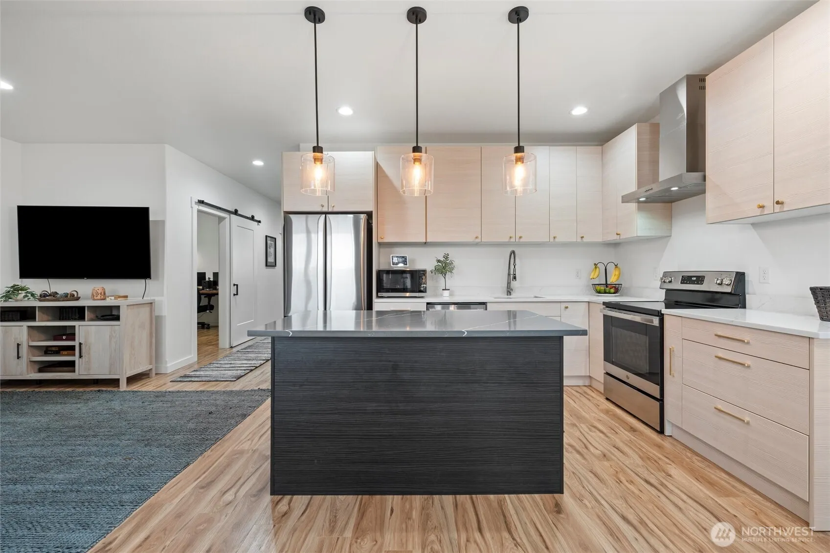Gorgeous modern custom 3-bedroom, 2-bath home just under 1,500 square feet, ideally located near the lake. This thoughtfully designed home features striking modern architecture and a beautiful kitchen complete with quartz countertops, stainless steel appliances, and stylish cabinetry with gold hardware. Enjoy a dedicated office space, ample storage, and upgraded touches throughout—like ceiling fans, modern lighting, and tile/LVP flooring. The spacious primary suite includes a luxurious bathroom with heated tile floors, tiled shower walls, and a walk-in closet. Step outside to a cozy covered back patio, perfect for relaxing, plus a fenced yard and low-maintenance front landscaping for easy care and curb appeal.