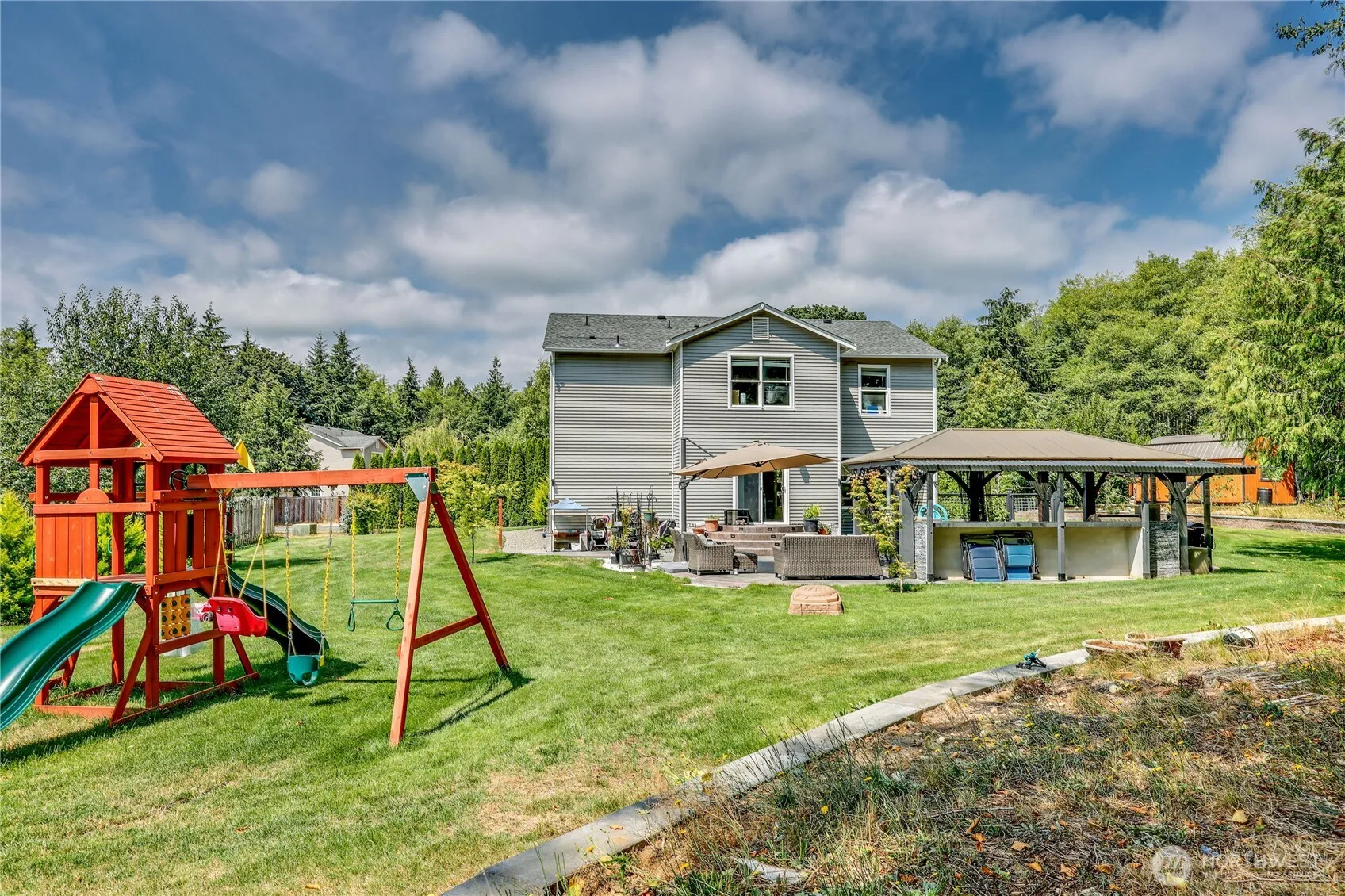 Tucked in the very back of this quiet neighborhood you will find this lovely home that shines with pride of ownership. The exterior has to be seen to take in how beautiful it is! Large flat lawn, fruit trees & plants abound, concrete patio, custom cabana with exterior kitchen, hot tub, in-ground irrigation, lighting & ample parking. Inside large windows have been added in the front & back of main floor for lots of natural light. Kitchen has eat-in space and a large pantry/utility room offers tons of storage. There is an extra-large primary room, ensuite & walk-in closet, 2 bedrooms, hall bathroom & an additional office/den. Ideal central location to life/business in both Kitsap or Jefferson Counties.