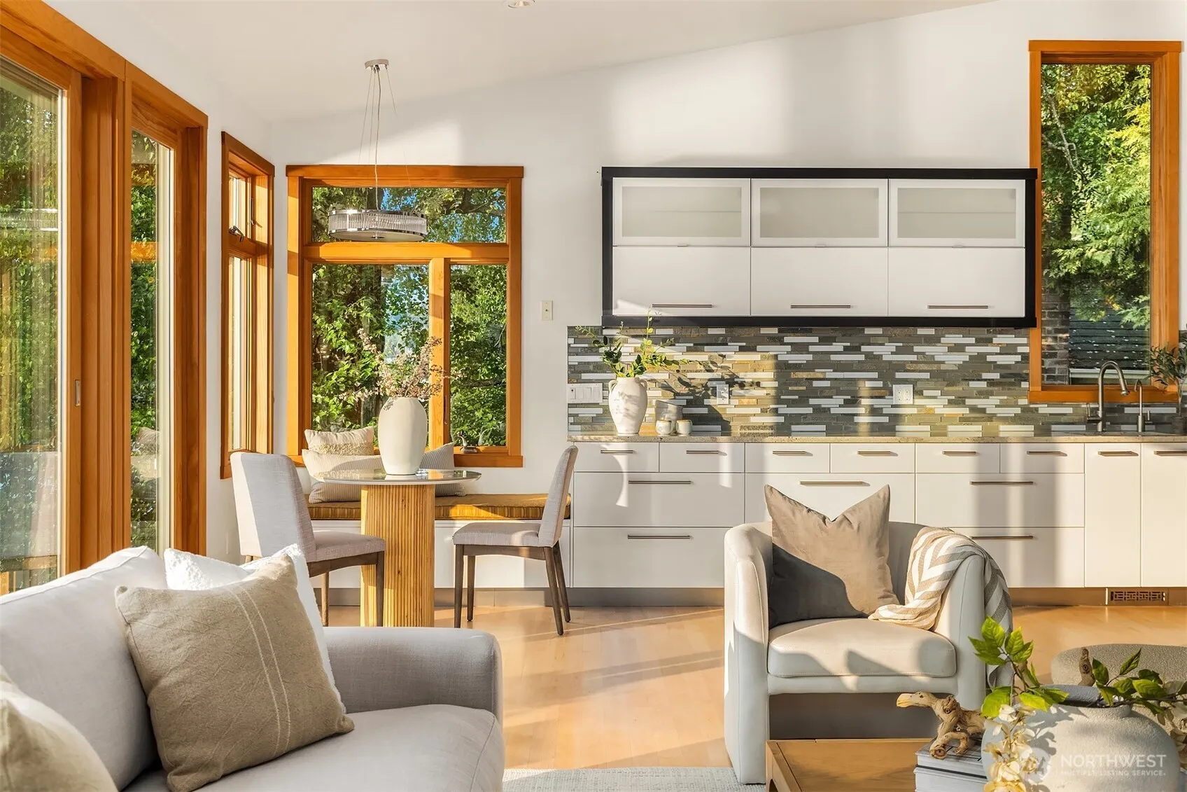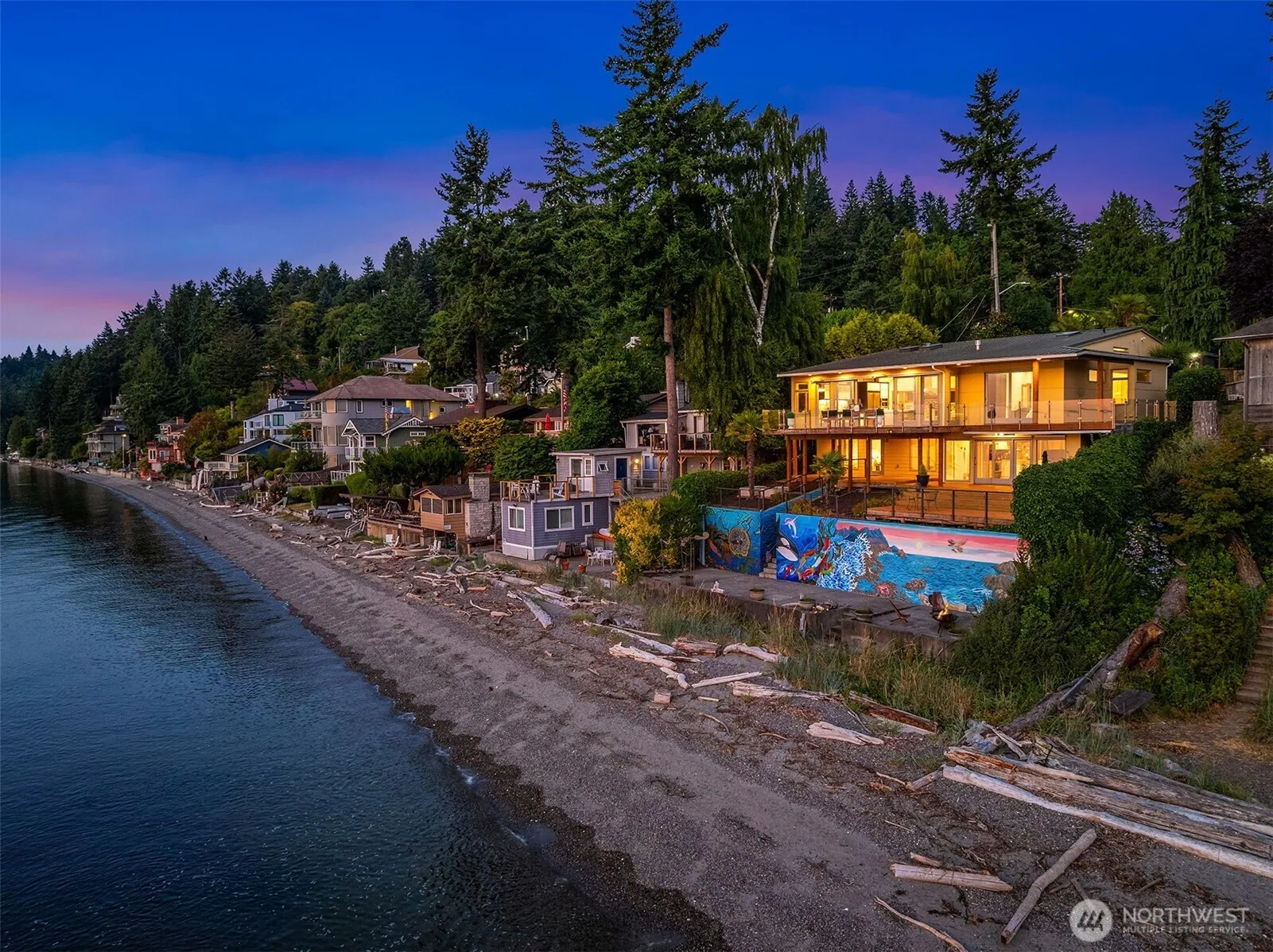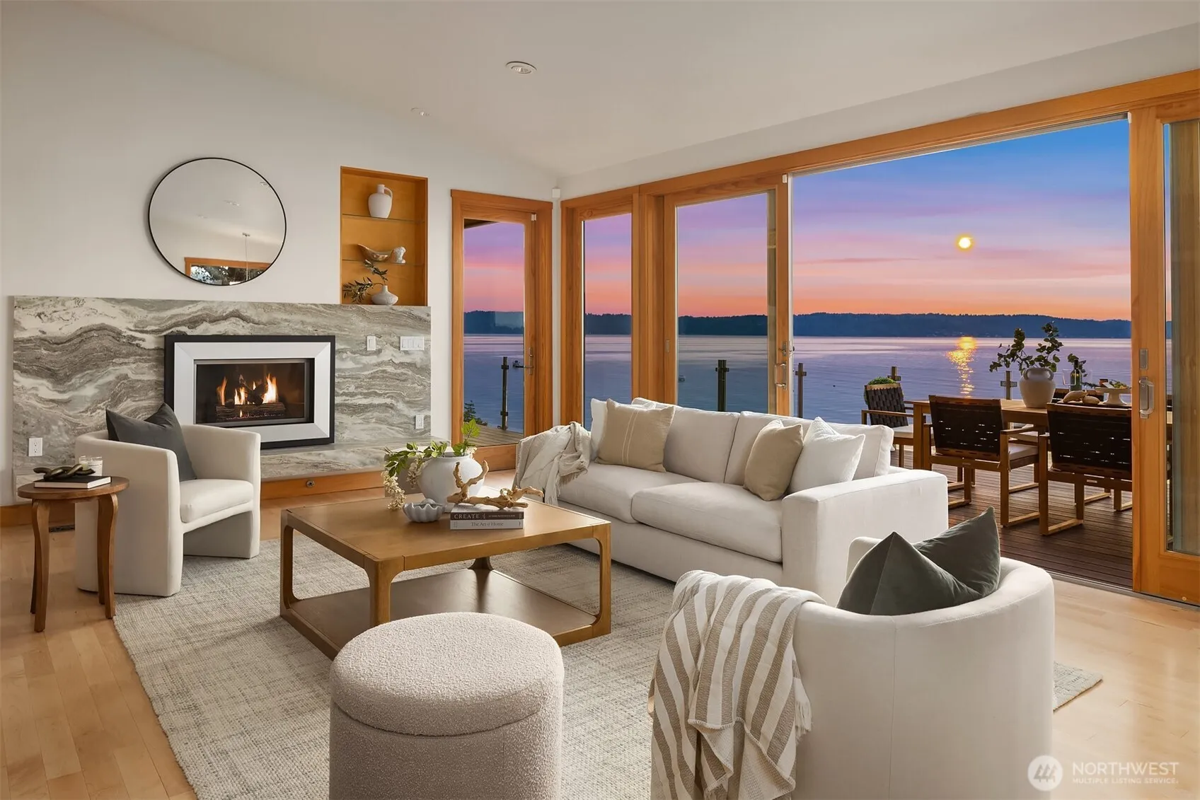 Welcome to the magic of Beach Lifestyle w/this open & airy waterfront haven in the very heart of Three Tree Point. Private from the street thanks to a charming garden courtyard, the house, designed as an inspiring oasis, offers an endless show of colors & wildlife. Walls of floor-to-ceiling doors/windows frame the iconic Pacific Northwest panoramas of sea & Olympics while extending the interior living into layers of decks & patios. Combining functionality & comfort, the home offers a main level floor plan + a full ADU for friends & paying guests. Listen to the gentle waves unrolling on the beach, feel the soft sand under your feet & anchor your boat before you. Rare level access & all parking. A glorious way of living min to all amenities.