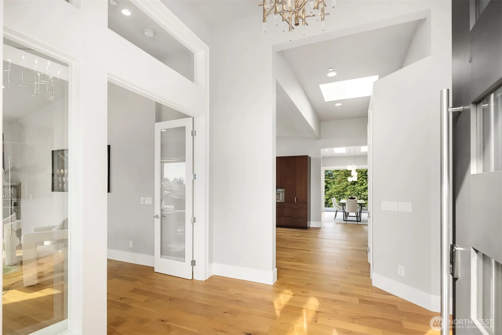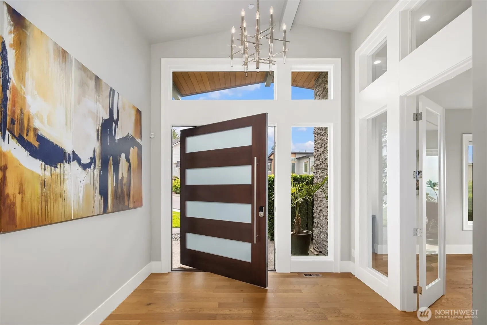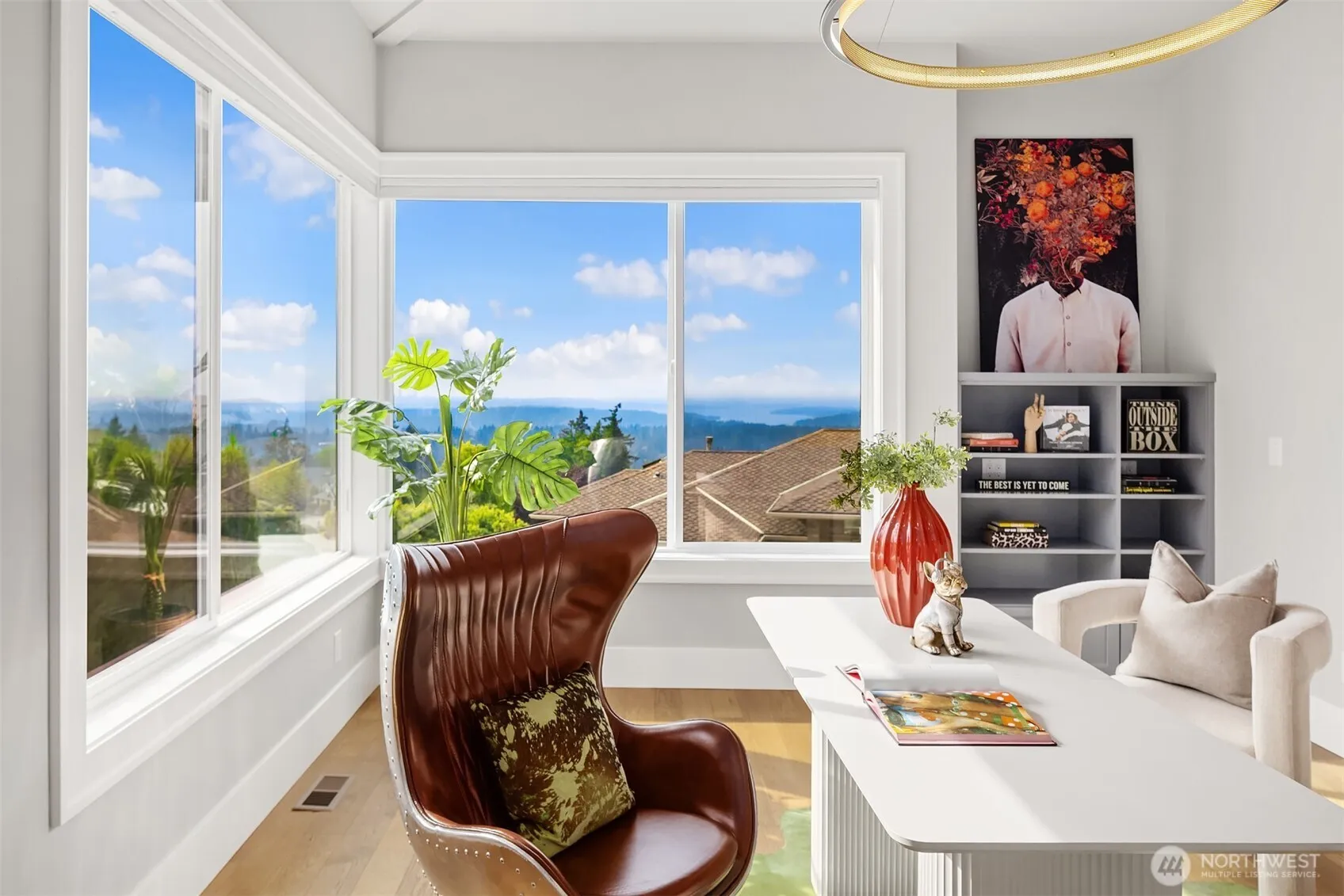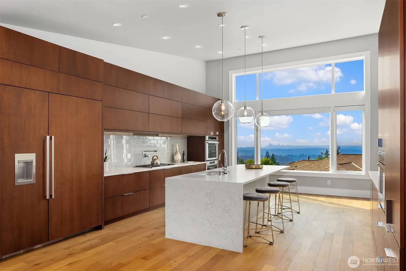 Perched in the hills of Newcastle, this stunning 5,110 sq ft contemporary home offers breathtaking views of Seattle, Lake Washington, and the Olympic Mountains. Designed for multigenerational living, it features two spacious primary suites and a second full kitchen. Vaulted ceilings throughout enhance the open-concept layout, while the gourmet kitchen includes high-end appliances, a large island, and a built-in espresso machine. Enjoy seamless indoor-outdoor living with two covered decks, an outdoor kitchen, BBQ, and TV. Additional highlights include a home theater, whole-house generator, central A/C, and a beautifully landscaped greenbelt lot for added privacy.