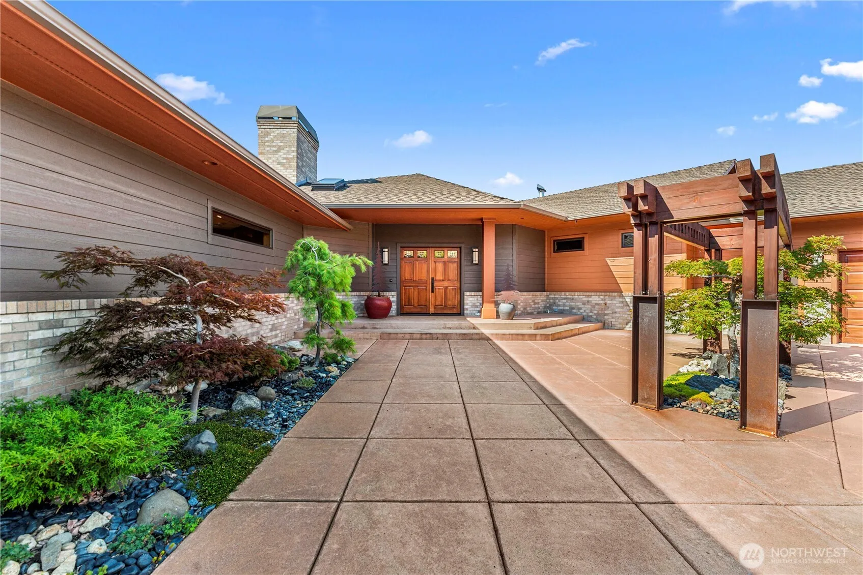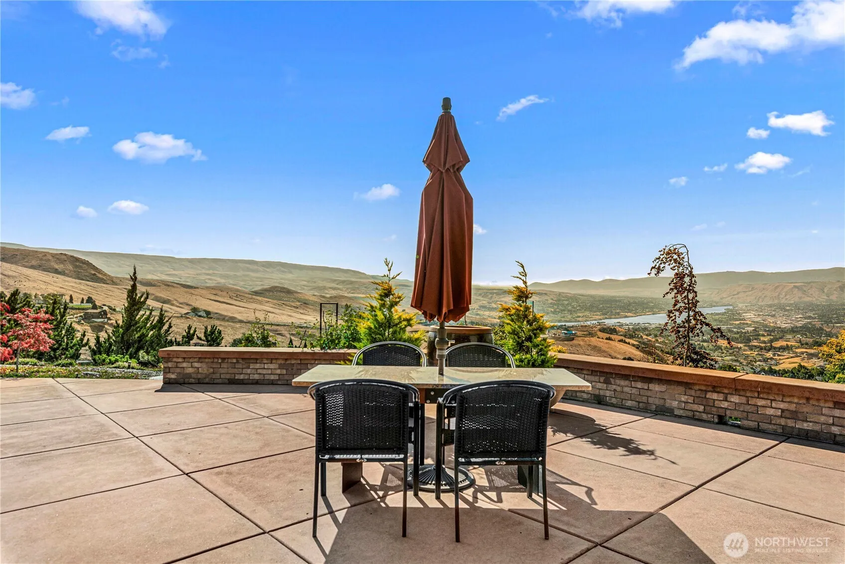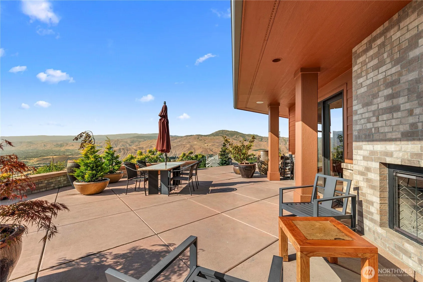 Elegant Helton-built rambler in Sunnyslope with stunning views of the Columbia River and Cascade Mountains. Perched high on the hill, this home features quality construction with Hardie Plank siding and a long-lasting Presidential roof. Professionally landscaped for low maintenance, the expansive wraparound patio is ideal for entertaining, with a built-in outdoor fireplace protected from the elements. Inside, the gourmet kitchen includes a commercial-grade Earthstone wood-fired oven, 6-burner cooktop, double ovens, custom cabinetry, and dual pantries. The spacious primary suite offers a serene retreat with built-in furnishings, a cozy fireplace, and elegant design throughout. A truly special setting and exceptional home.