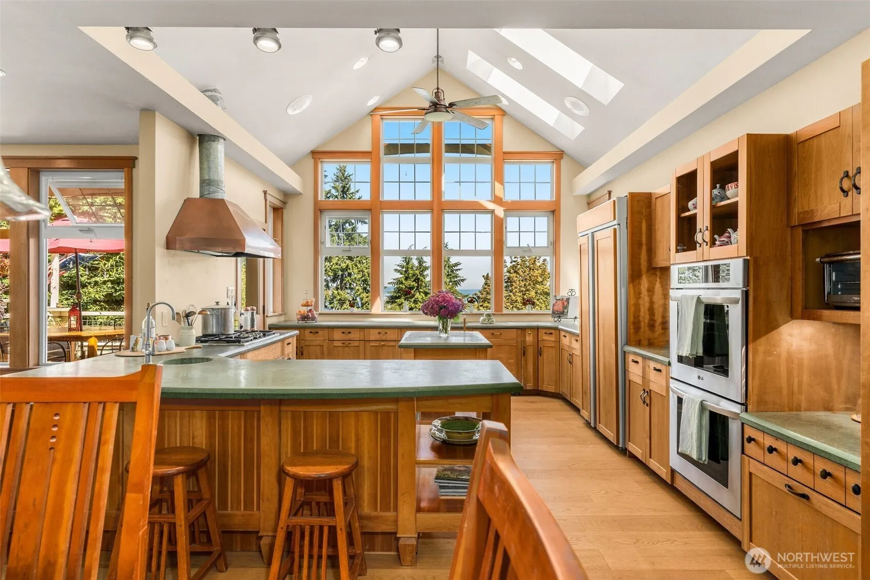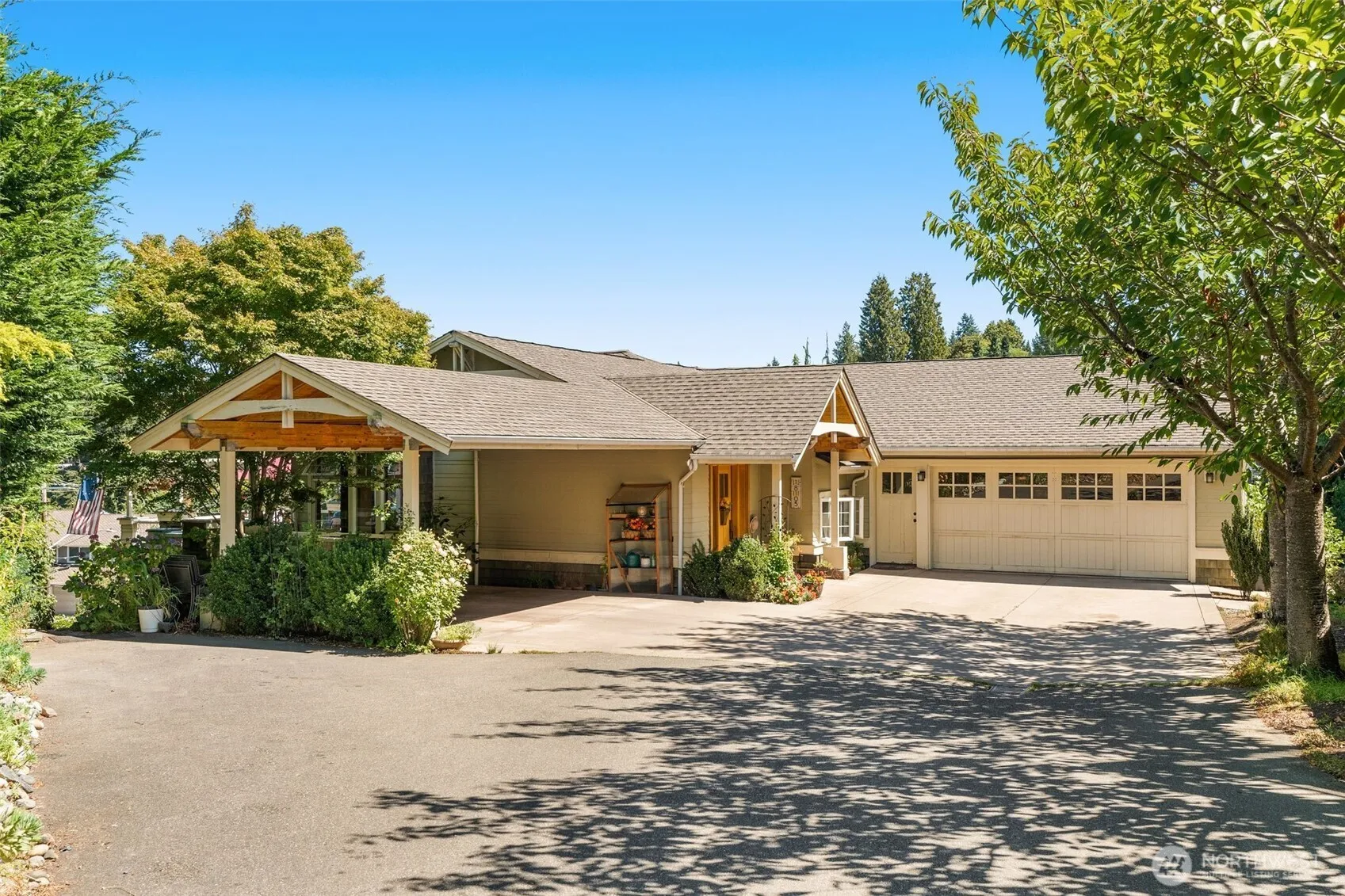 First time on the market! Designed & built by an architect owner this custom craftsman is a jewel, tucked on a dead-end st & perched above Olympic View Dr. The spacious open floor plan has a grand room & kitchen w/ vaulted ceilings, huge windows, views of Brown’s Bay & Whidbey. Upper level main floor also boasts a formal living rm, primary w/ walkin closet & ensuite bath & mud rm leading to oversized garage. Follow the sunlit staircase down to 4 bed rms, den, rec rm & a permitted 850 SF ADU which has 3 yrs rental history & can flex-could be part of the house or 1 (or 2) bed rental. Features: radiant infloor heating, central vacuum, builtins, comfortable deck & a masterfully landscaped garden w/ paths, patios, views & Edmonds in Bloom vibes.
