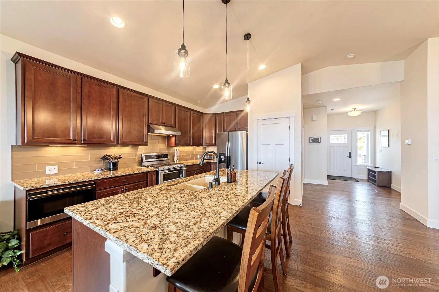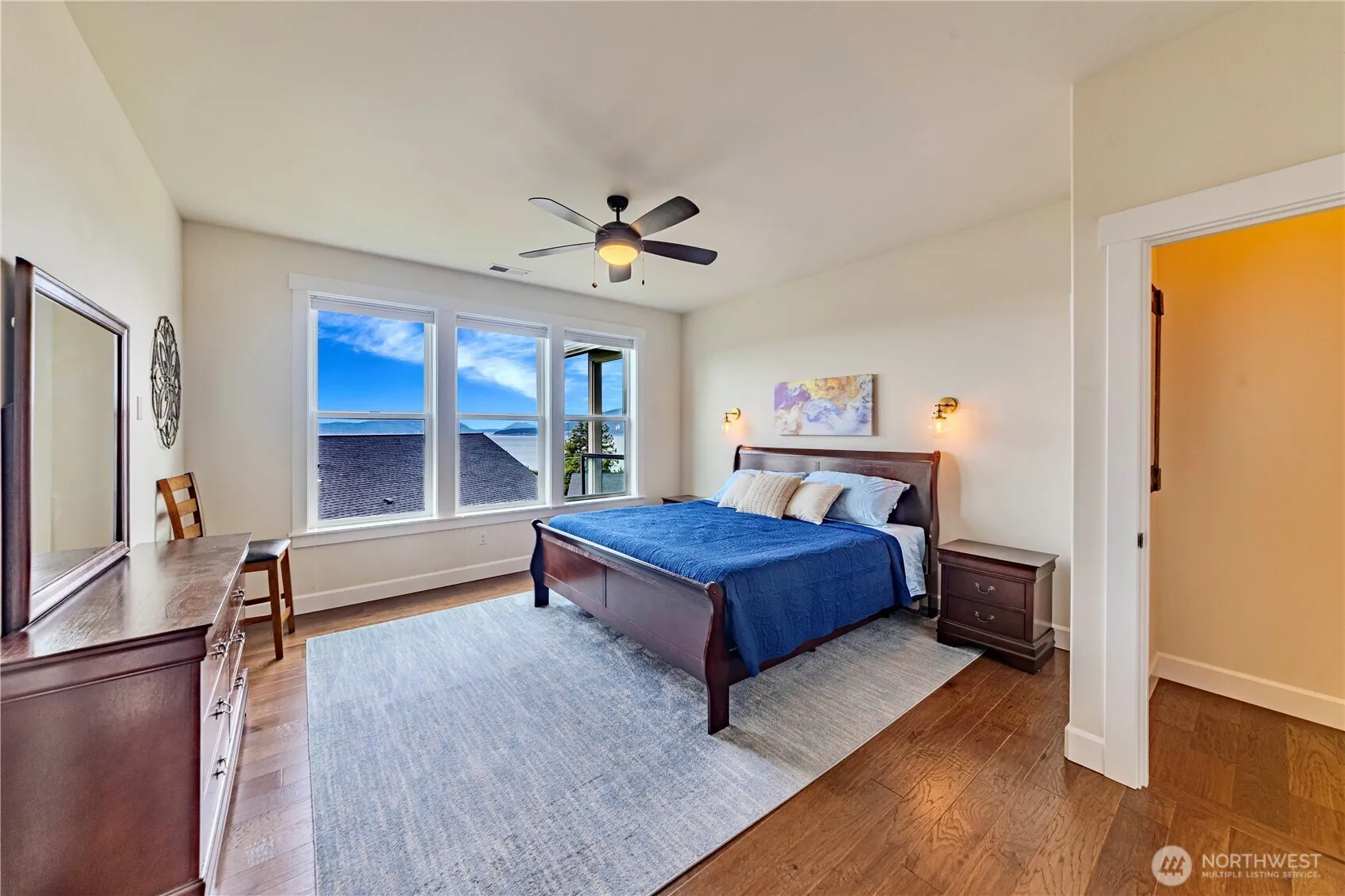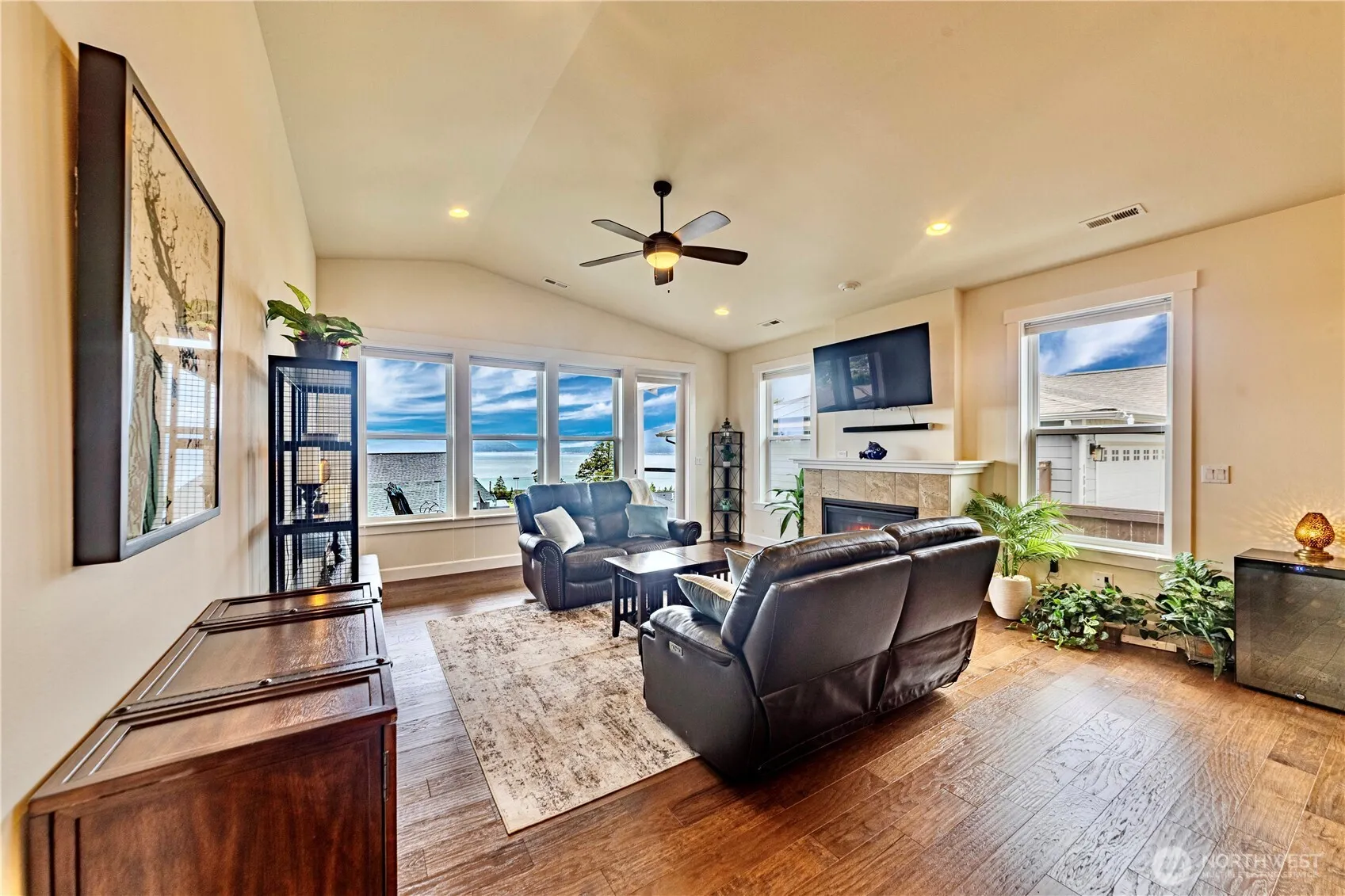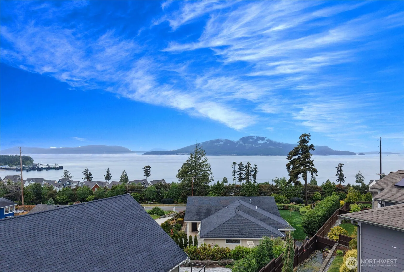 Breathtaking views of mountains & waters of the Puget Sound, transform daily life into an endless getaway. NO STEPS MAIN LEVEL LIVING: gourmet kitchen, center island, dining, living, covered deck with infinity glass, primary suite, bed/office, 3/4 bath, laundry & 2 car garage. Downstairs: discover flexibility with 2nd living room, covered patio + views, 2nd kitchen, media/office, 2 add’l bedrooms, large 2nd laundry & full bath —ideal for multi-gen living, guests or possible rental (Buyer to verify). Open-concept design is complete with wide-plank hardwoods, AC, tankless H20 htr, 23 solar panels, EV outlet & more. Plenty of storage. Enjoy the landscaped, irrigated & fully fenced yard. Moments away from local amenities, ferry & lush parks.