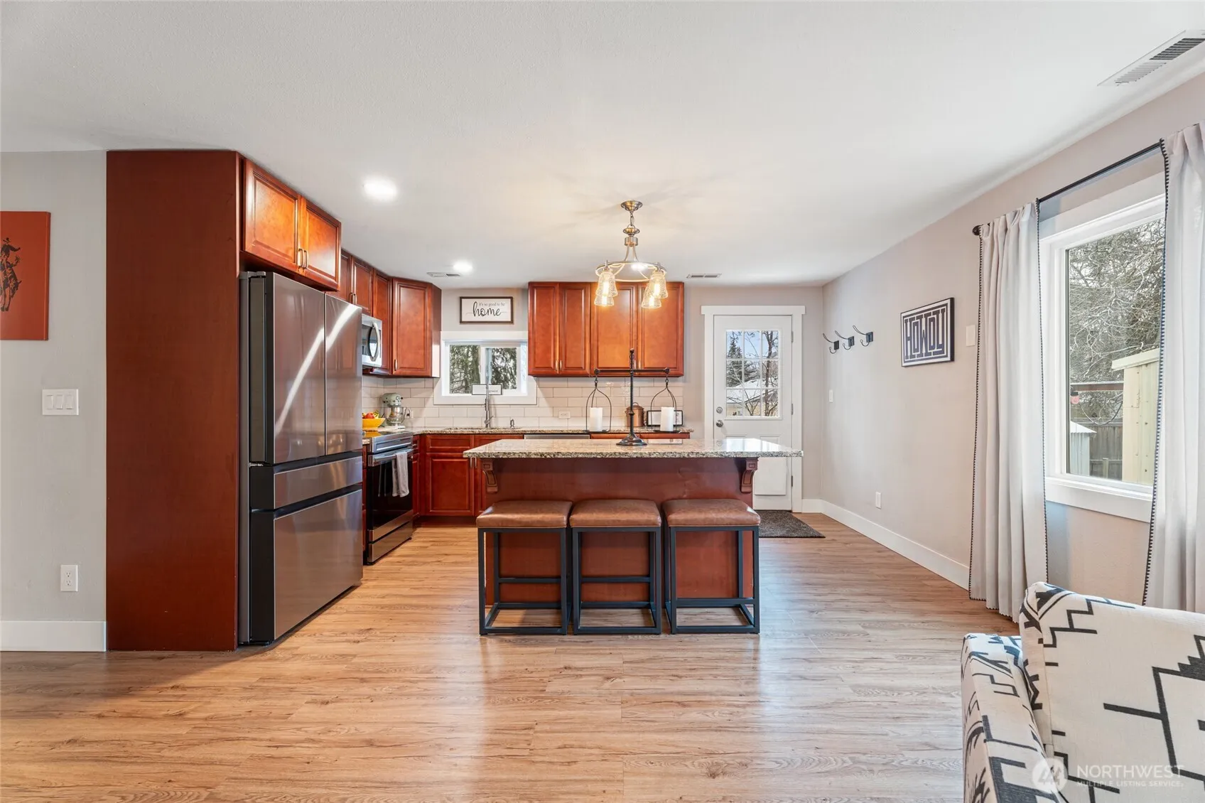 This lovingly maintained 5-bed, 2.5-bath home on a rare double lot in Waitsburg offers both space and soul. With a layout ideal for multigenerational living, working from home, or guests, this home meets you where you are. The downstairs provides 3 bedrooms, a cozy living space, and laundry. Upstairs offers a bright and open kitchen, spacious living area, and the primary suite with a private half bath. Enjoy quiet mornings or joyful gatherings on two decks and make the most of a fenced backyard built for connection and play. Seller is open to negotiation – bring your vision!