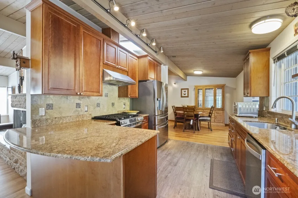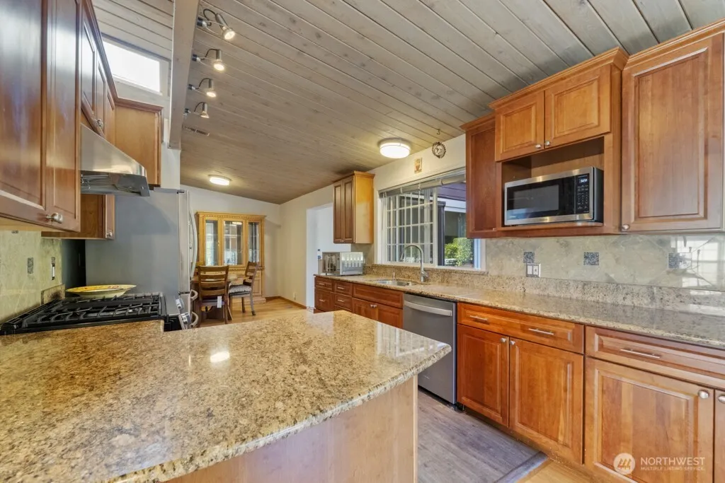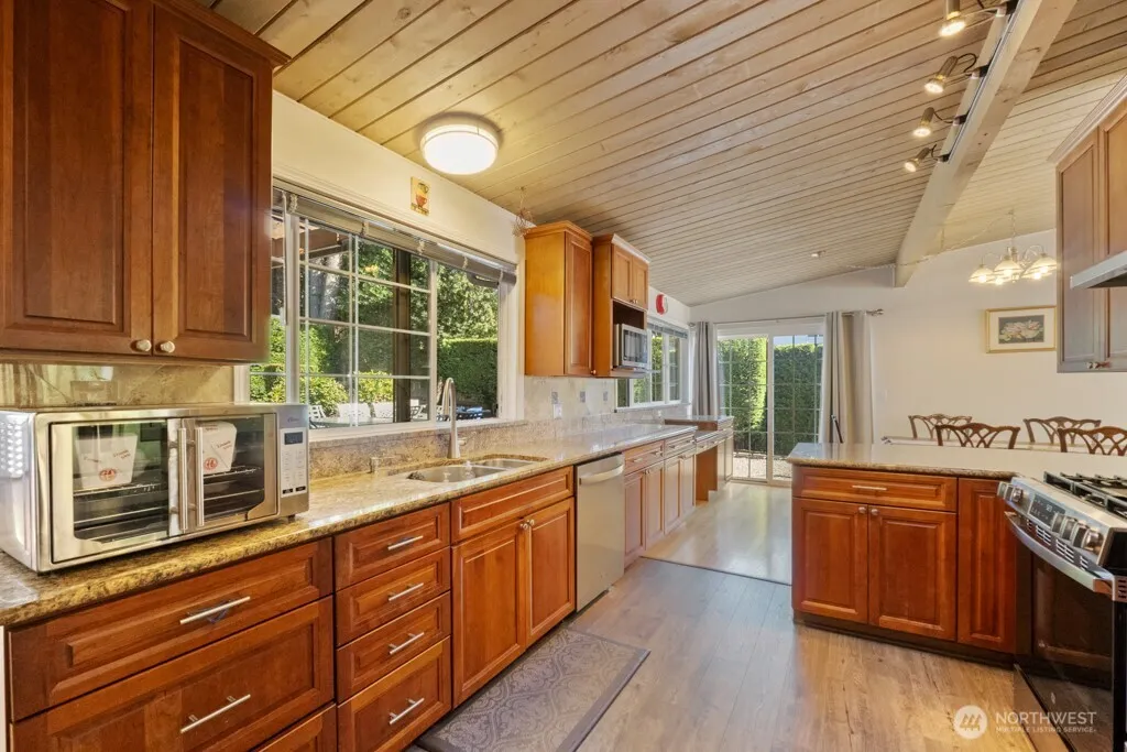 4 bed & 3 bath rambler with two primary suites, and a permitted mother-in-law apartment with 1 bed & 3/4 bath, fully equipped with a gas stove, refrigerator, dishwasher, microwave and washer/dryer. Nicely remodeled Mercer Island home with cherry kitchen cabinet, granite slab countertop throughout. SS appliances that include a new gas stove. Hardwood flooring in most bedrooms and living & dining rooms. Primary suite with a walk-in closet and a double-sided gas fireplace shared with adjoining family room. Cathedral ceiling, skylights & extensive windows give plenty of natural light. Extensive decking. Low maintenance yard. Lots of off-street parking. A/C. Easy access to I-90. Walking distance to schools and parks. Bus stop nearby.