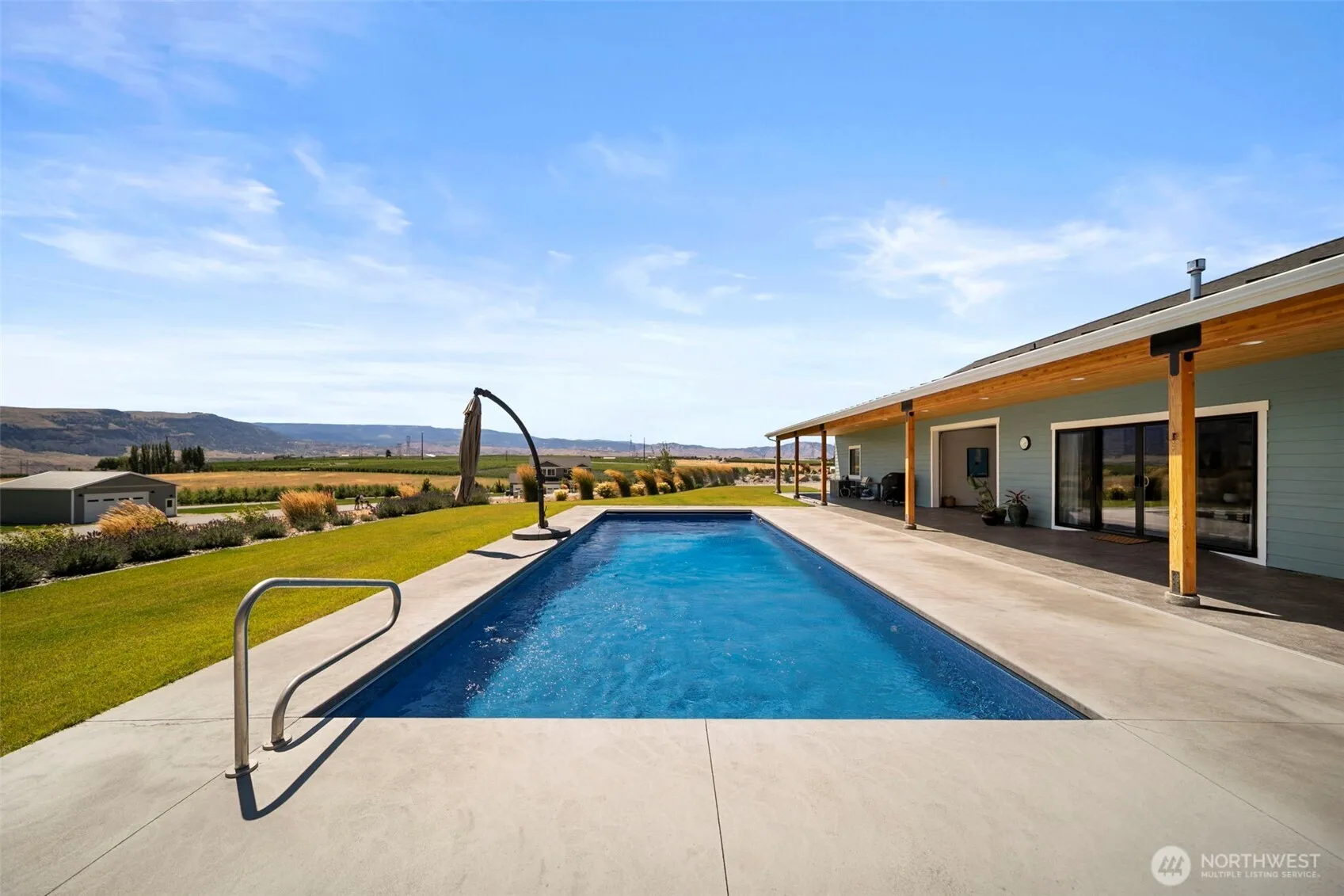 Modern design meets artistic flair in this stunning four-bedroom home. The living area connects to the garage with an enclosed breezeway, offering endless possibilities. Hosting garage doors that open to the dining and pool areas, which enhance the flow between indoor and outdoor spaces. The primary suite features a tile shower, dual sinks, and a spacious closet. Entertaining is effortless in the kitchen, which boasts a large island, quartz counters and double ovens. The 4th bedroom, a 3/4 bath, and a storage room are located in the west wing. Enjoy breathtaking sunsets from the patio & pool. This property offers RV parking & stunning views from every angle!