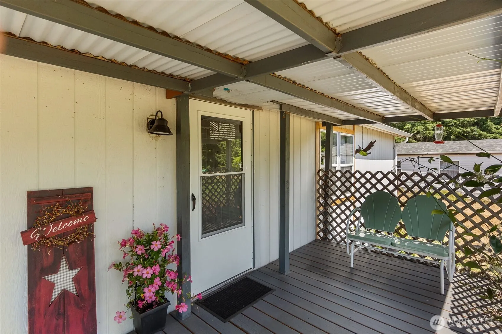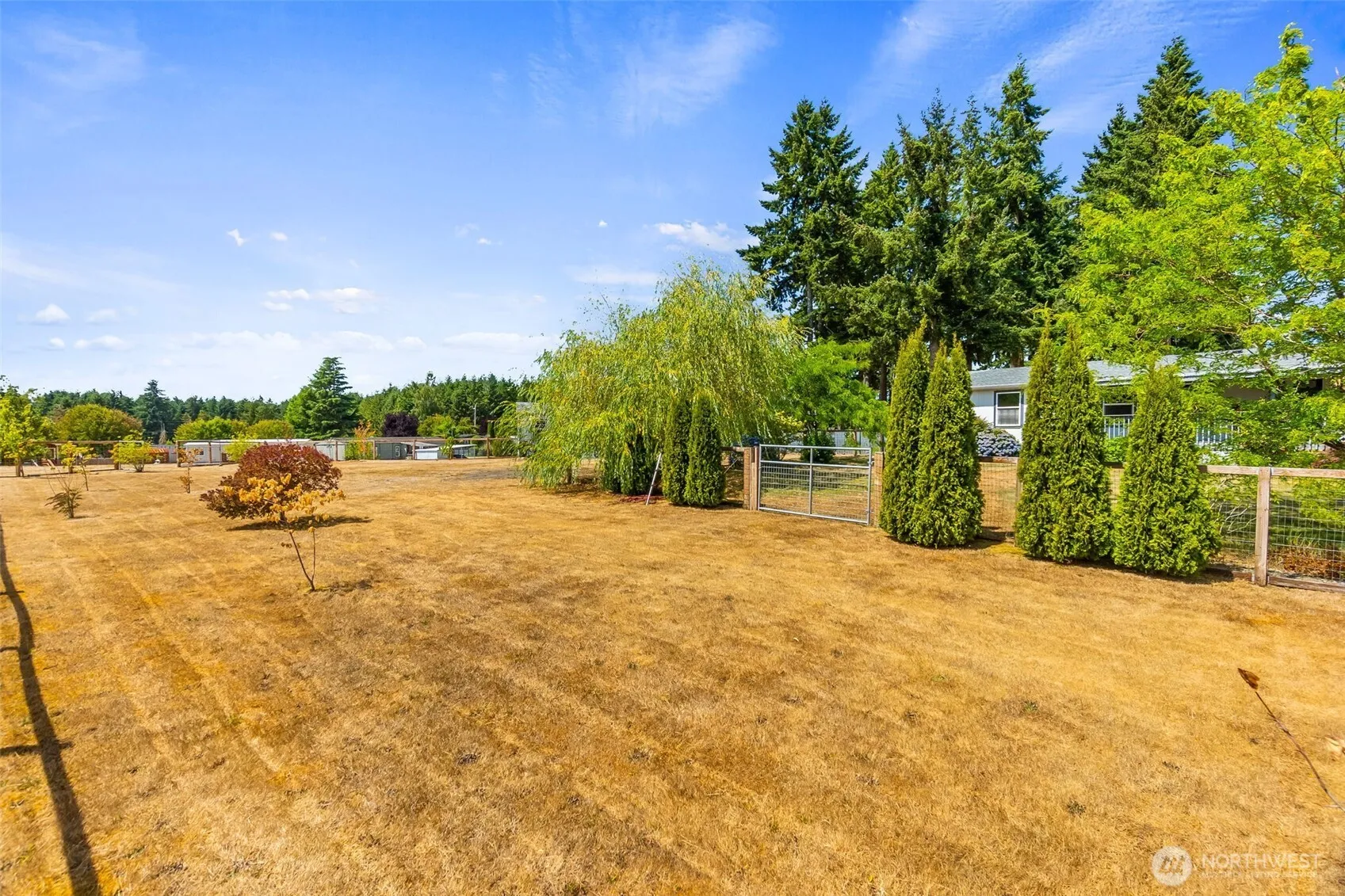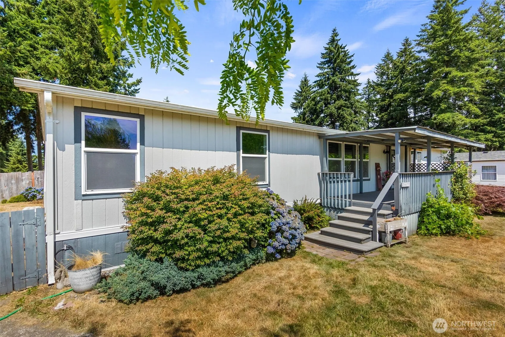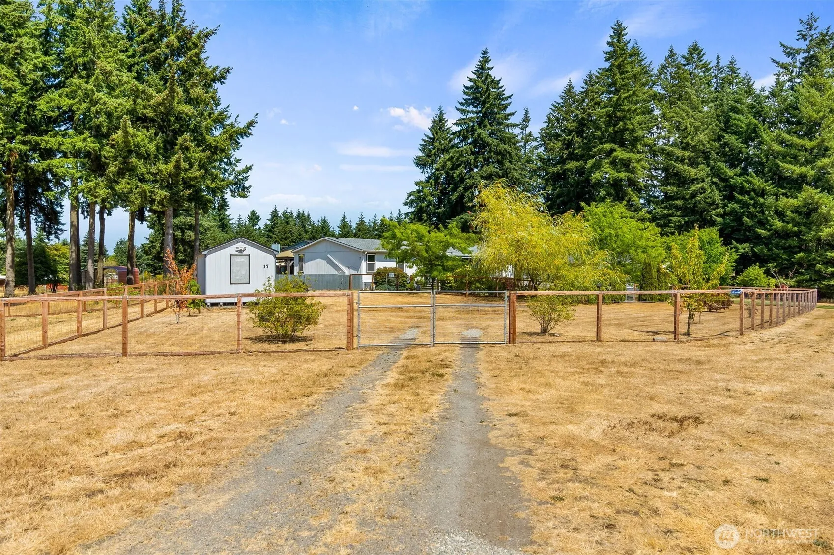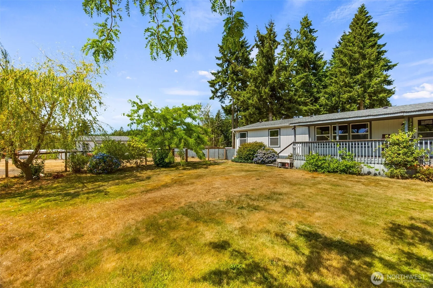 Beautiful MF home built in 2000 on unique park acreage. Kitchen features newer appliances, and deep sink. All 3 spacious bedrooms have walk-in closets. Upgraded outlets w/built-in USB ports. Elegant ceiling fan and light fixtures. Cozy propane fireplace. Large covered front porch and private patio with shady gazebo. New roof in 2022 & exterior wash station with hot/cold water. Fully fenced with pet yard and sprinkler system. Garden shed has power and lighting. Fruit trees include plum, fig, and pear. Space rent includes water/septic. Convenient rural location near Grand Mound, between Olympia and Centralia.