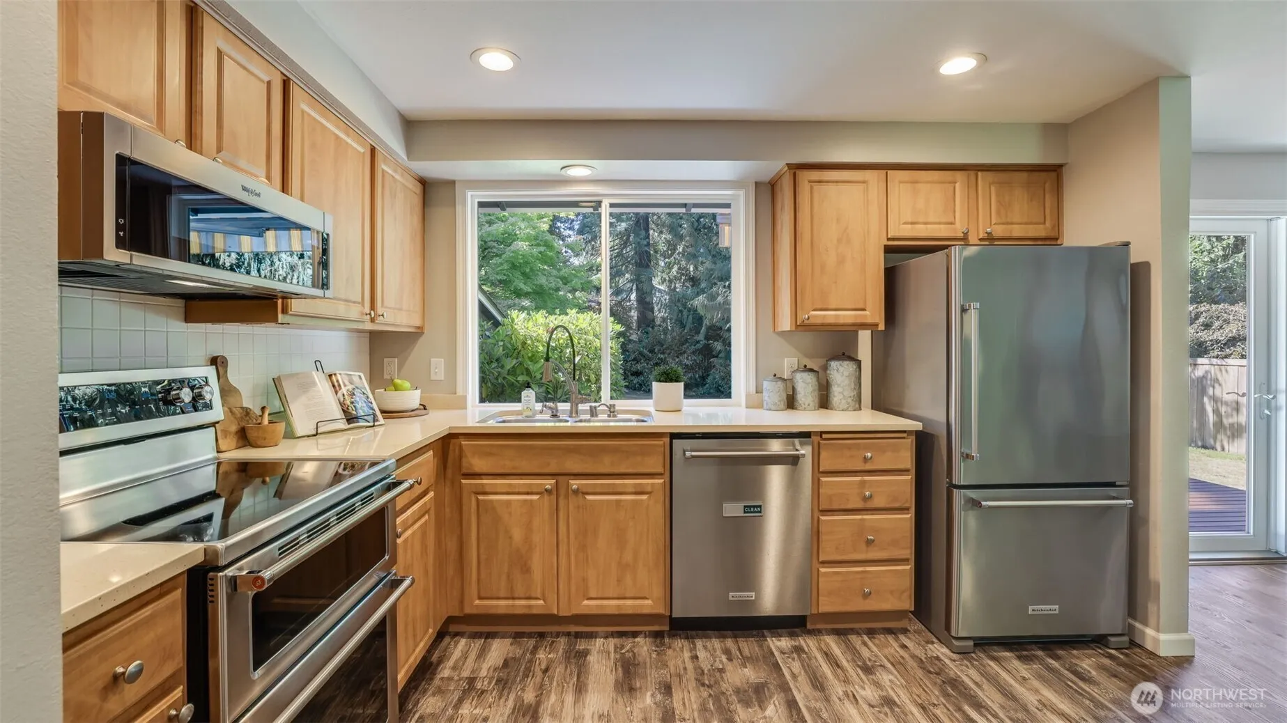 Charming and lovingly maintained, this sweet Sammamish home is sure to steal your heart! Thoughtful updates include kitchen appliances, new flooring and trim, new furnace, mini-split in sunroom, new vinyl windows, and interior and exterior paint. A removed kitchen wall enhances the flow into the dining area, brightening the circular main floor. French doors open to the inviting and serene back deck with a stylish retractable awning – ideal for entertaining. Upstairs features an ensuite primary, two additional bedrooms, and a full bath. Downstairs offers a rec room and finished sunroom – the perfect home office or studio space. Level, sunny, fully fenced back yard, 2 car garage, friendly neighborhood, and top-rated schools. Welcome home!