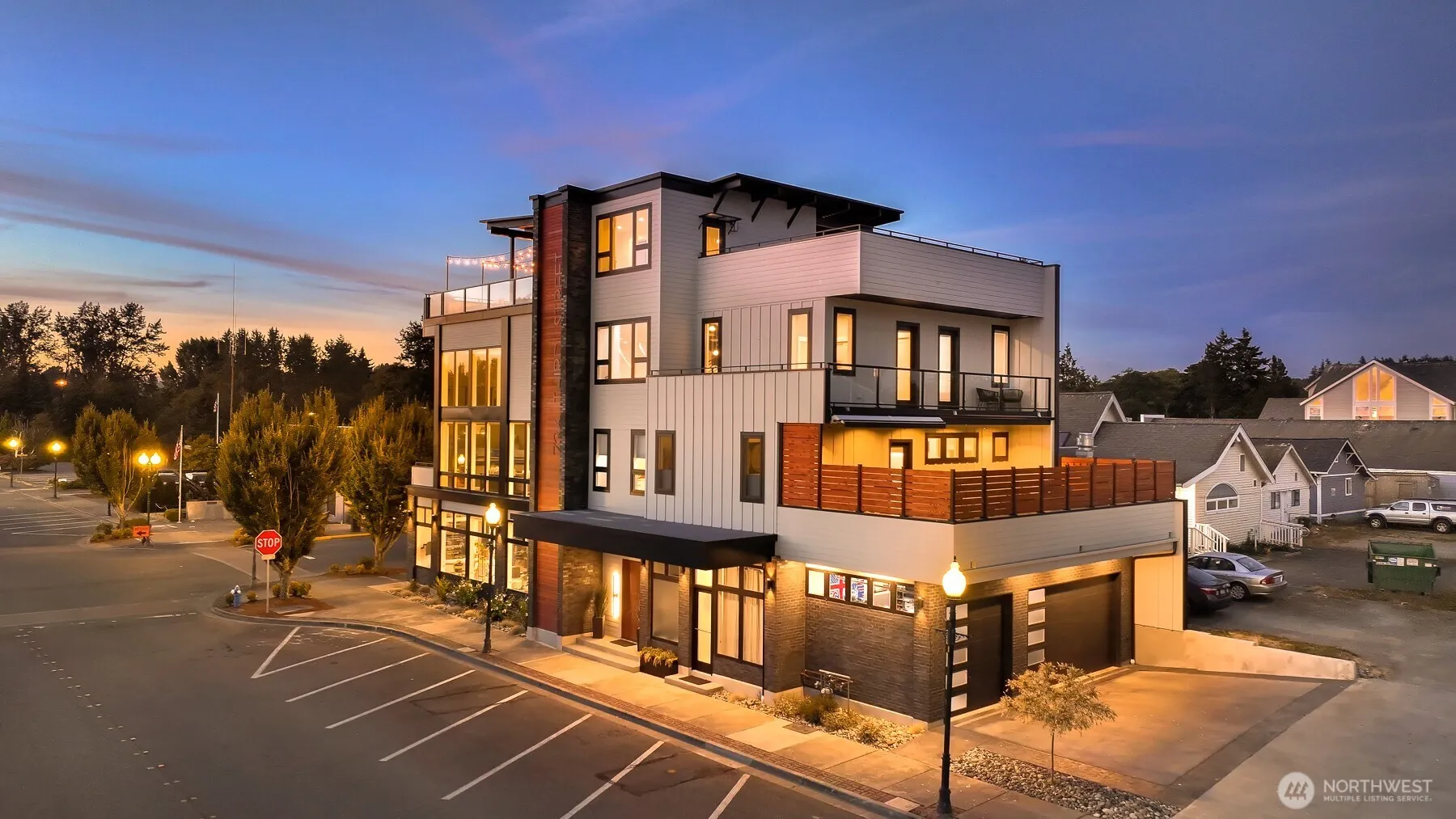 One of one. Striking contemporary mixed use building in the heart of the seaside town of Blaine. Intentionally designed to maximize the natural light & breathtaking views, run your business or rent out the 1,050 sq ft street level commercial space just steps from your upscale 4,841 sq ft home. The residence lives like a modern single family 3 bedroom home & features an elevator, 40’+ atrium with floating stairs, private 3 car garage + massive rooftop deck (1 of 4) with 360• views of the bay, mountains & White Rock city night lights. Open concept design highlighted by wall of stacking pivot glass doors, 20’ ceilings & a stunning floor to ceiling stainless fireplace. Strategic location 45 minutes from Vancouver, BC & 90 minutes to Seattle.