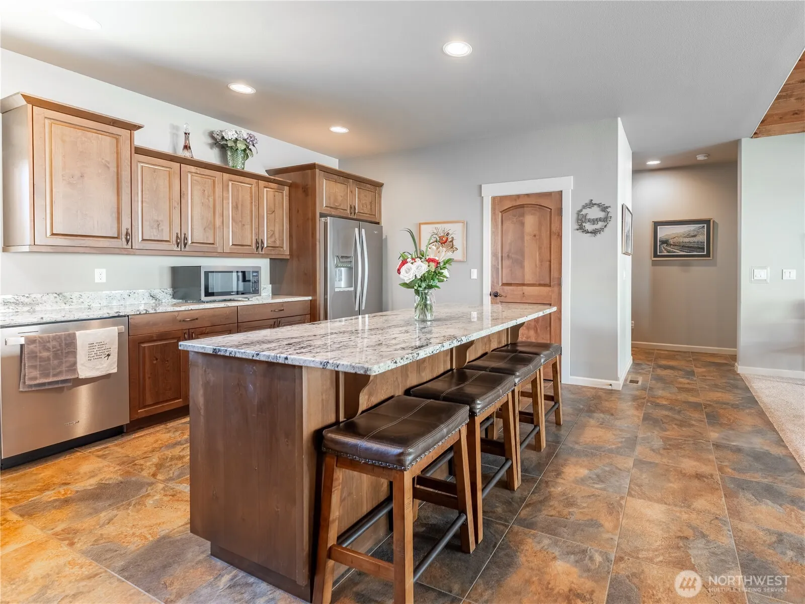 You’ll find quality craftsmanship and pride of ownership throughout this gorgeous one level home. An impressive stone fireplace surround and vaulted tongue & groove ceilings with rustic beam accents are just a few features that capture your attention. A cook’s preferred layout in the kitchen with a spacious island, granite counters, newer stainless appliances and rich alder cabinetry. The split layout showcases the primary suite with a tile walk-in shower, dual sinks and a walk-in closet on one end of the home and 2 bedrooms on the opposite end. Enjoy BBQ’s and entertaining on the back patio and warm up on chilly nights in the hot tub. Simple, low maintenance backyard landscaping, irrigation water, mountain views and a 3 car garage.