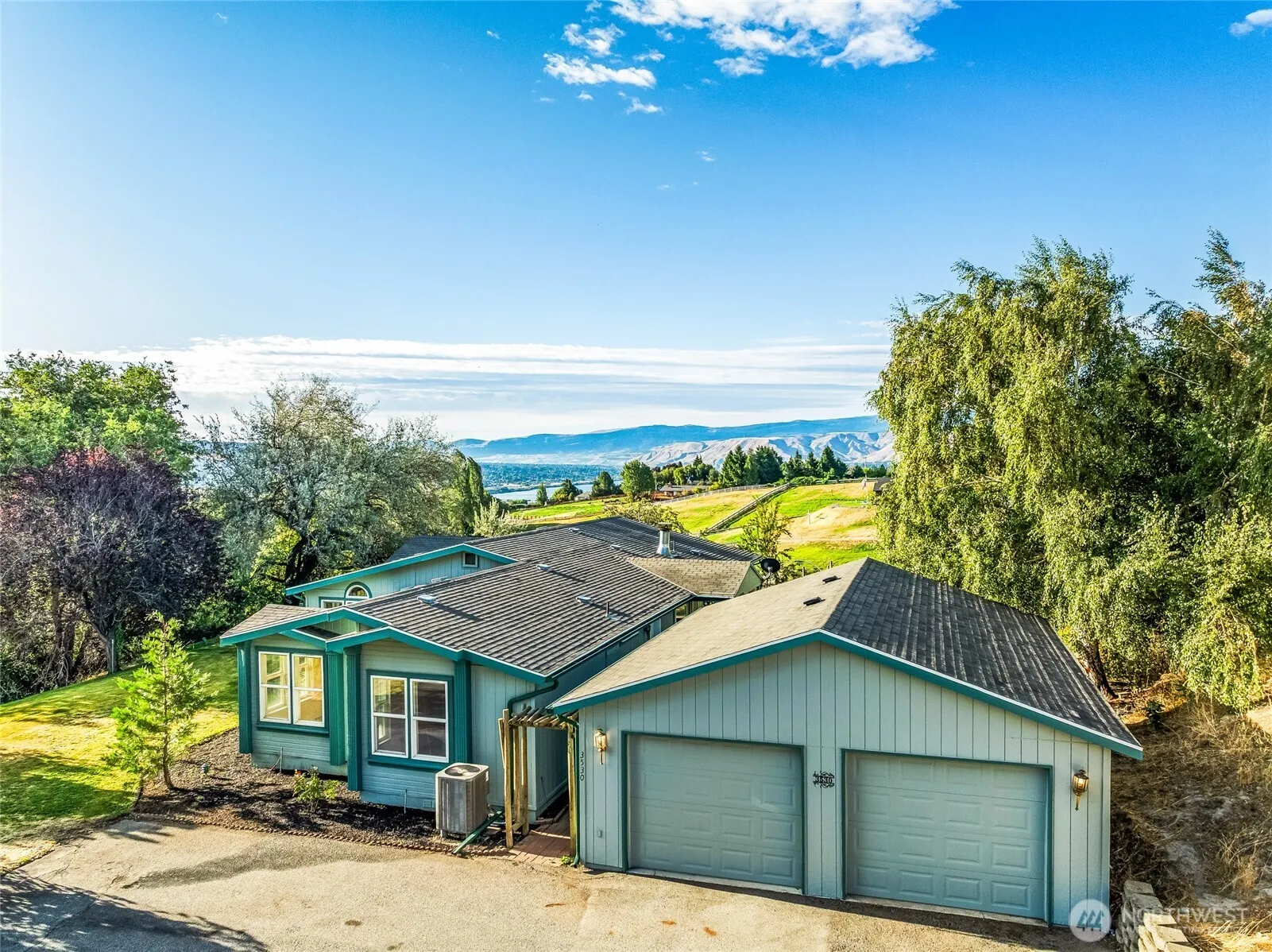 Nestled in the rolling hills of Sunnyslope this property offers the best of both worlds, combining country living with convenient distance to services. Lovely grounds, large .71 acre irrigated lot and lots of parking. The home is very spacious featuring 1944 square feet, 4 bedrooms, and 2 bathrooms. Laminate wood floors, wood burning fireplace. Primary suite features double sinks and shower, 2 walk in closets. Covered deck with river view and large garden area. Detached double car garage. Beautiful setting. Newer heat pump. Recent improvements include all new interior paint and new bedroom flooring. Fresh paint on exterior decks. New 30 year composition roof will be installed prior to closing